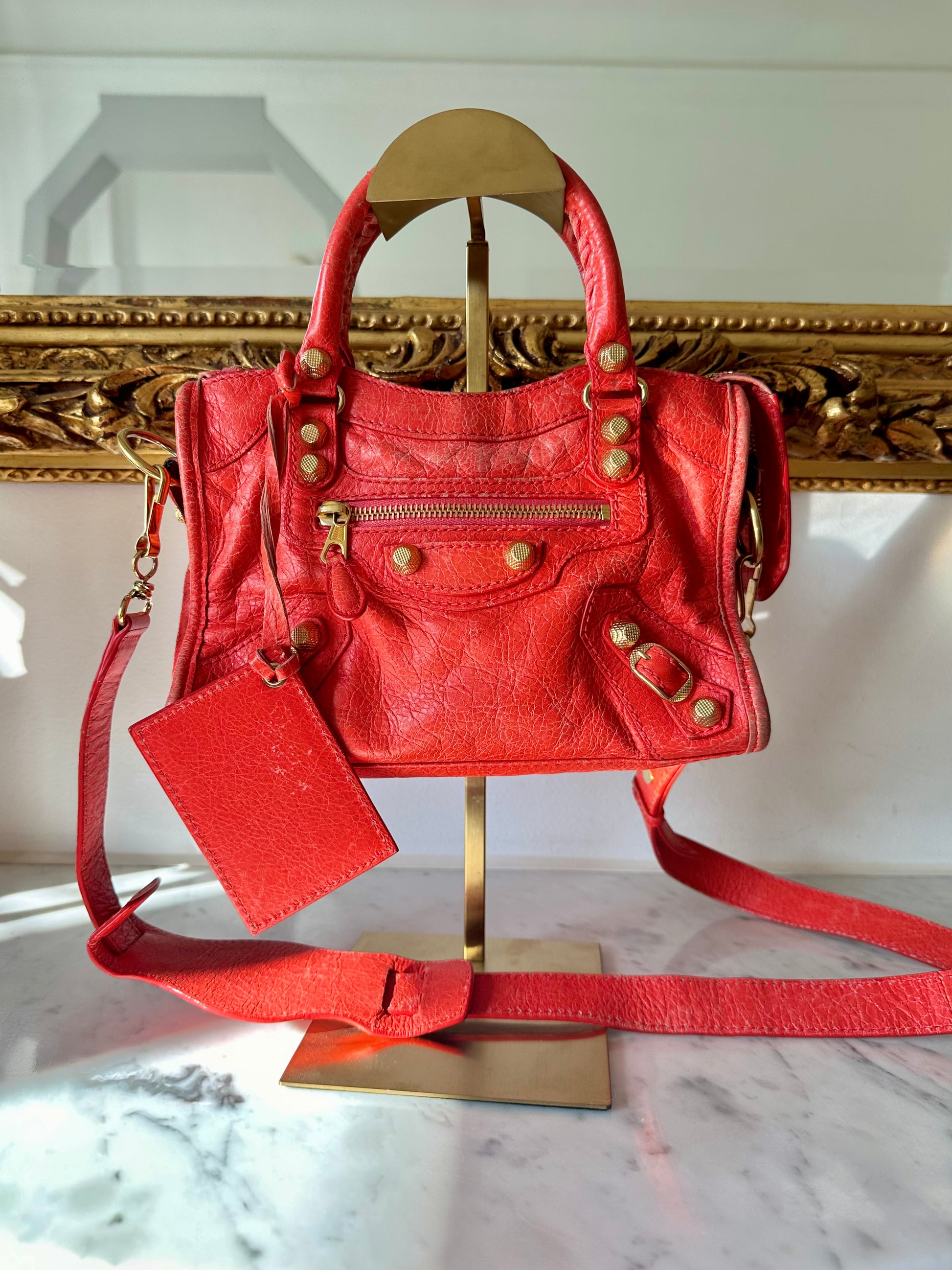 This mini City bag is made out of orange lamb leather, and features gold coloured studs. The colour is hard to capture on photo, so please look at the several photos. It looks more red in some, but it’s actually a fun vibrant orange, bordering pastel orange.