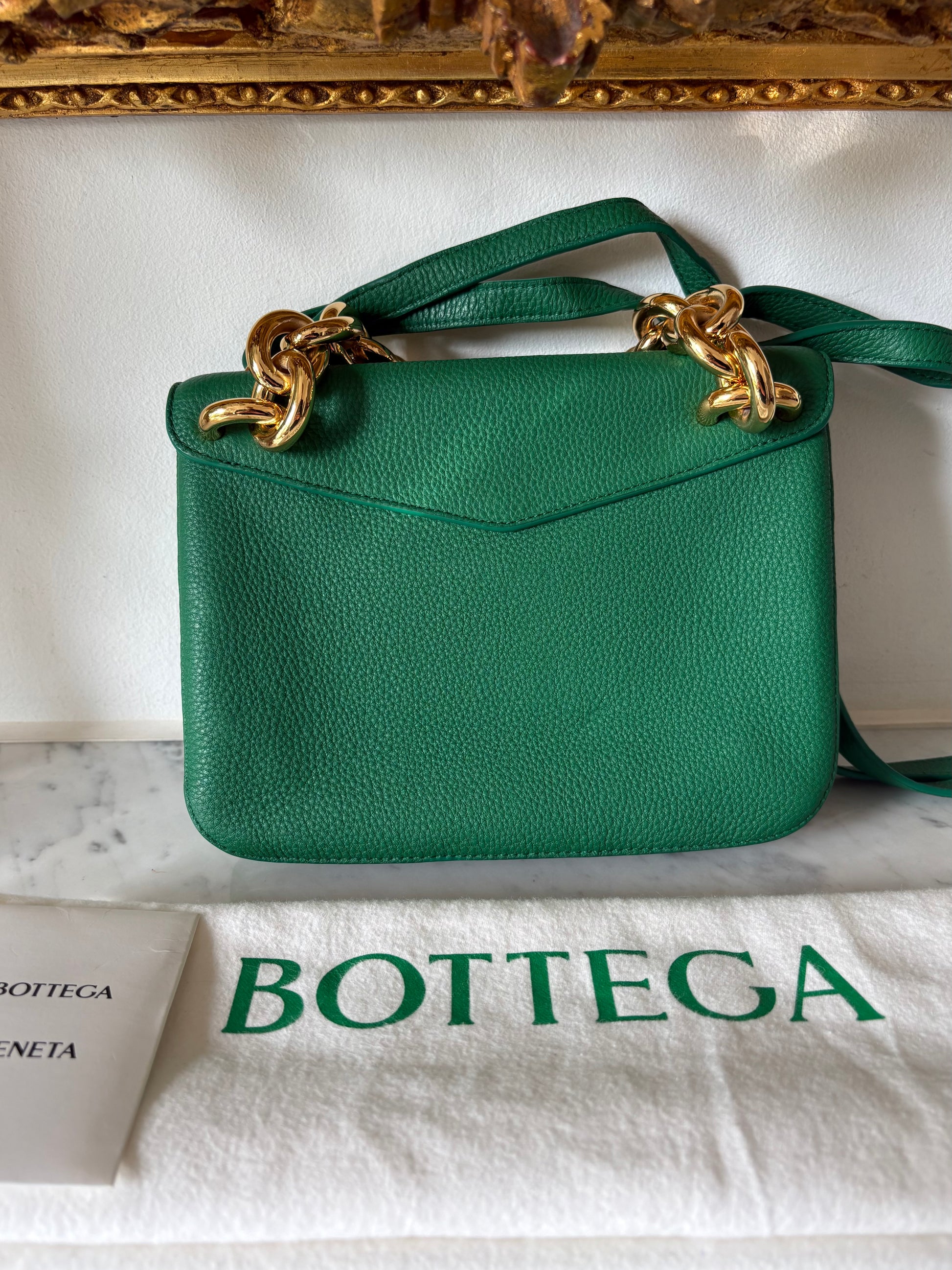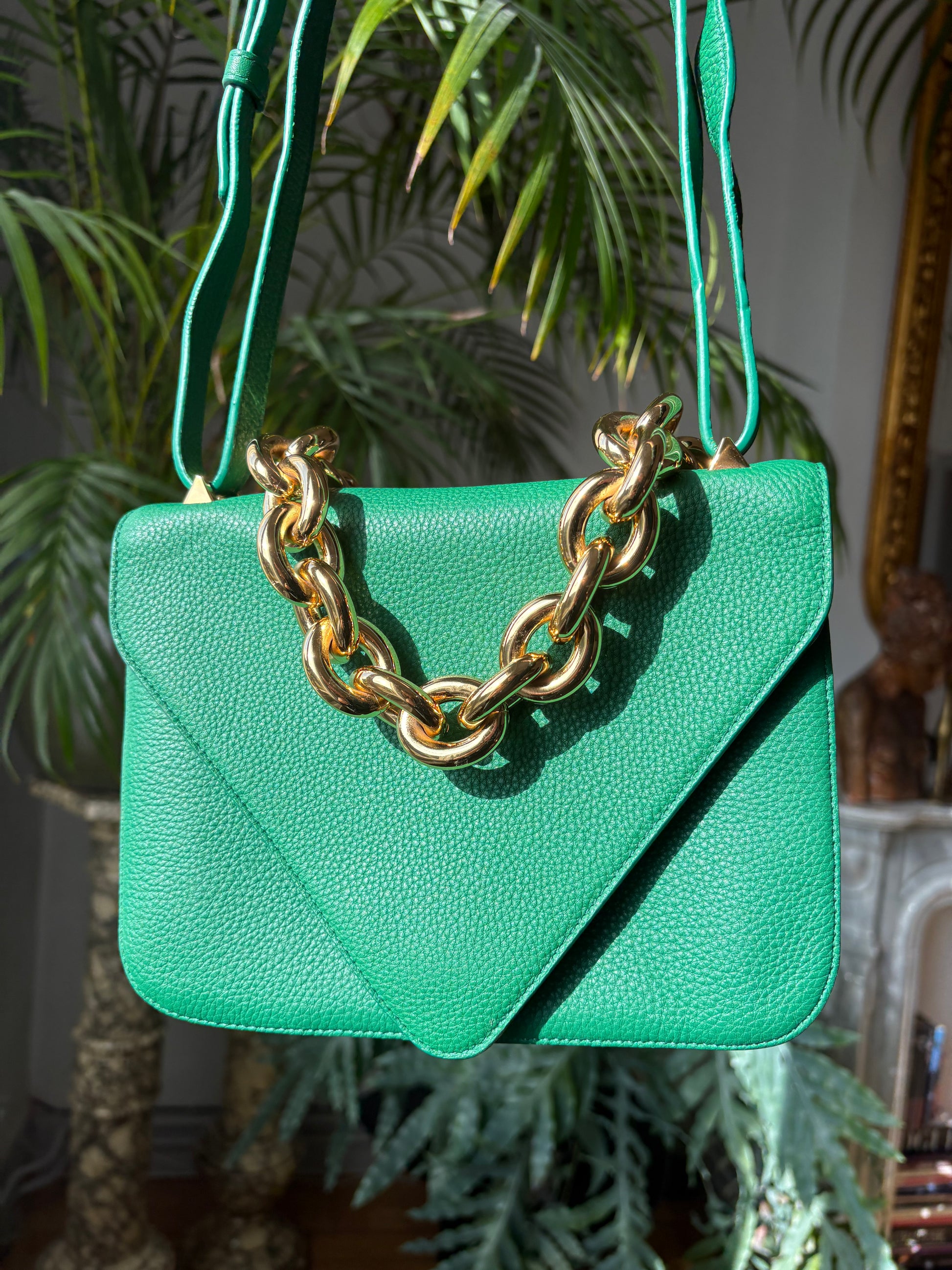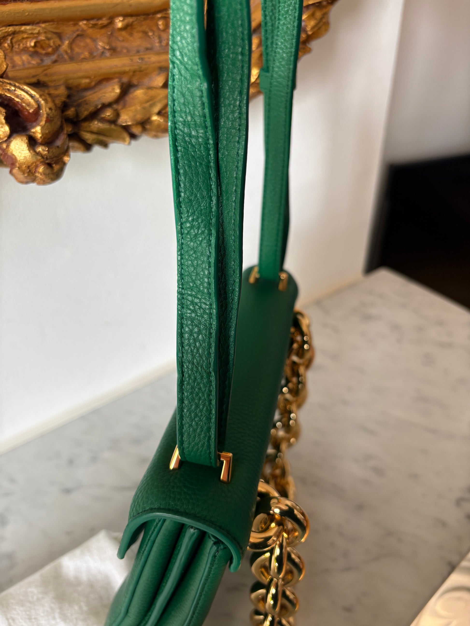 The pebbled grean leather is beautifully complemented by the thick gold chain. The chain can be worn in different ways. The strap can be worn double or single, for shoulder- or crossbody wear.