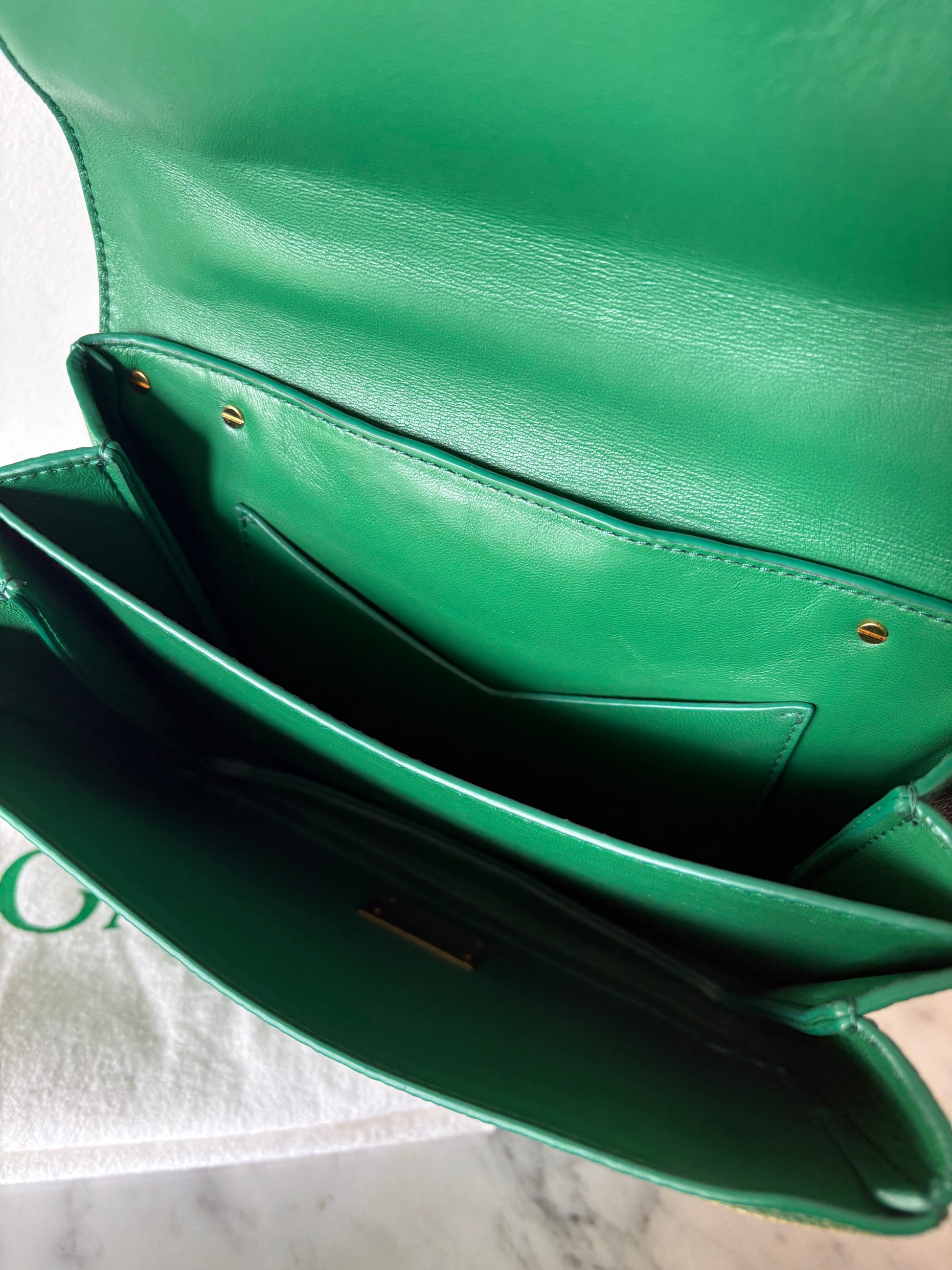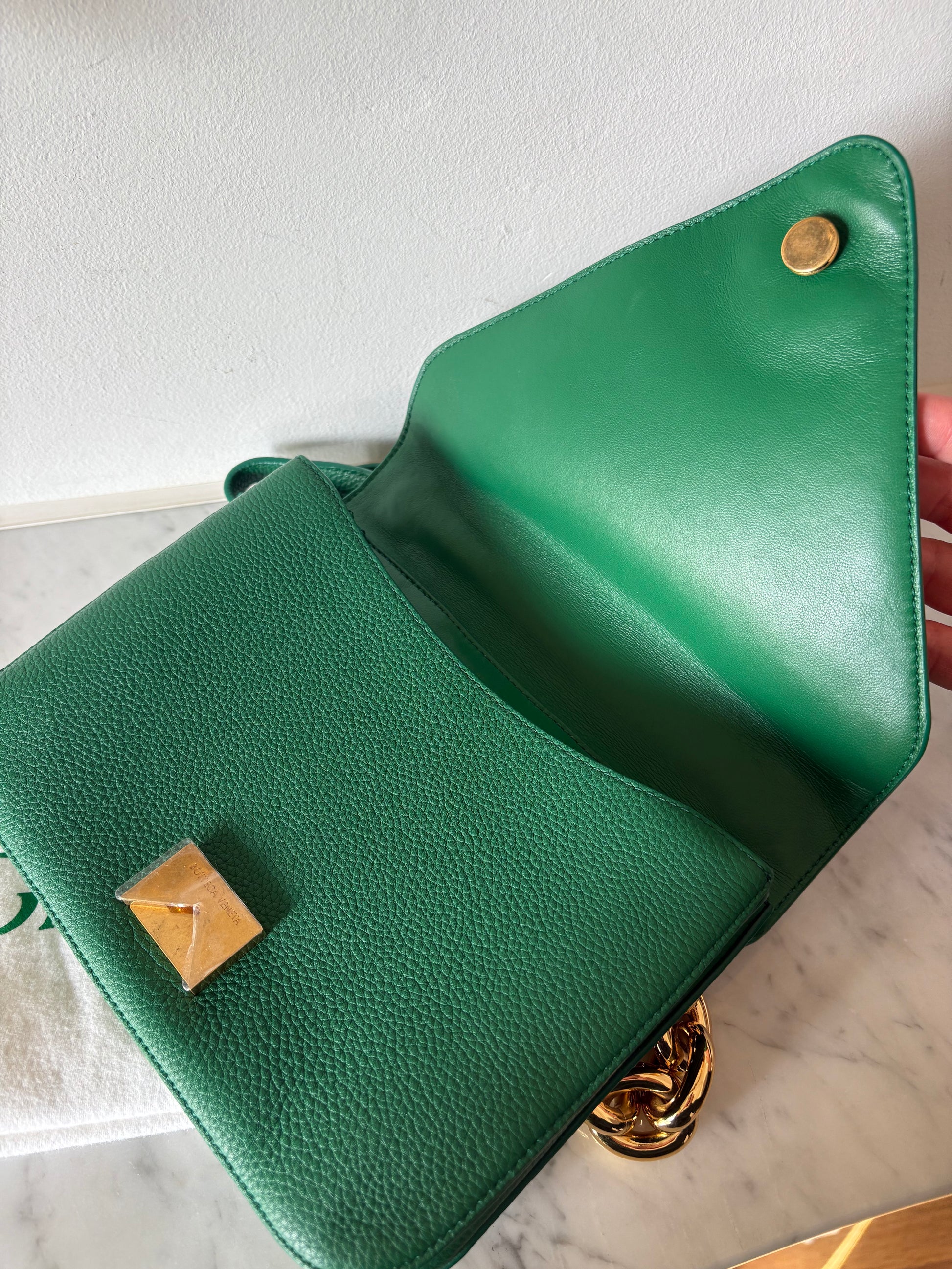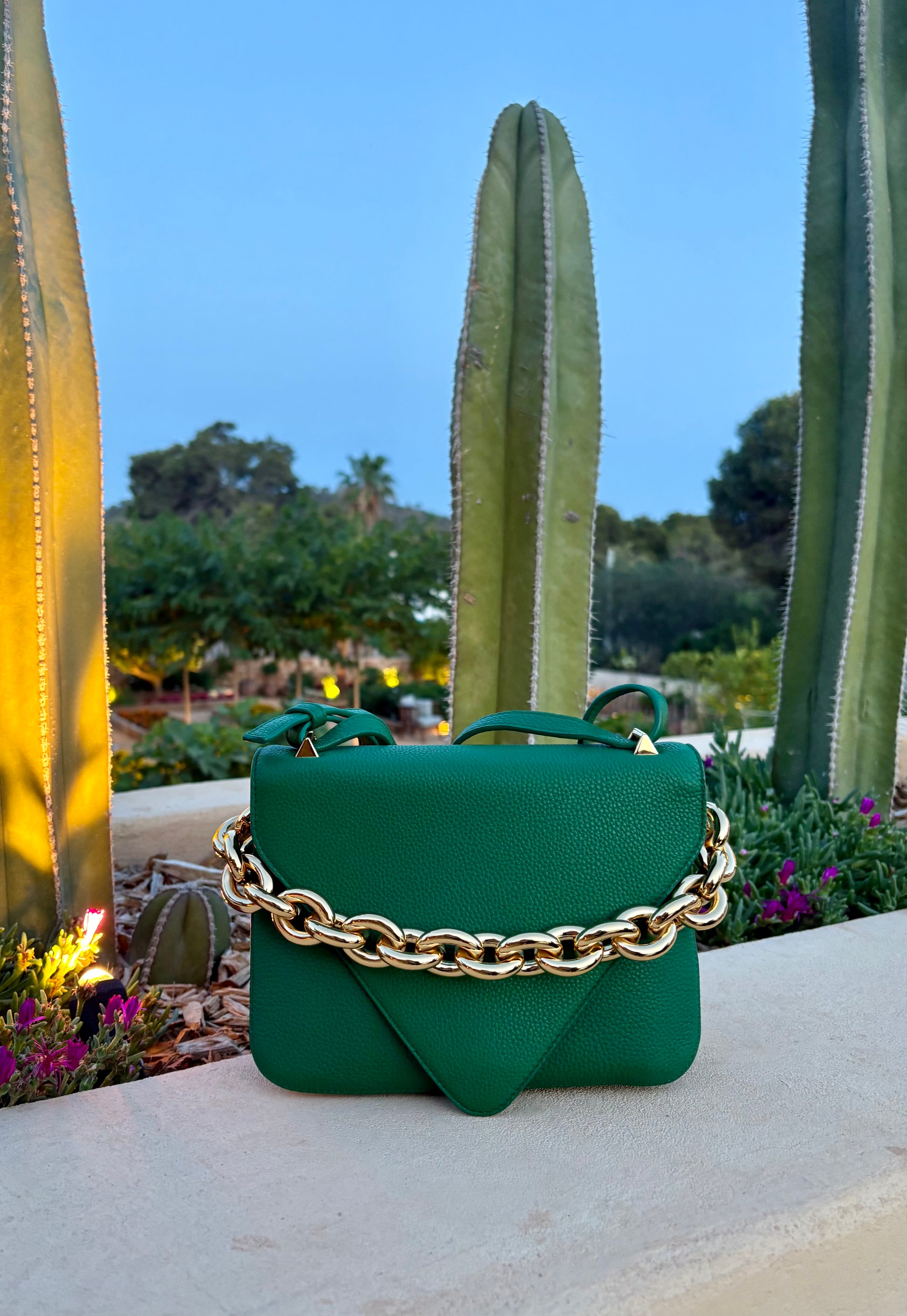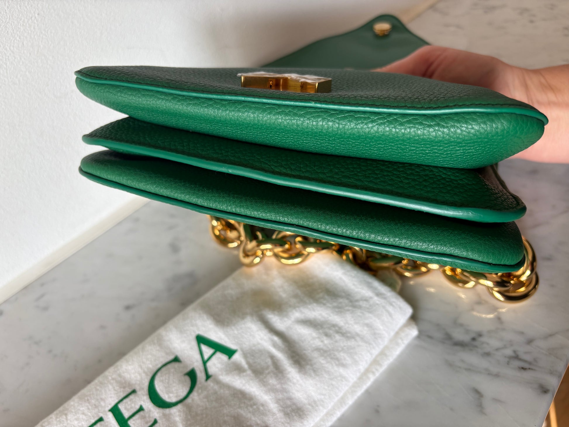 The pebbled grean leather is beautifully complemented by the thick gold chain. The chain can be worn in different ways. The strap can be worn double or single, for shoulder- or crossbody wear.