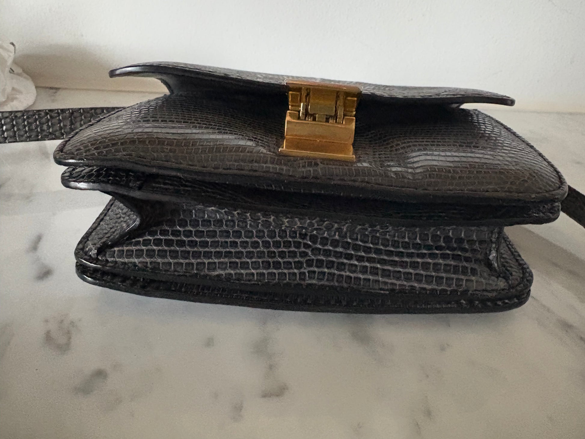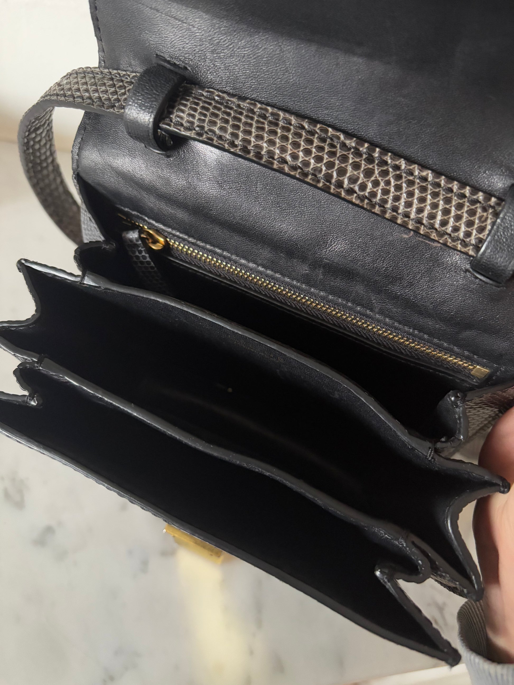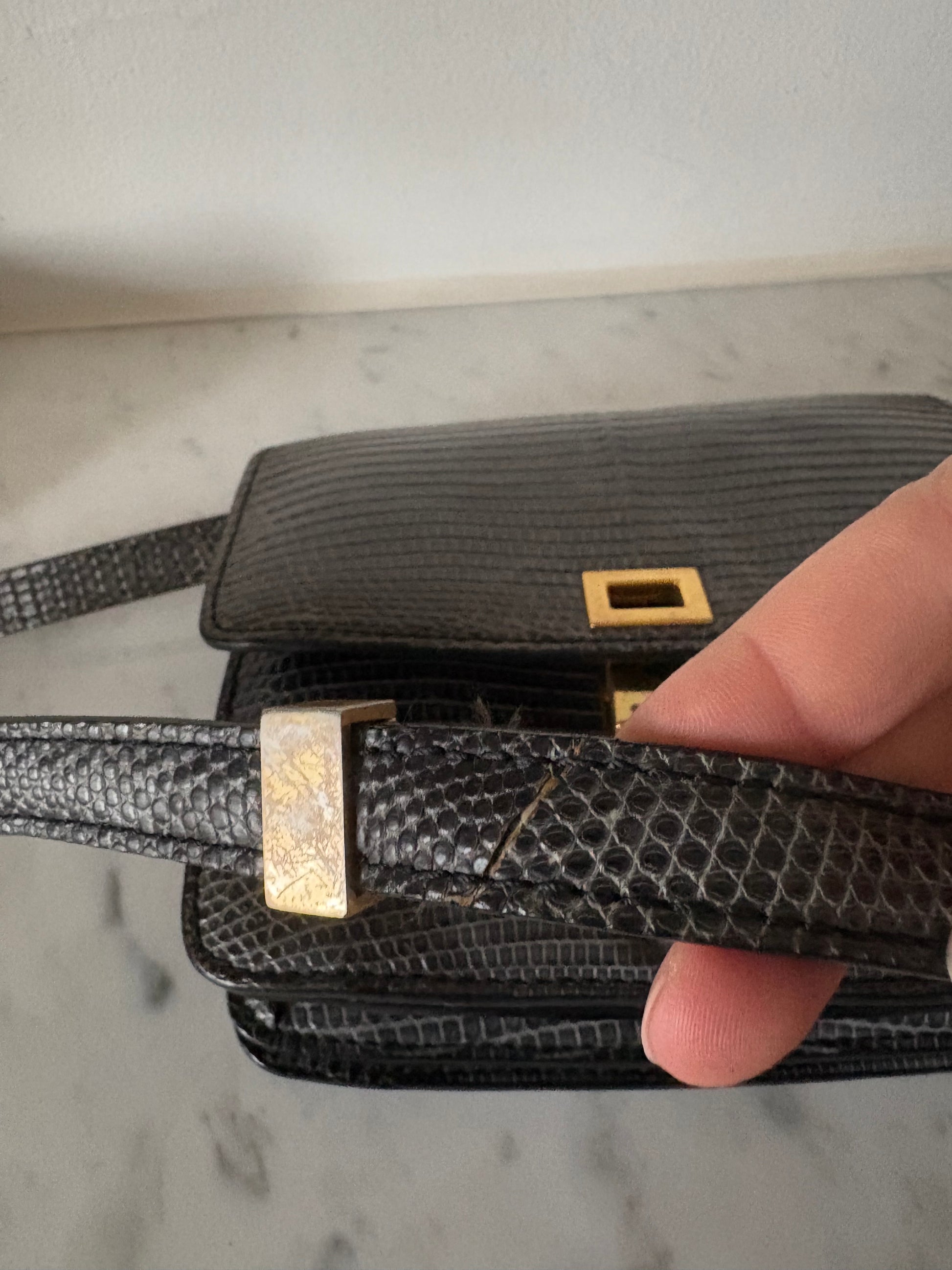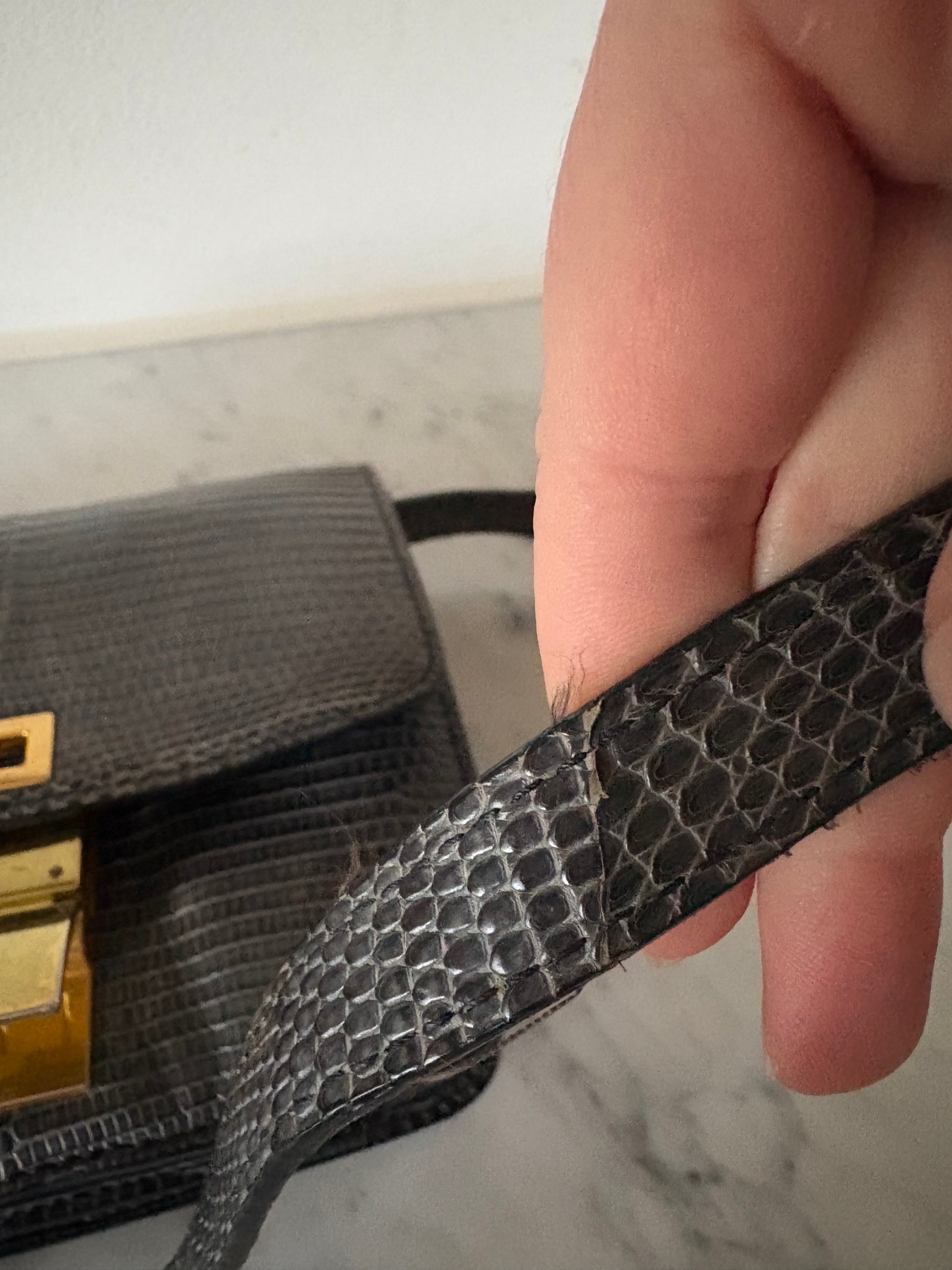 The bag is in good condition, with some signs of use; there is some light discolouration of the leather, which is not very noticeable on the lizard pattern. The strap has a few deep scratches, but they do not affect the usage of the bag (the strap is still strong). The hardware shows scratches as well.