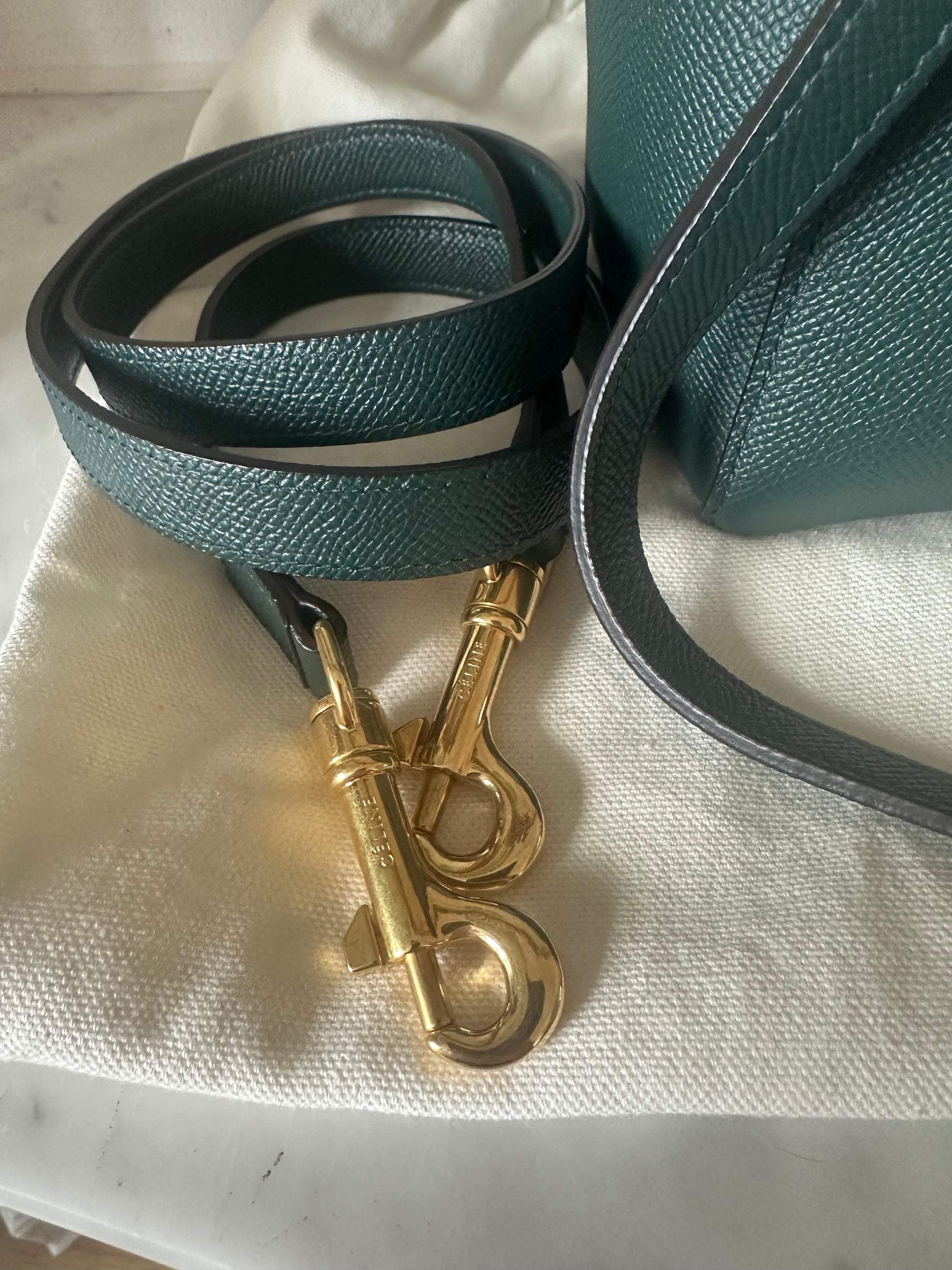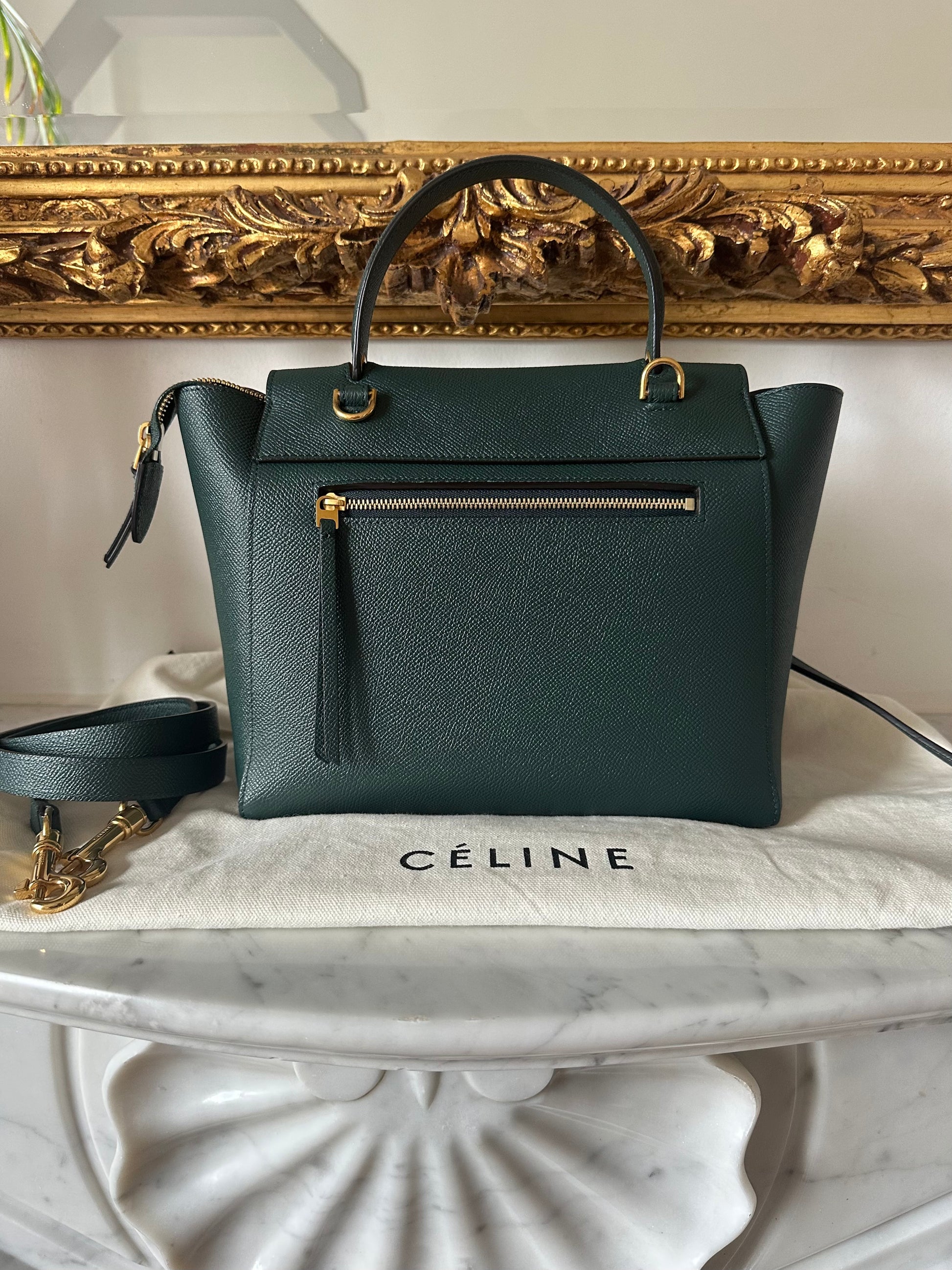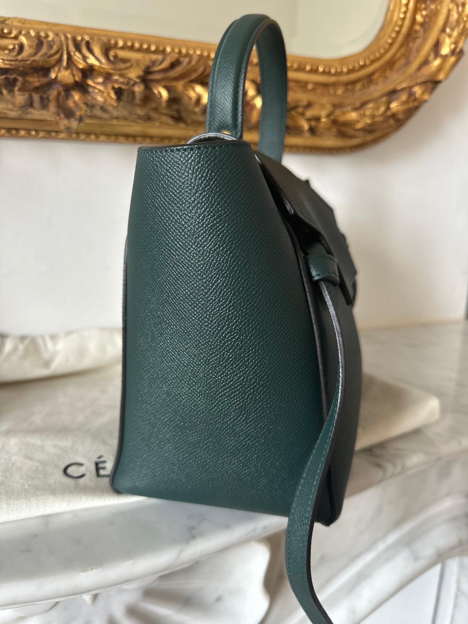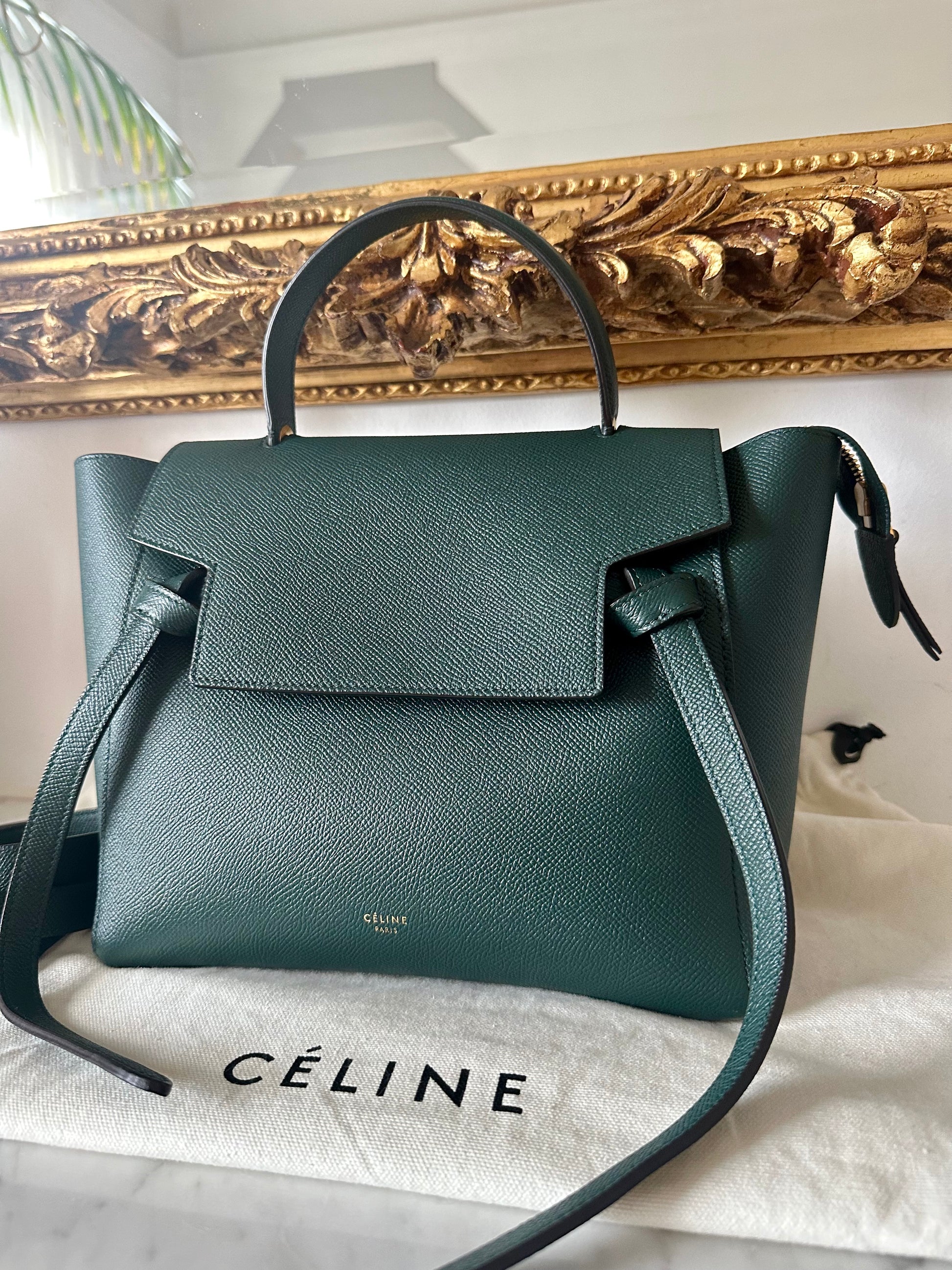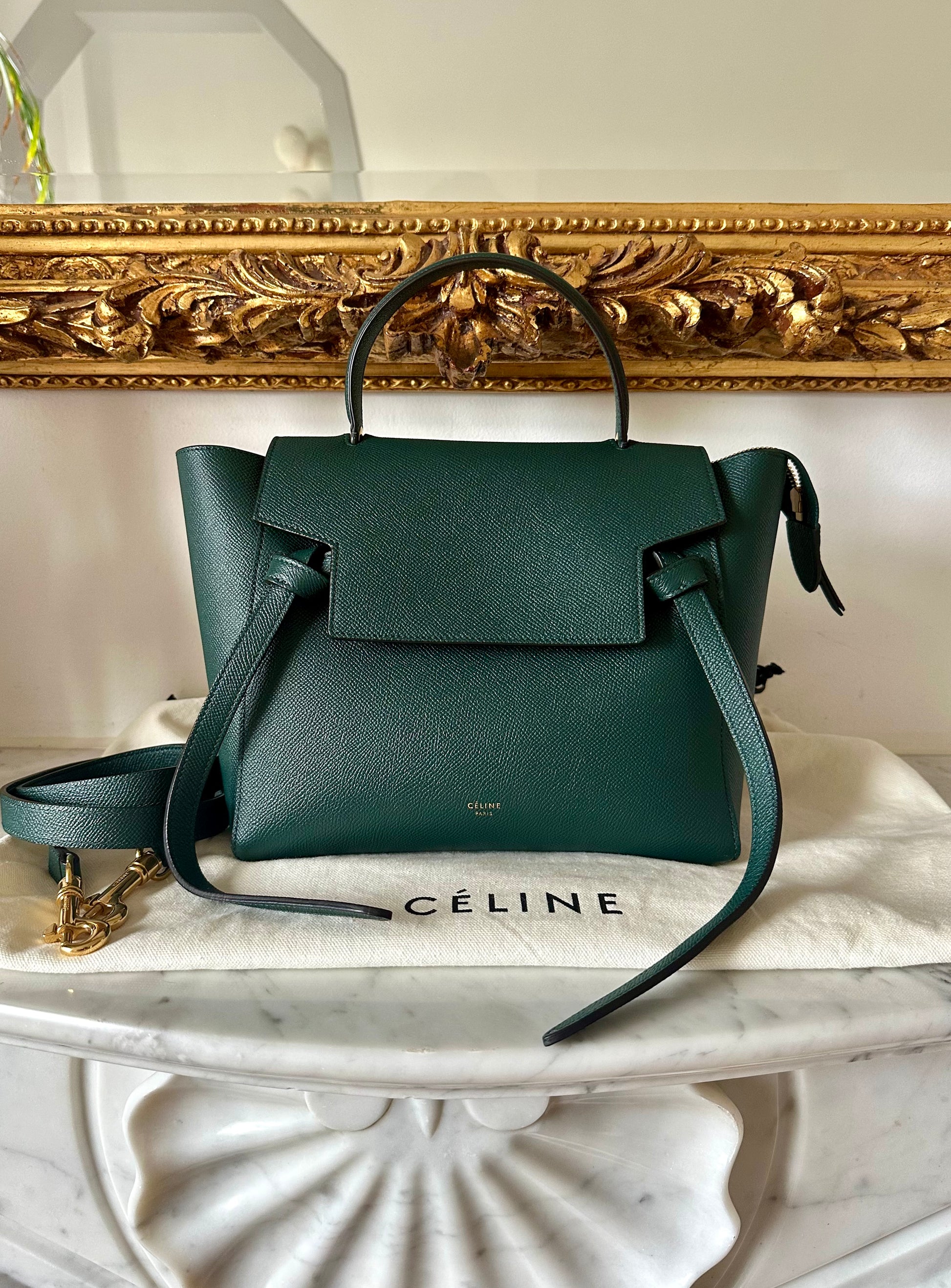 Gorgeous pine green Celine belt bag in micro size.
