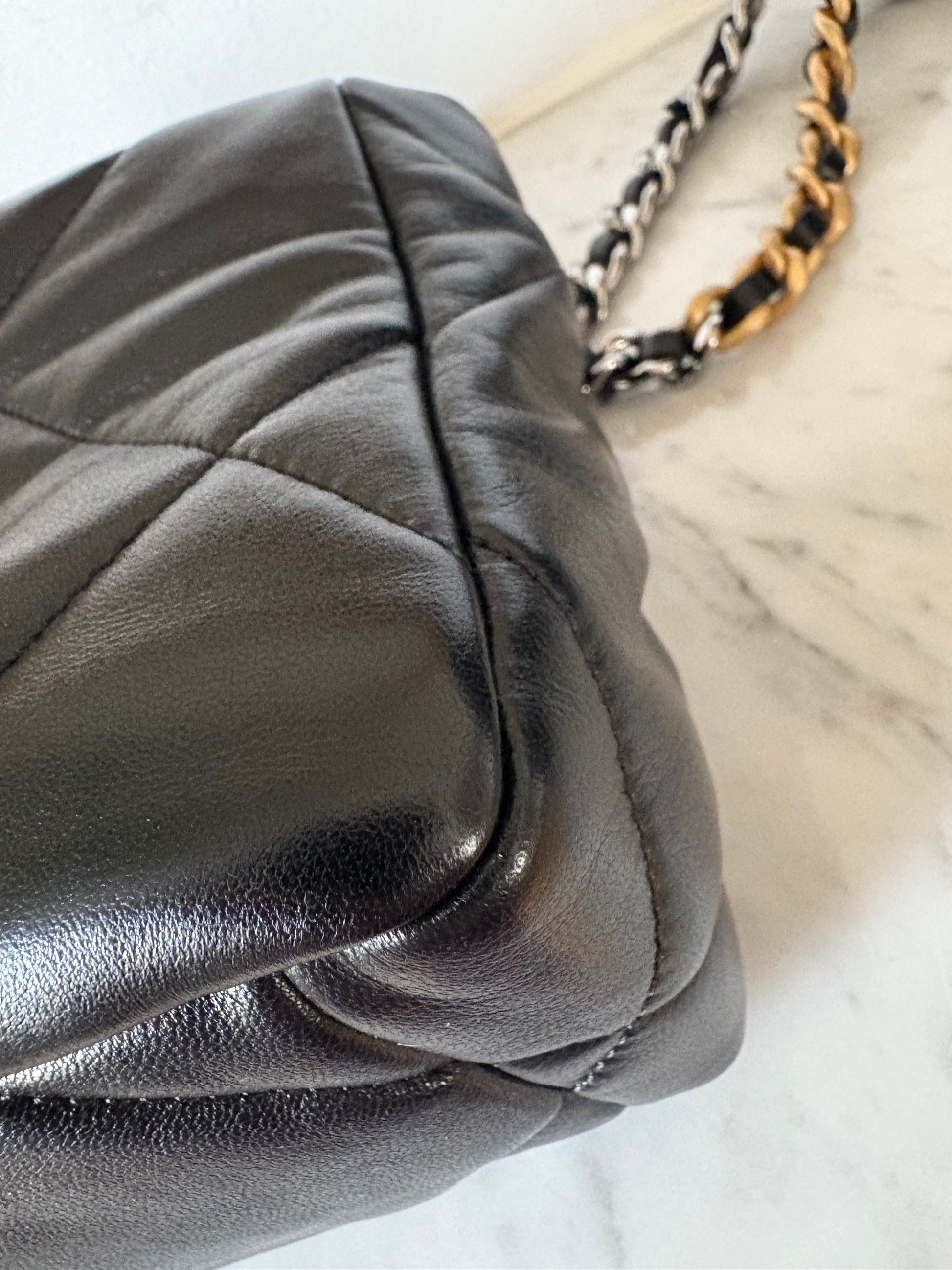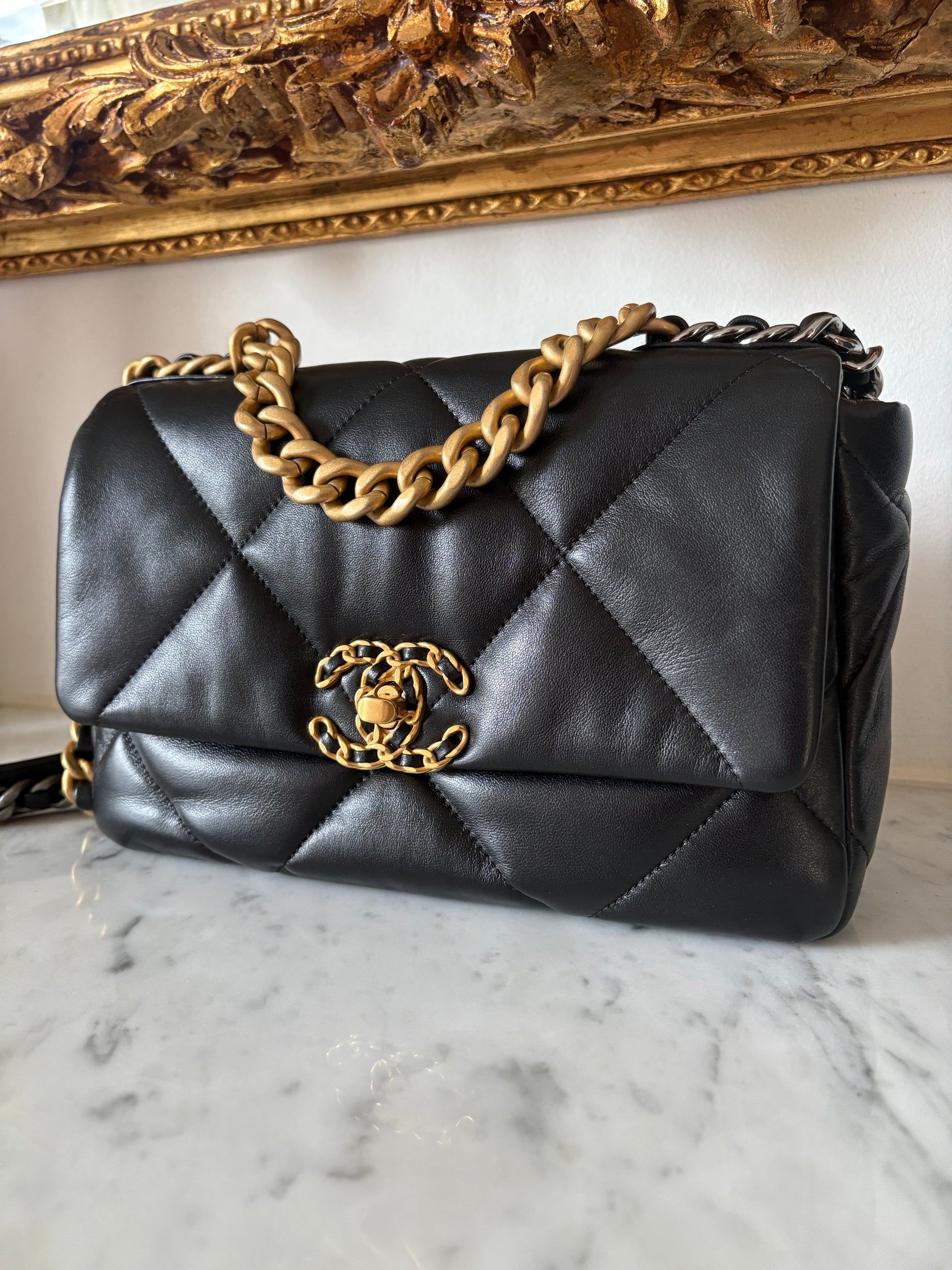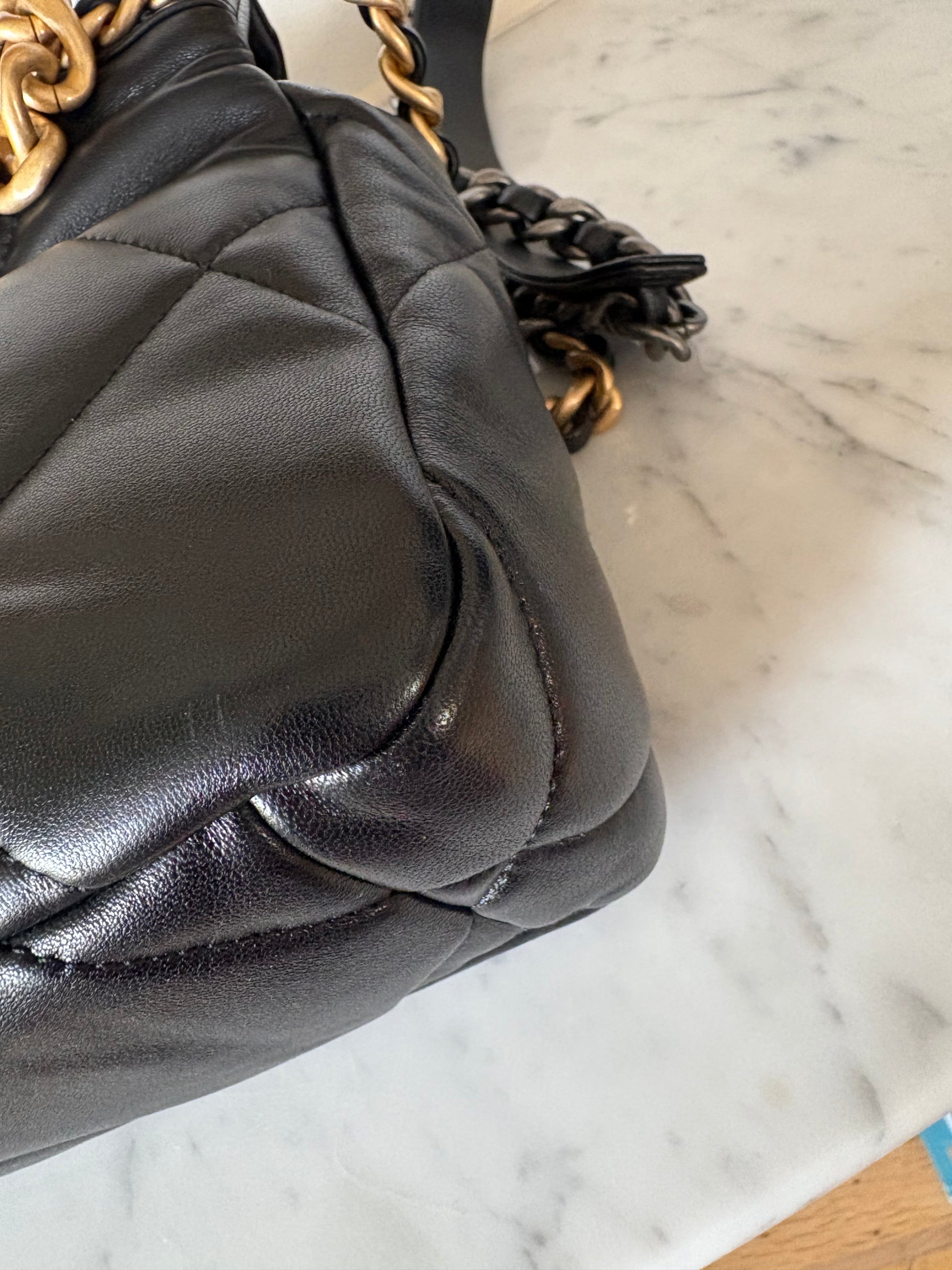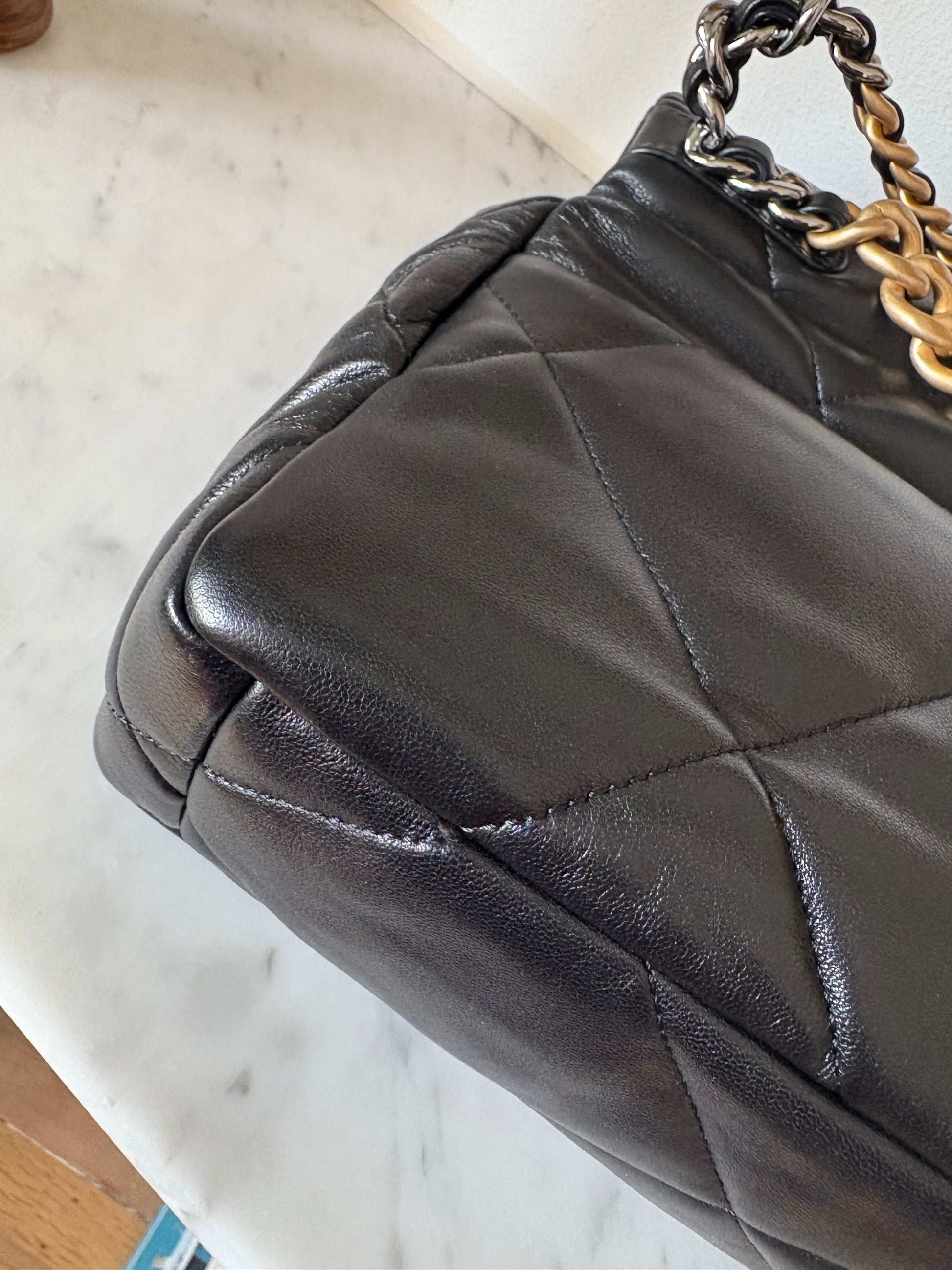 This Chanel 19 is from 2023 and has been used only a couple of times. It is therefore in nearly perfect condition, without any obvious signs of wear, and with plastic still on some of the hardware.