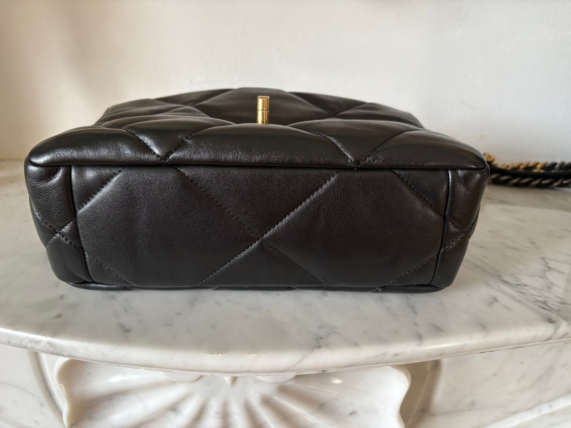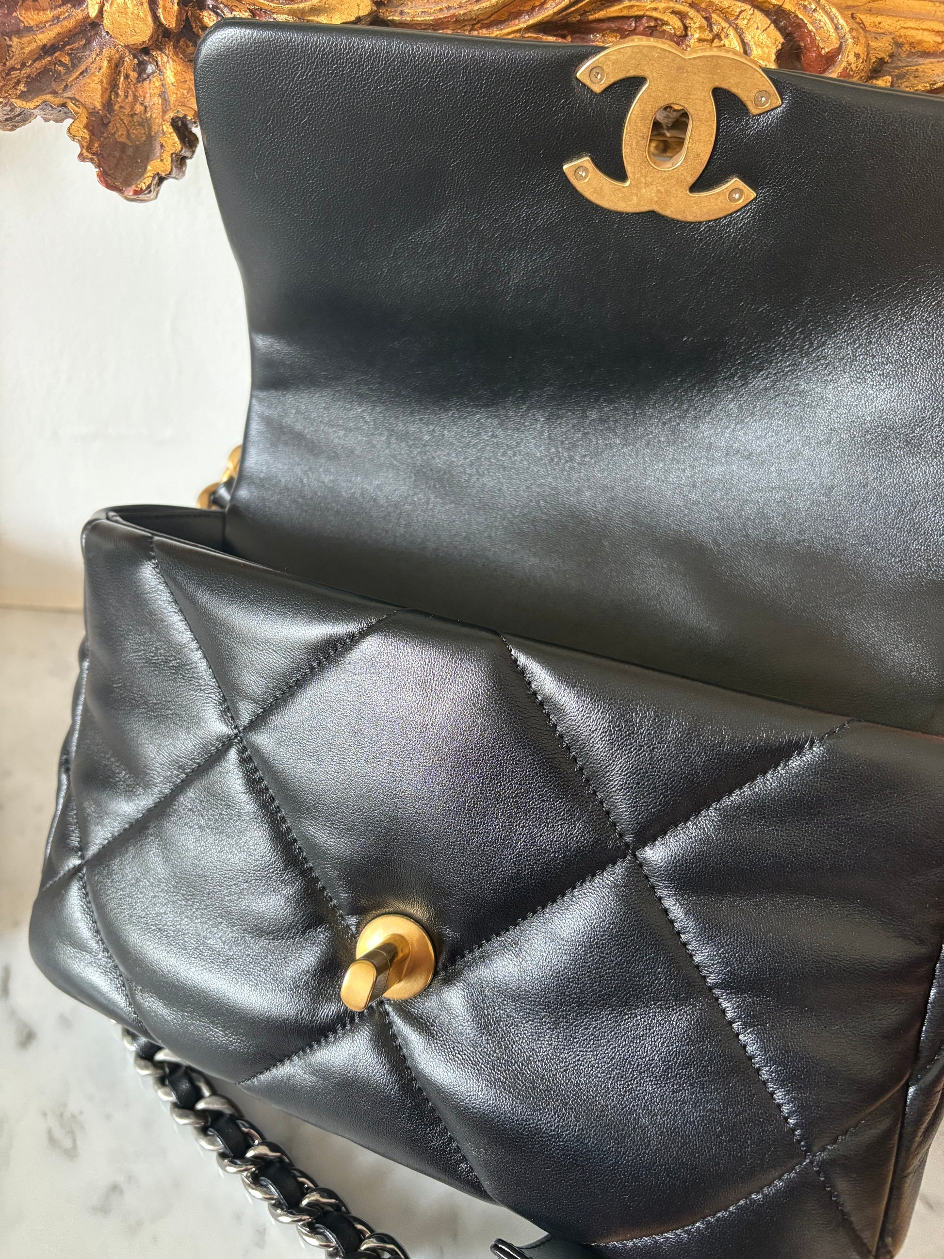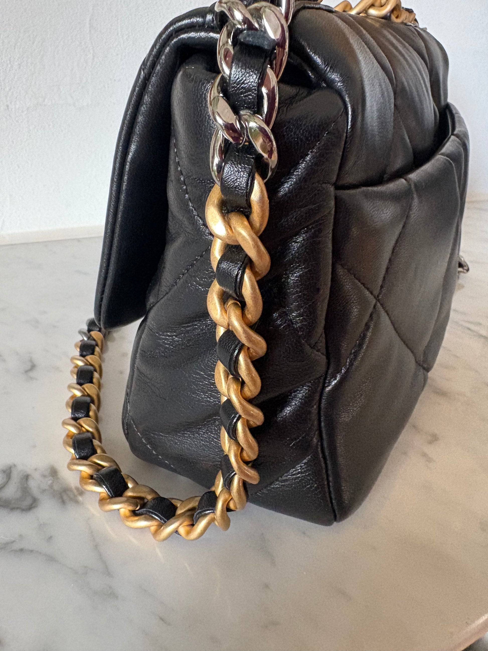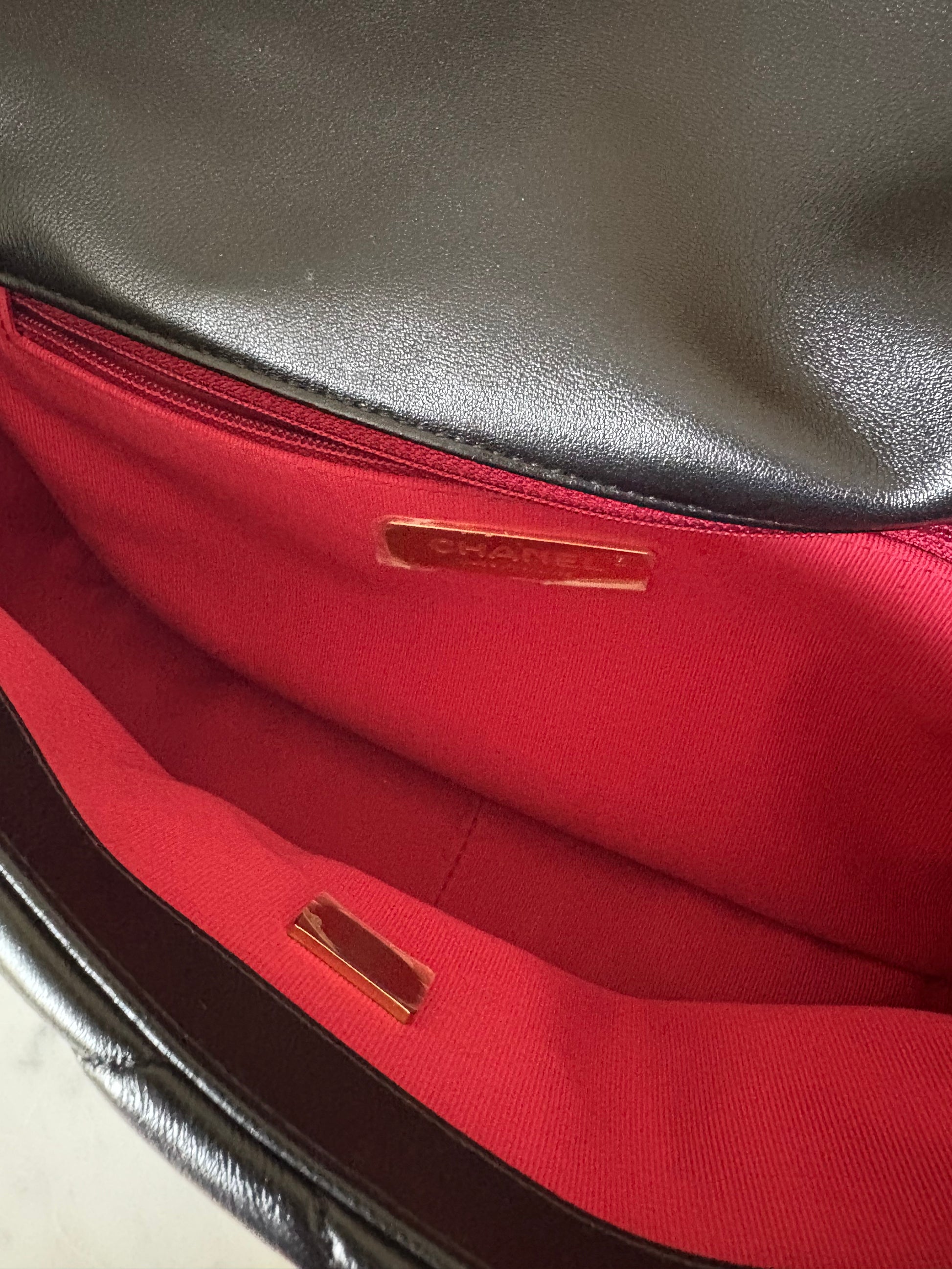 This Chanel 19 is from 2023 and has been used only a couple of times. It is therefore in nearly perfect condition, without any obvious signs of wear, and with plastic still on some of the hardware.