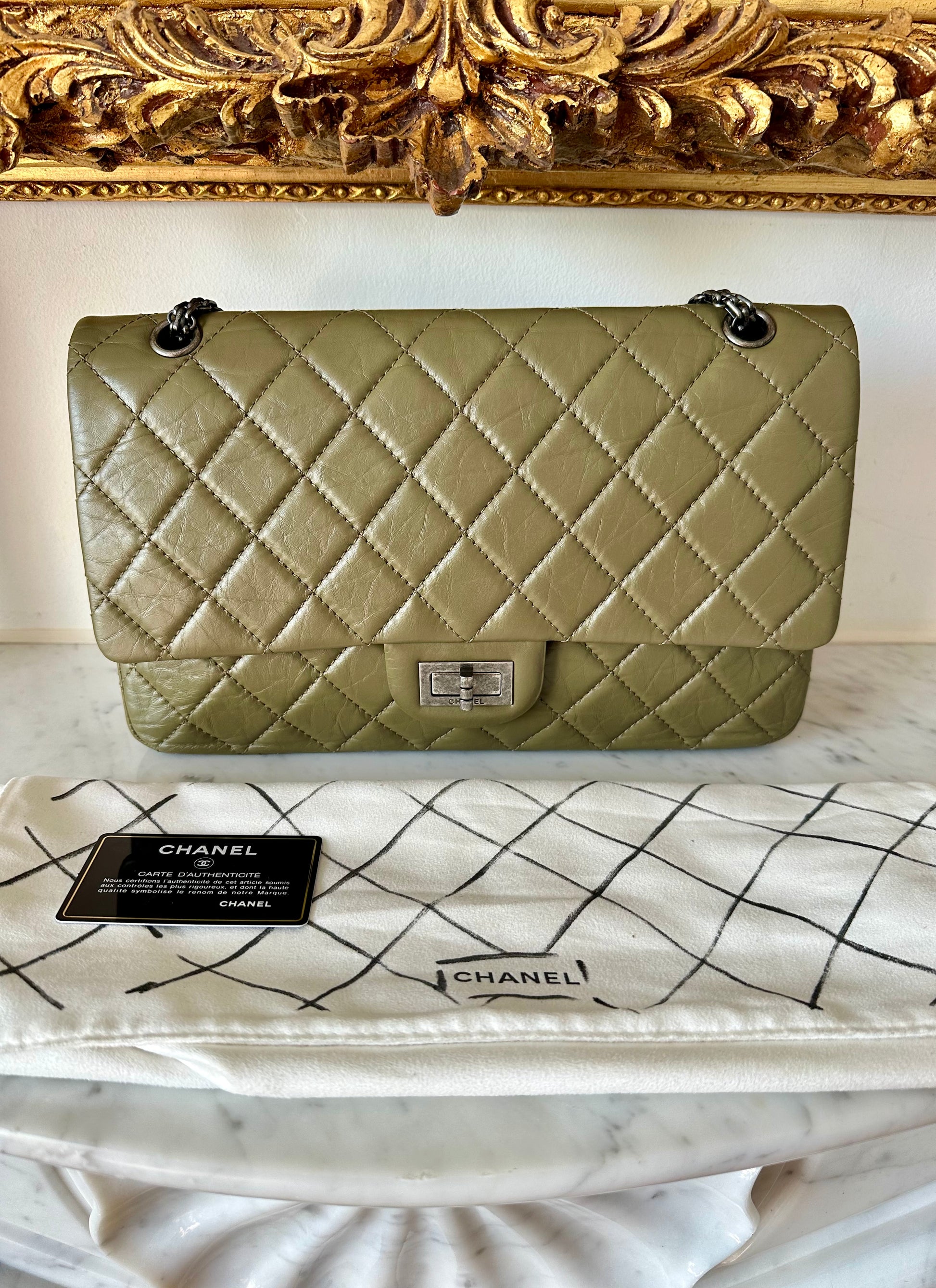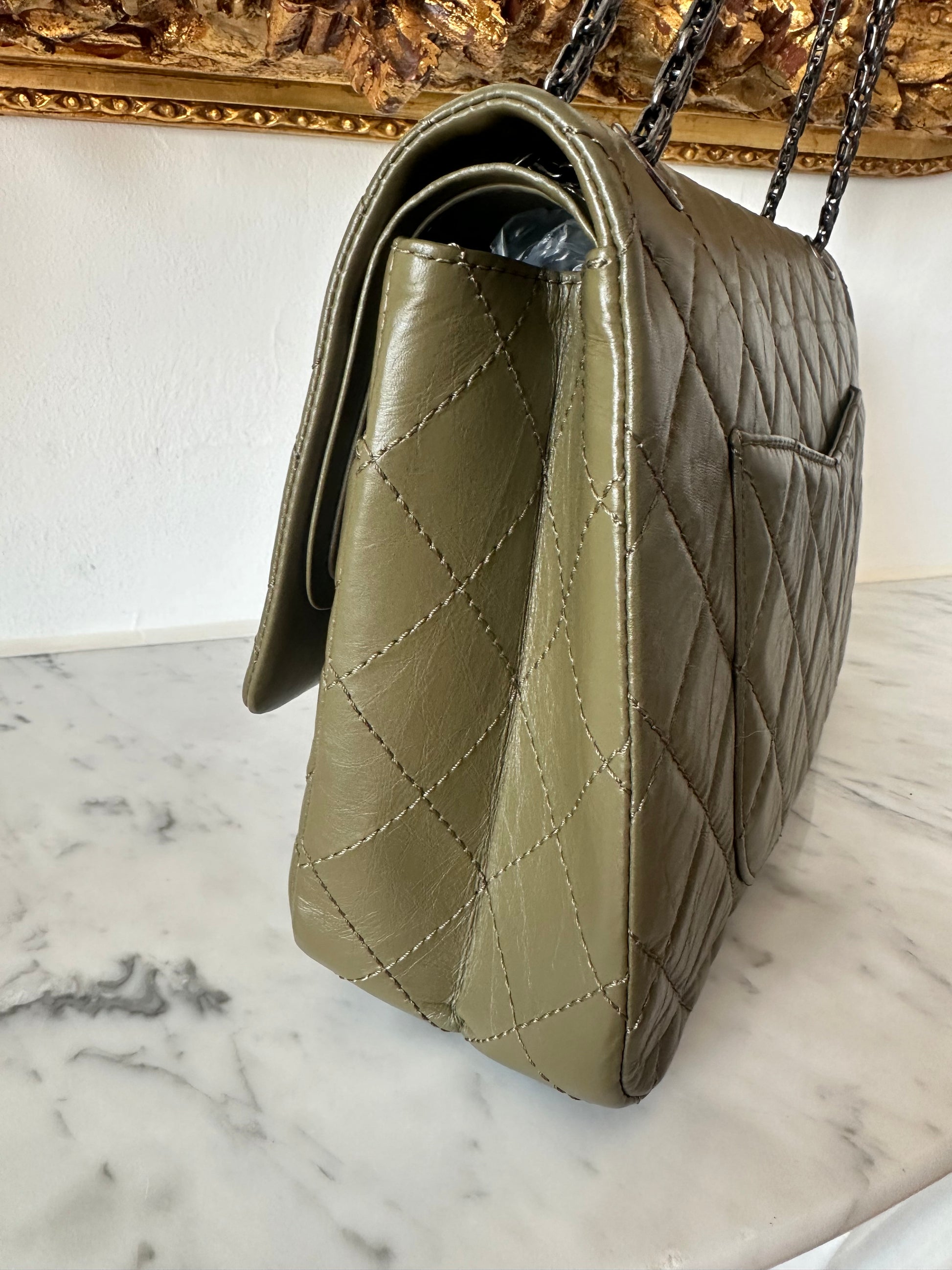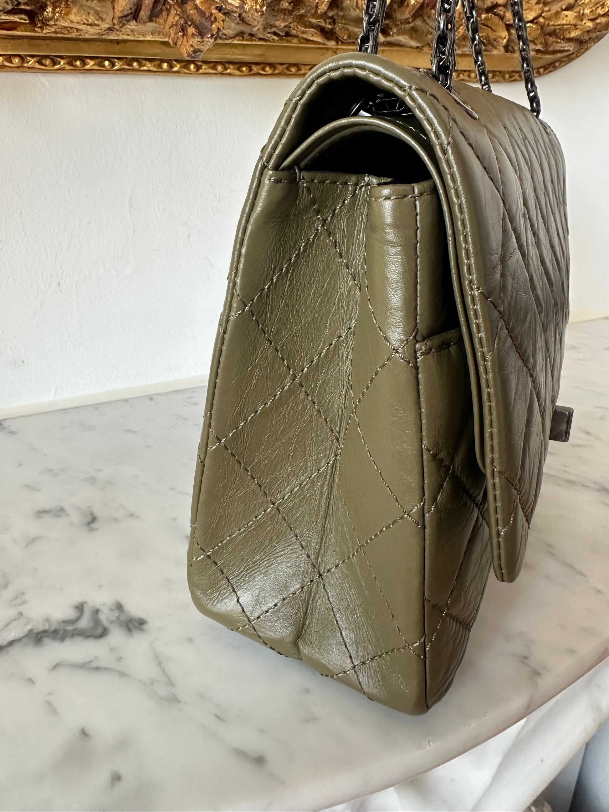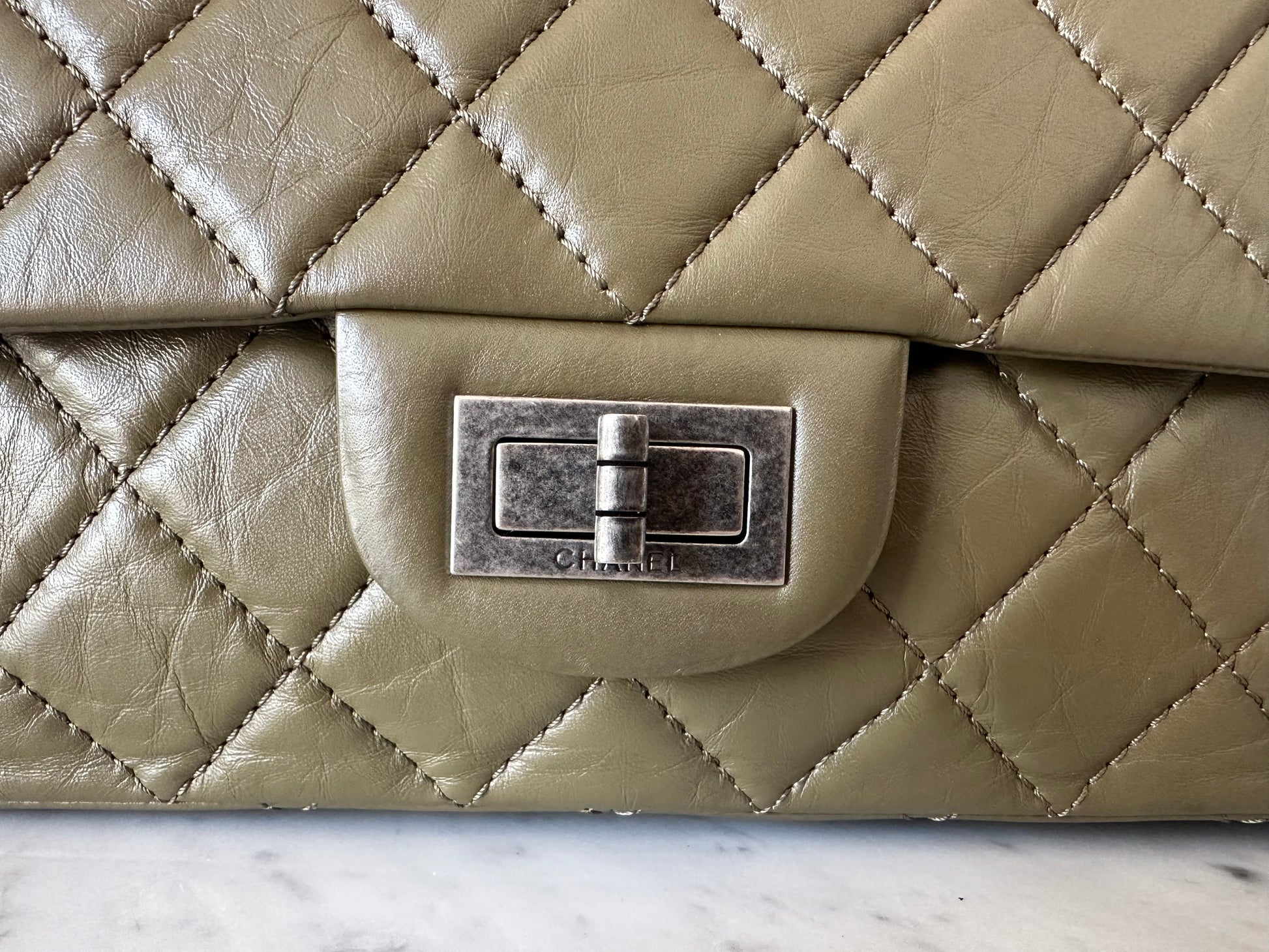 This beautiful and super practical bag is made of olive coloured aged calfskin, and features ruthenium hardware. This is a size 227, which is usually referred to as jumbo or maxi size.