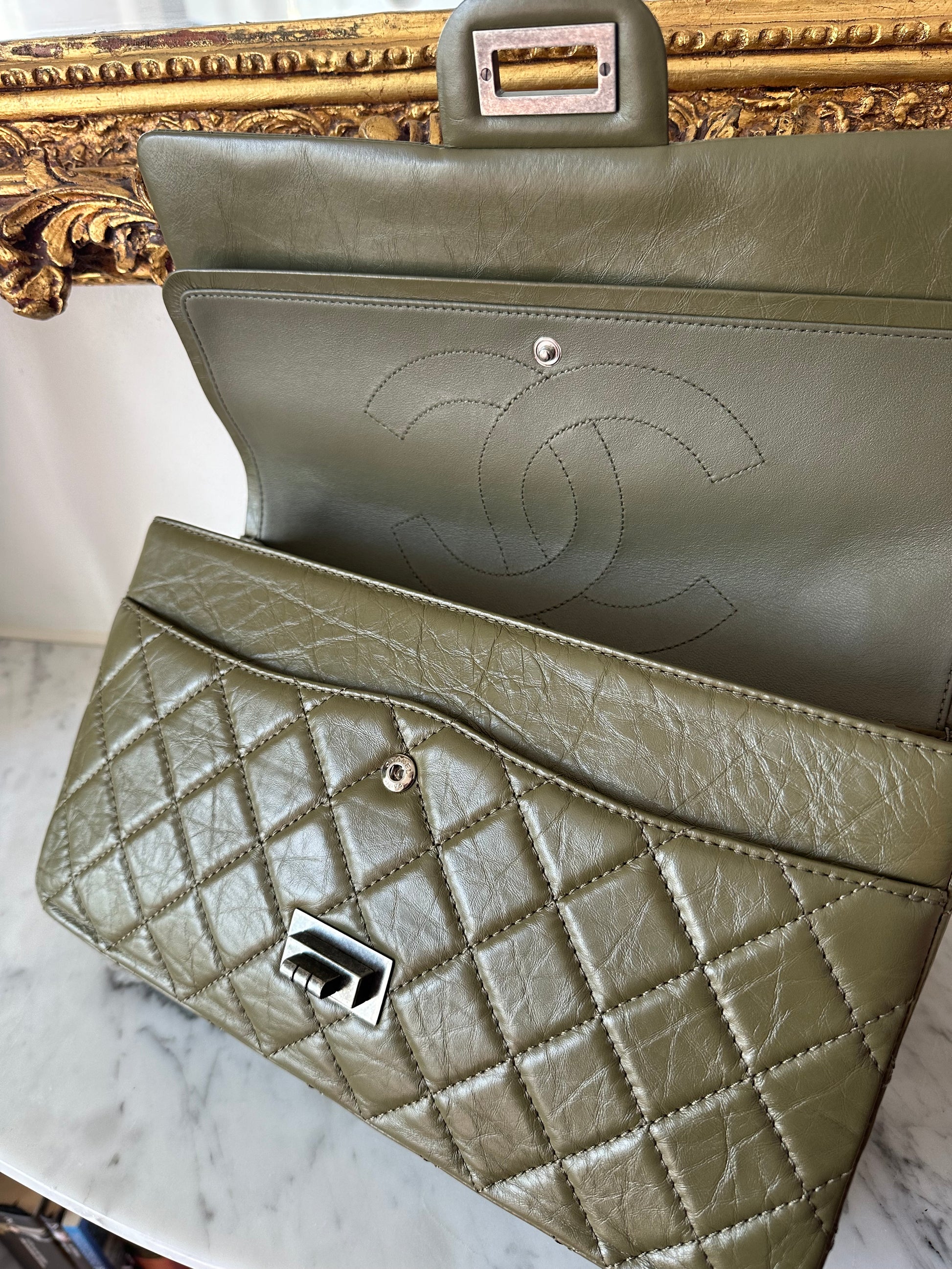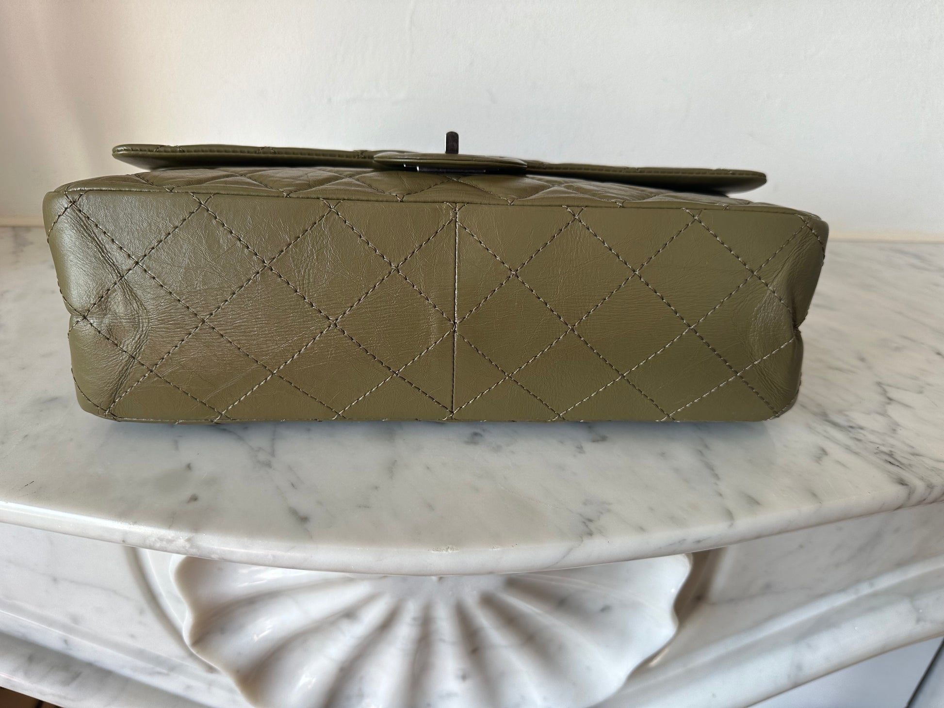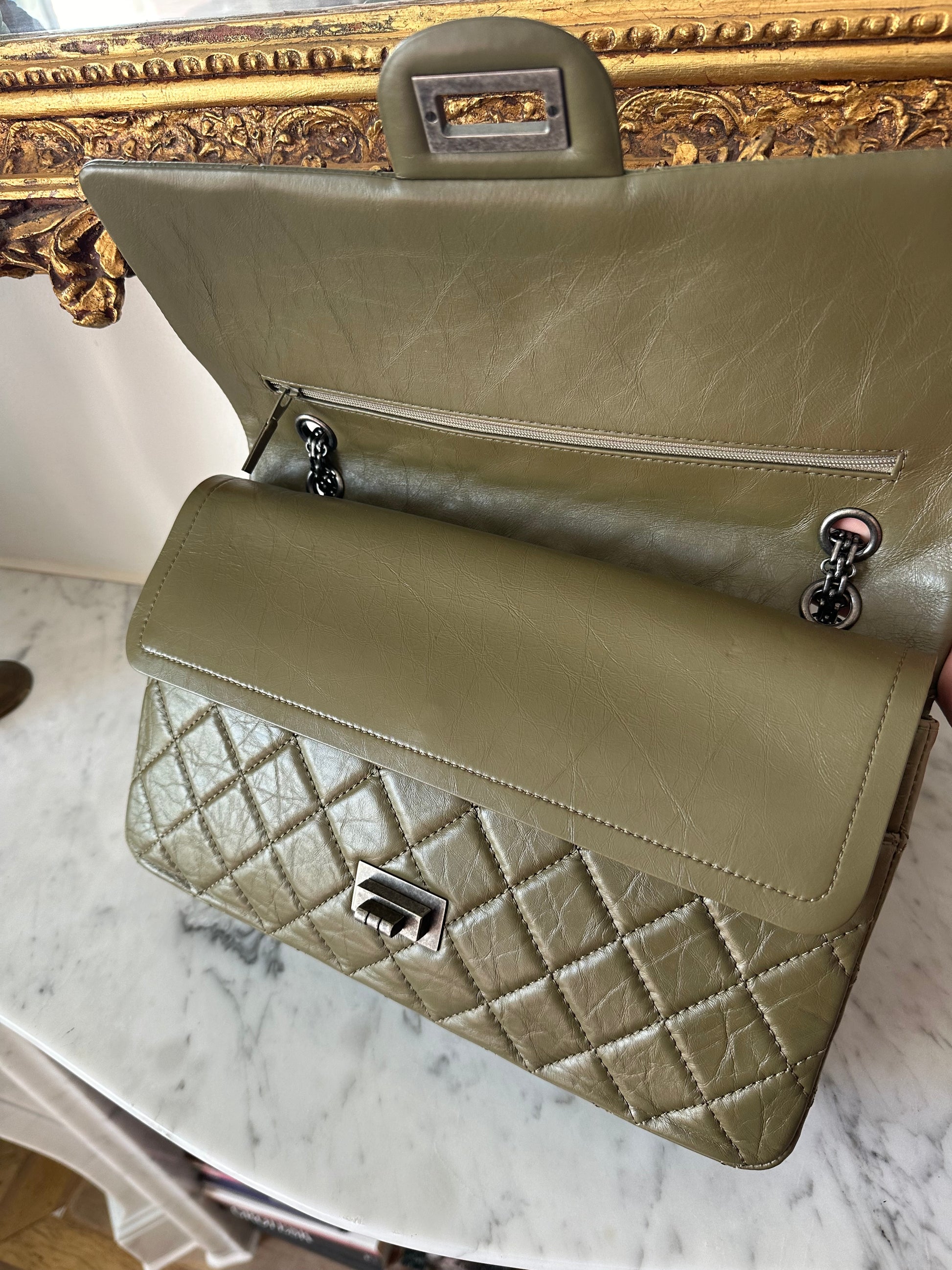 This beautiful and super practical bag is made of olive coloured aged calfskin, and features ruthenium hardware. This is a size 227, which is usually referred to as jumbo or maxi size.
