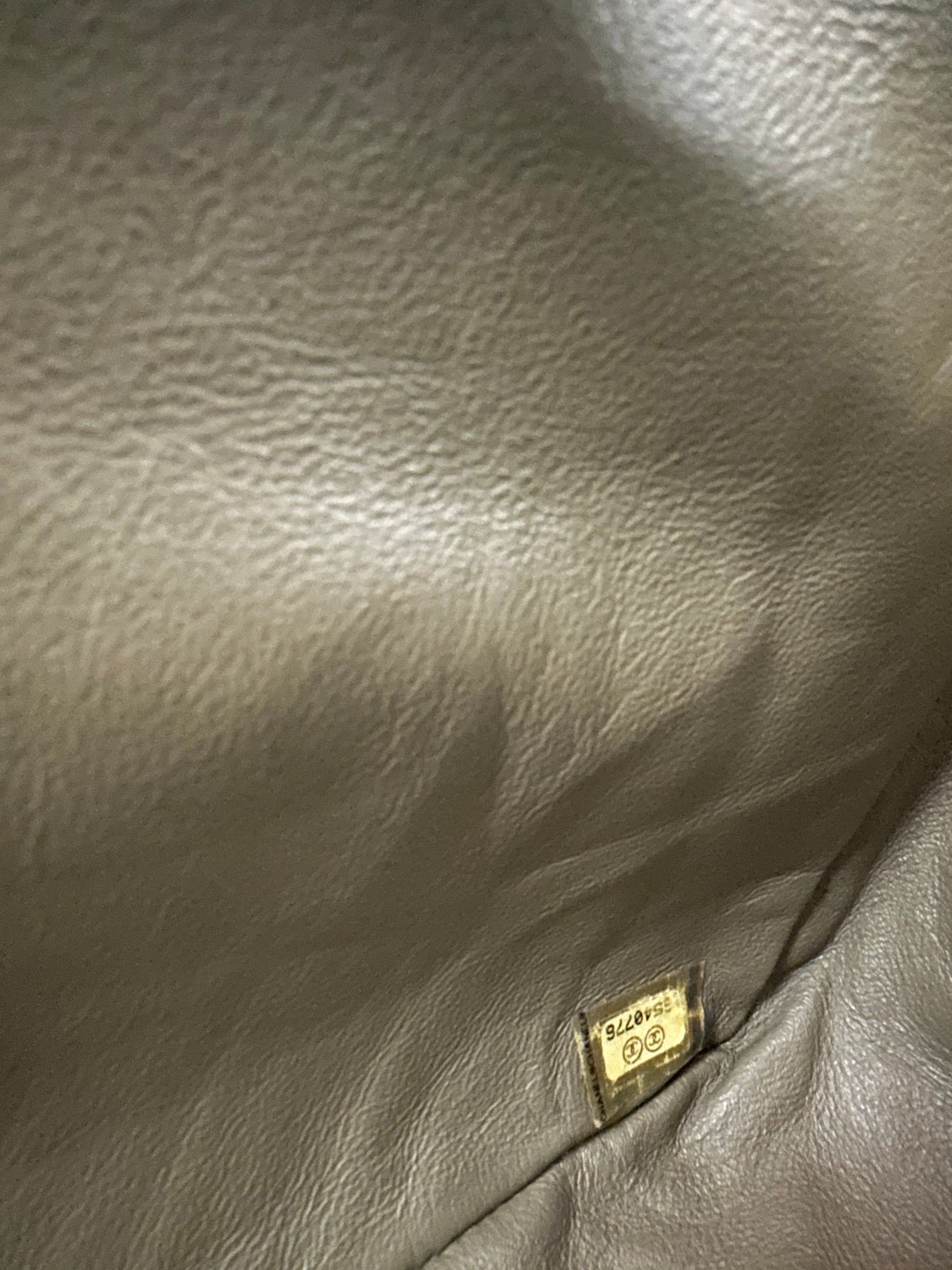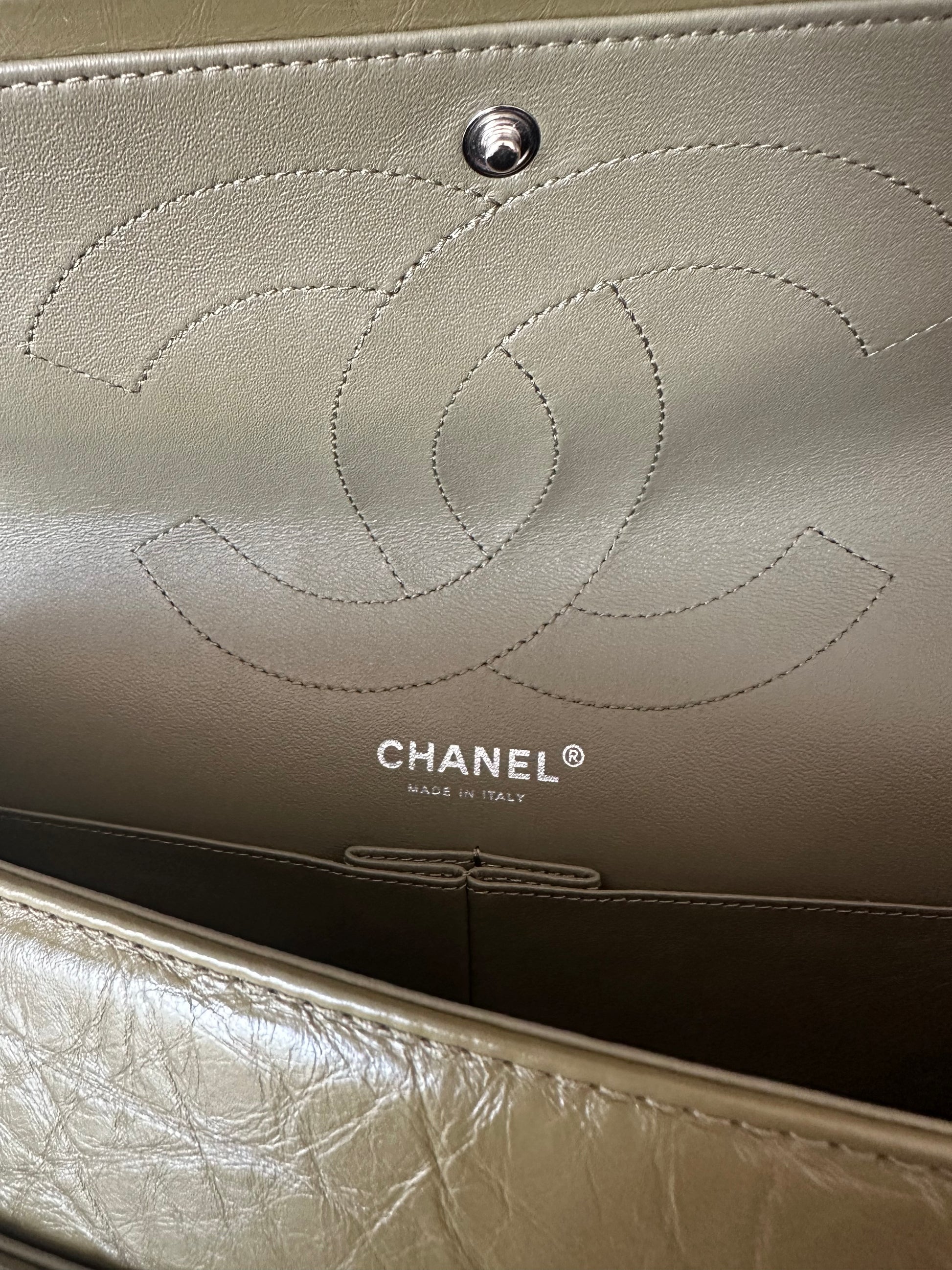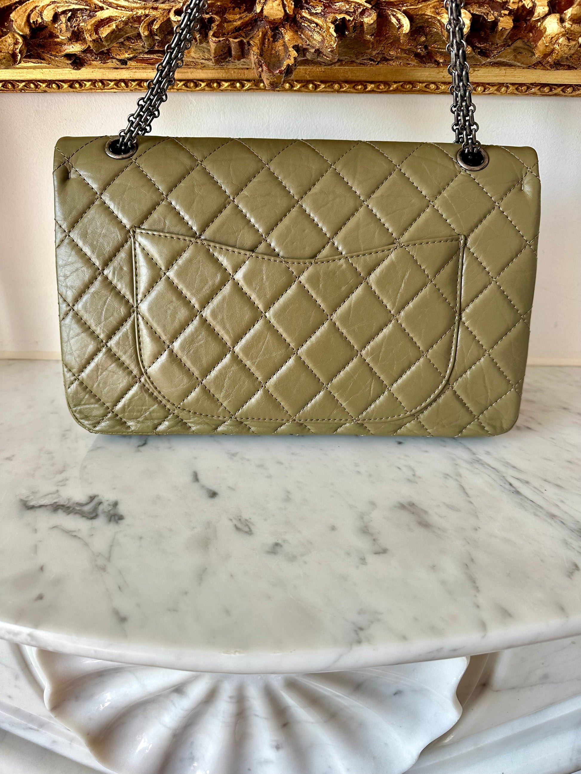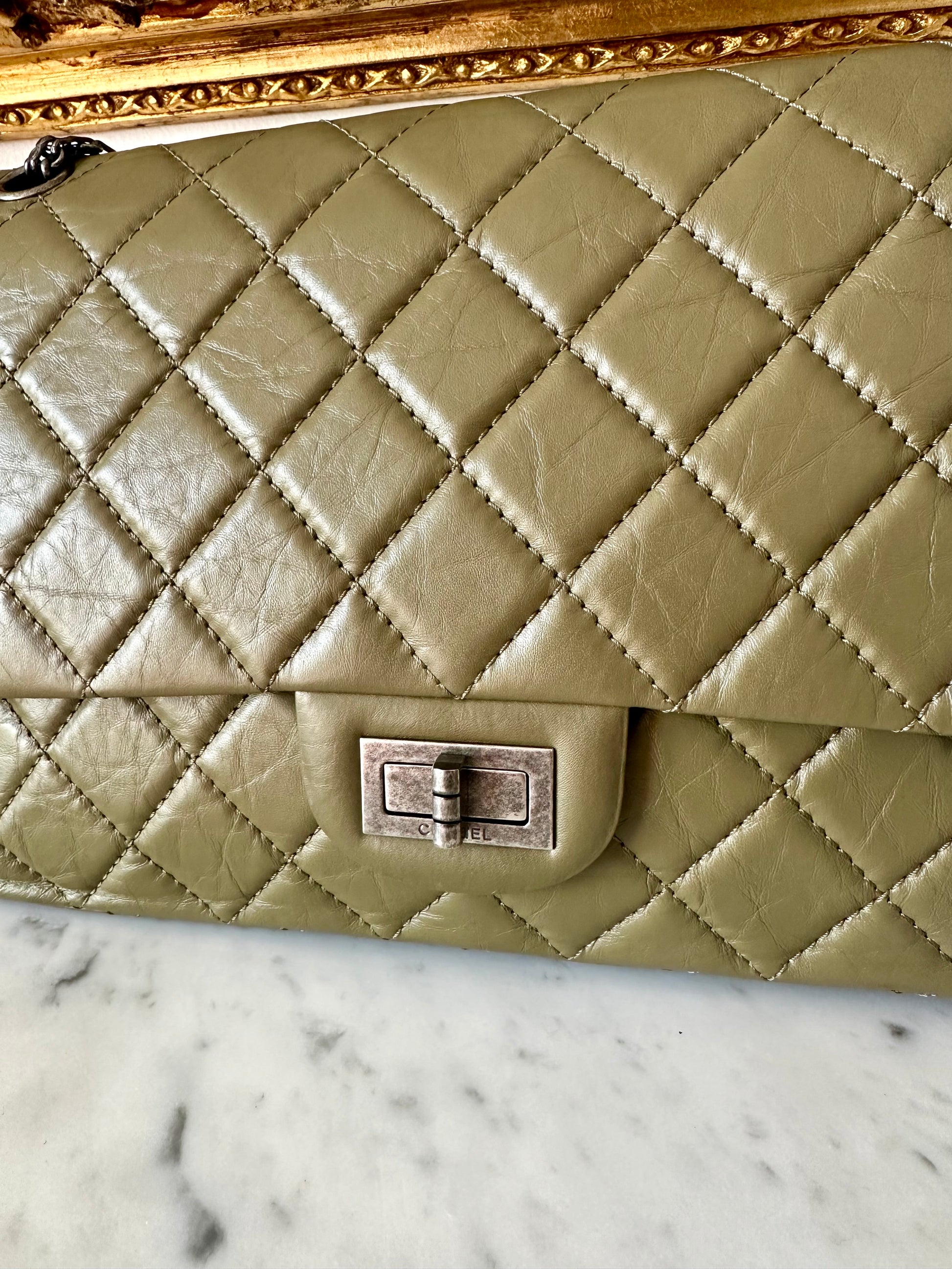 This beautiful and super practical bag is made of olive coloured aged calfskin, and features ruthenium hardware. This is a size 227, which is usually referred to as jumbo or maxi size.