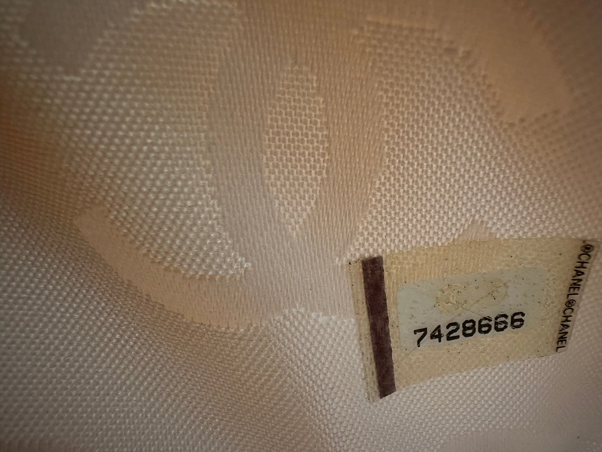 This vintage gem is super girly and pretty, a perfect going out purse! It’s made out of pale pink thick cotton, finished with black leather details and champagne coloured hardware. The little CC charm is the finishing touch!