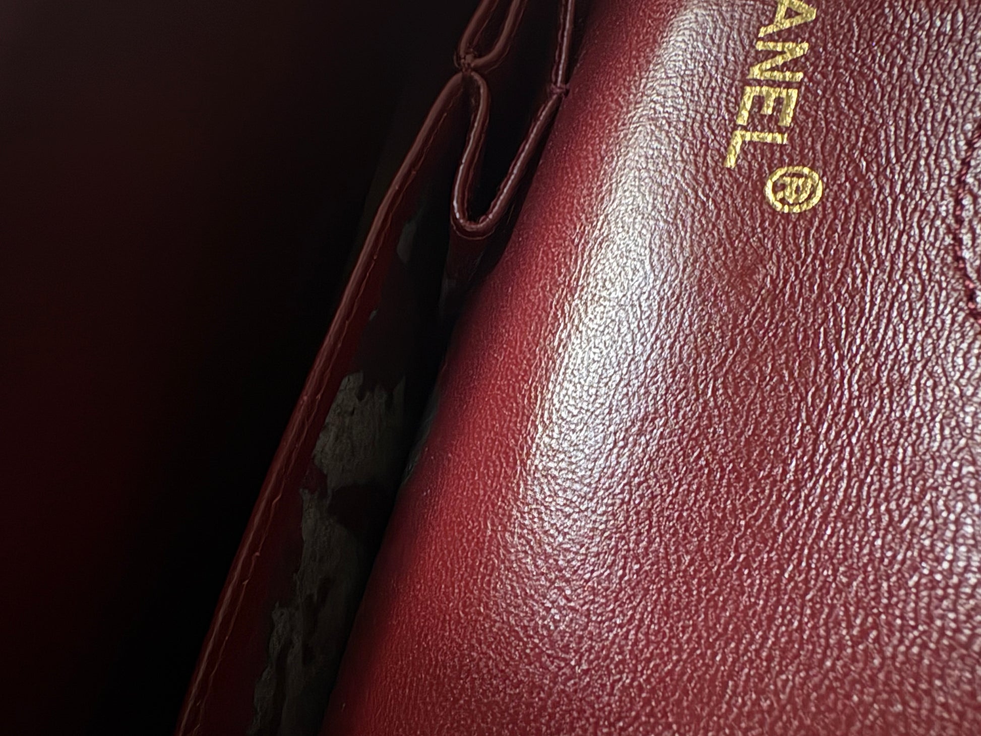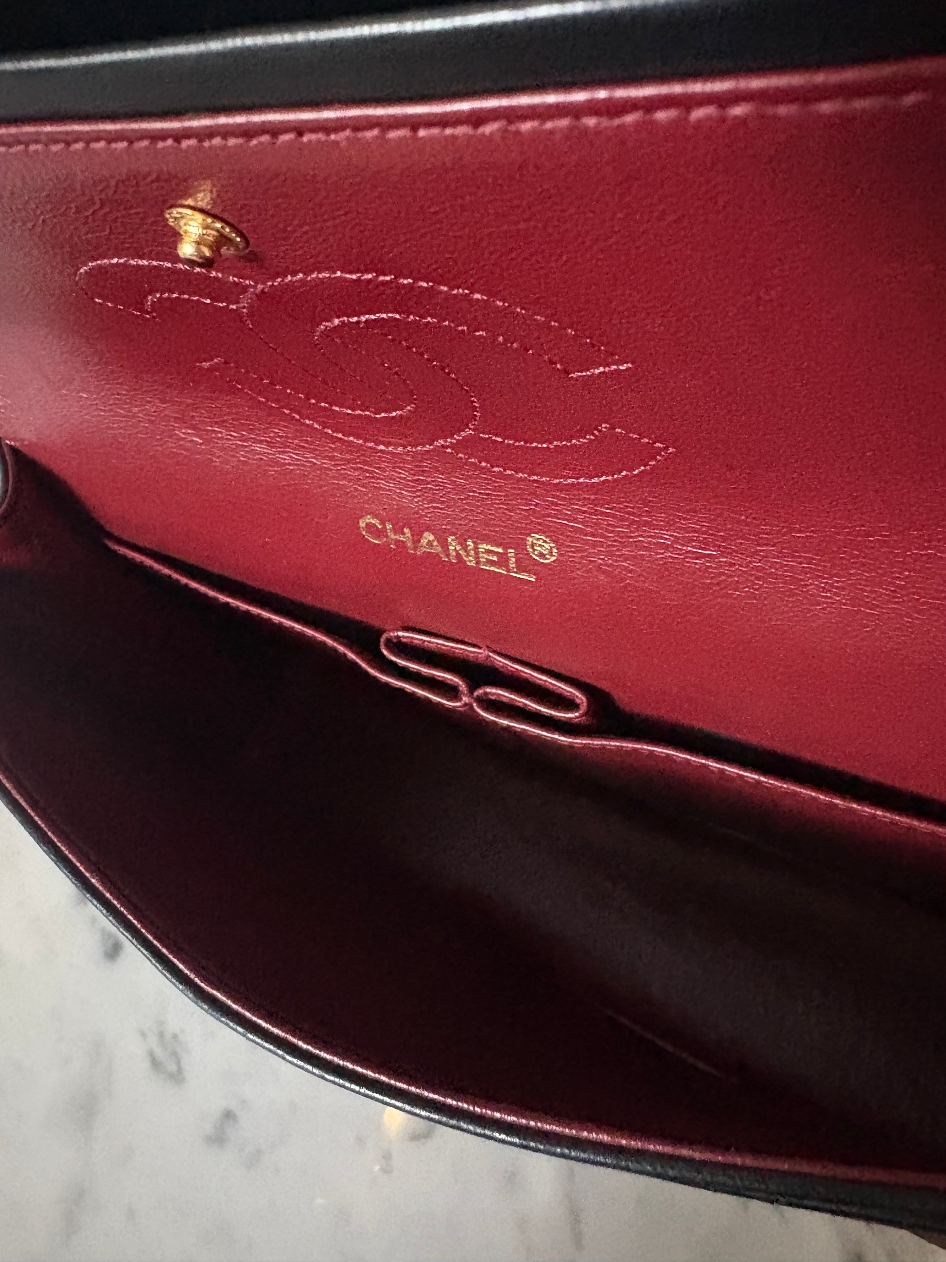 This Classic is from the ‘86-‘88 period. The bag has barely been used and shows little signs of use for a vintage bag. The structure of the bag is perfect. The gold is still very vibrant and shiny. There are the inevitable microscratches on the leather and hardware, and the small inner pockets show damage (the leather has worn off, a common problem with these bags. This is not very noticeable and those pockets can easily be avoided.) In general this bag looks amazing for her age!
