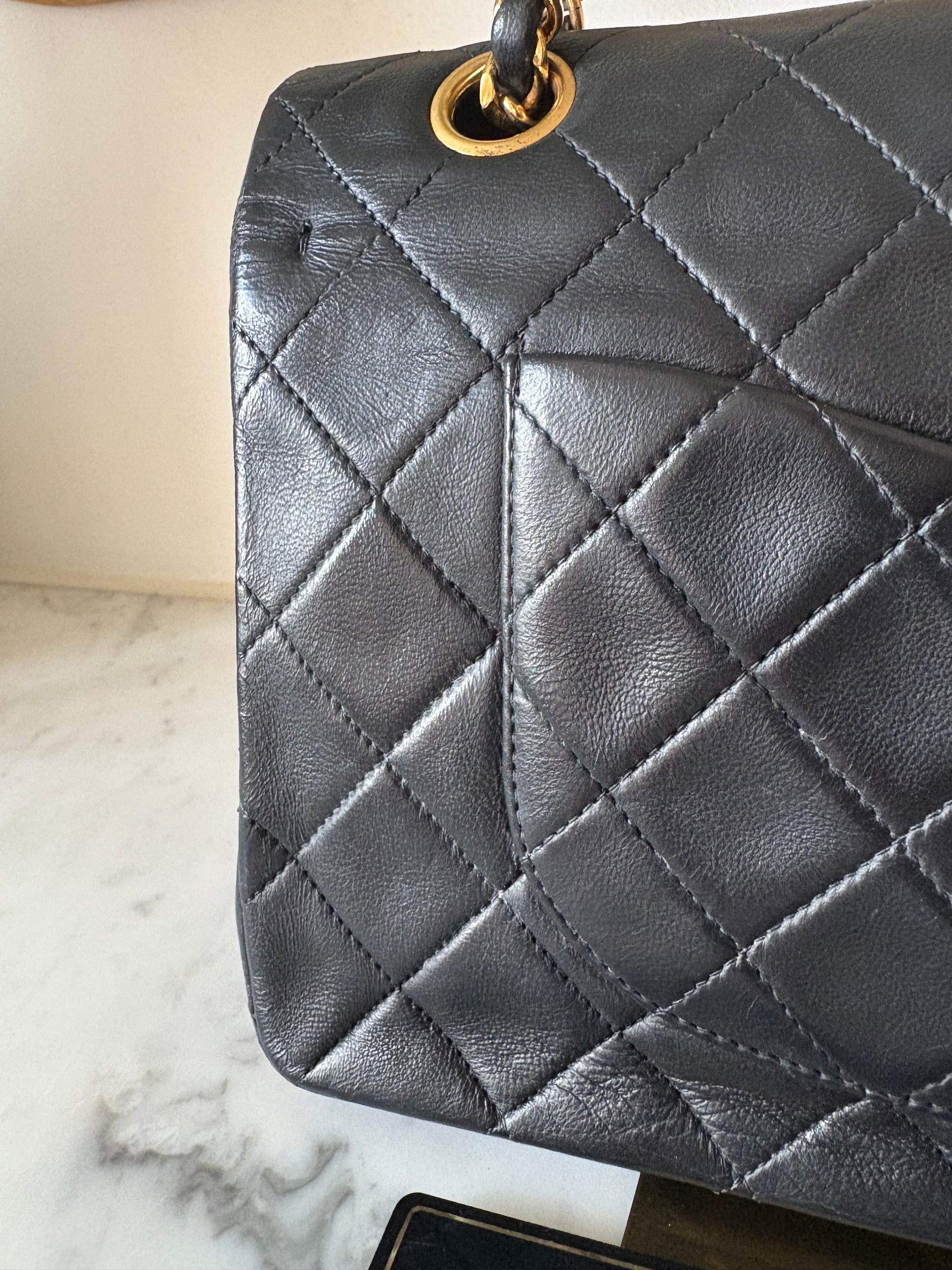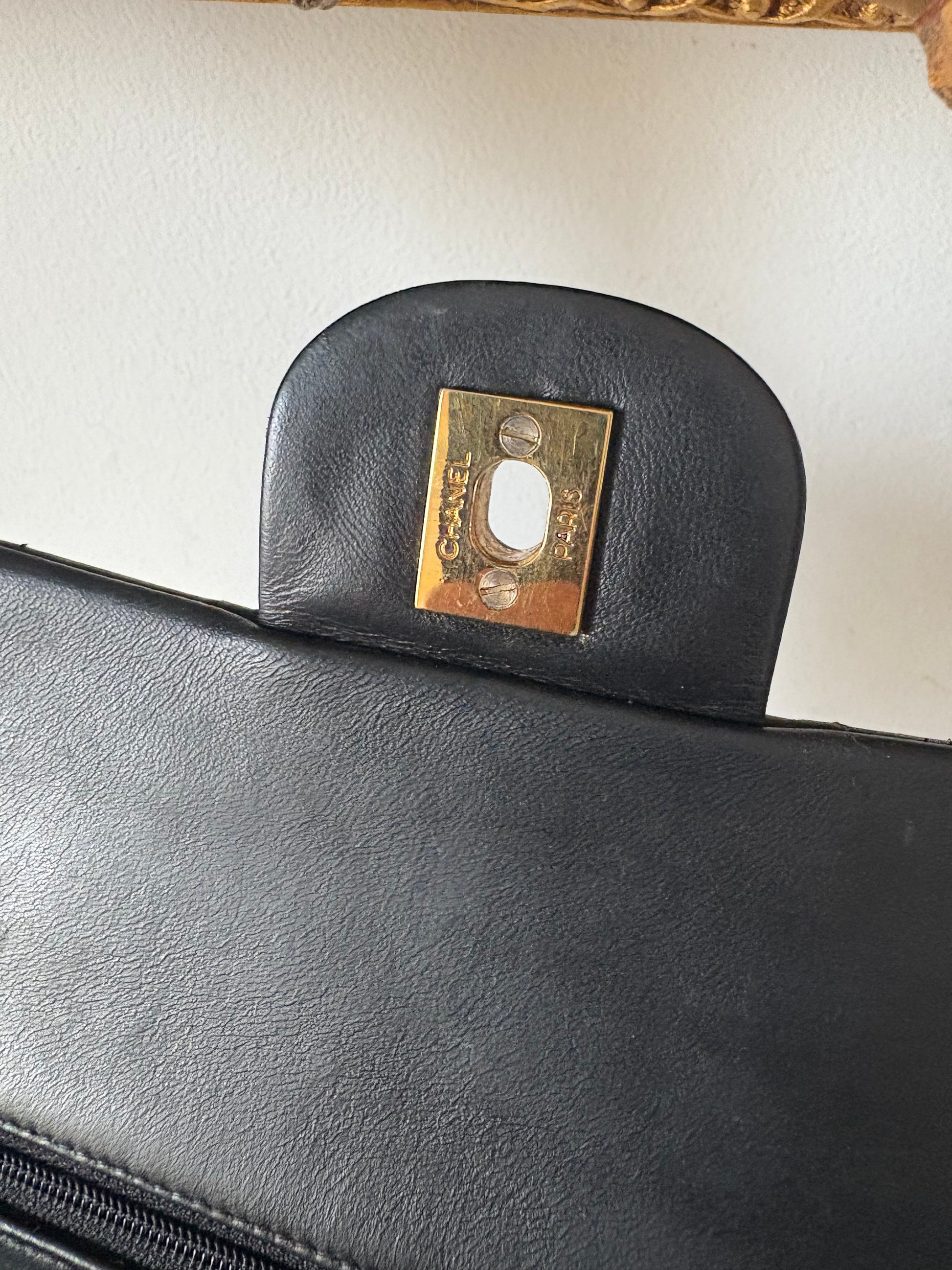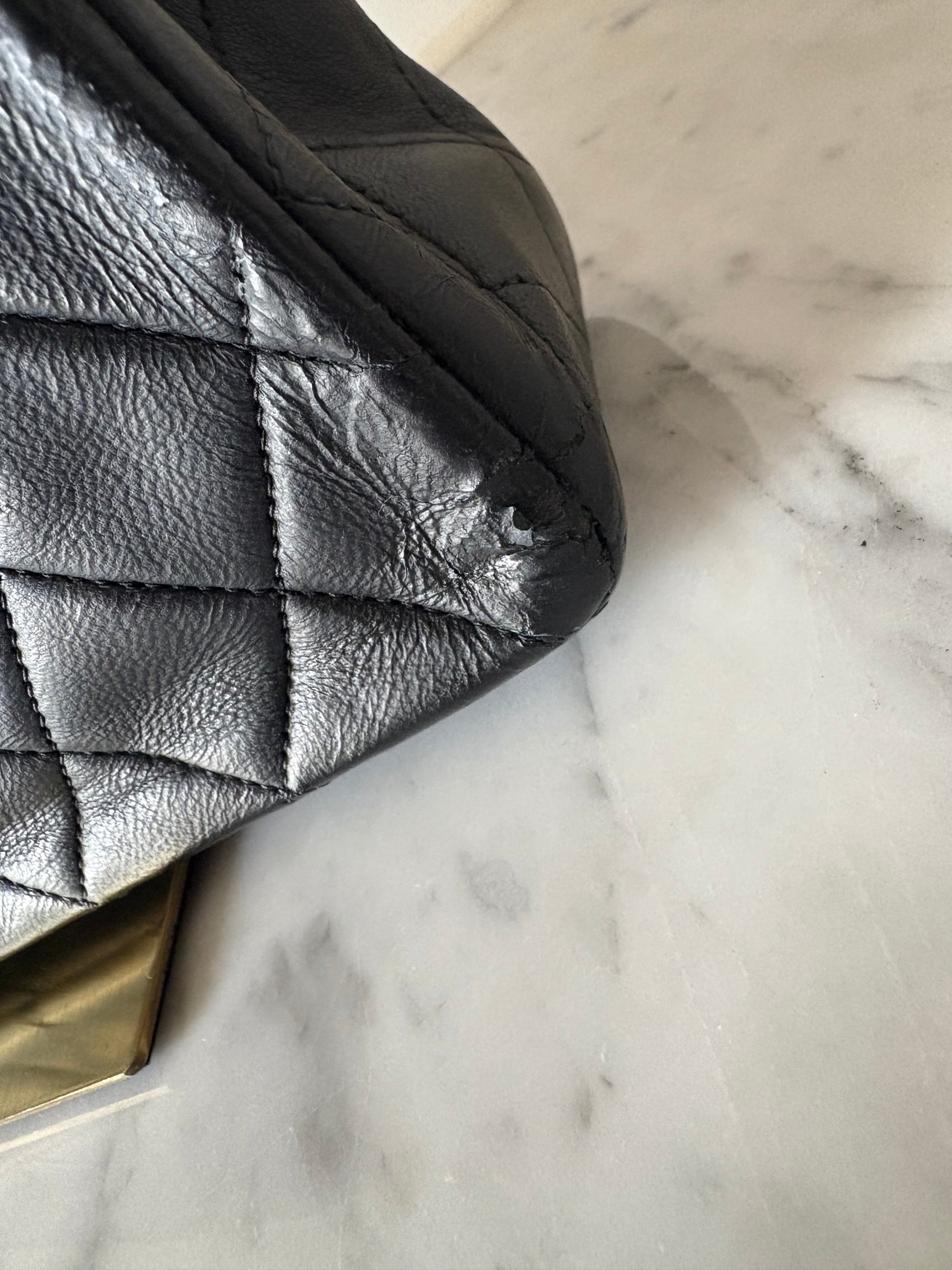 This Classic is from the 91’ - ‘94 period. The bag has been worn and shows signs of wear; mostly on the sides of the bag, where there have been restorations done on the leather. It has been done nicely, and overall the bag looks beautiful. The structure is still very good. The leather restorations might need a touch-up in the near future. The hardware shows some normal wear & tarnish as well.