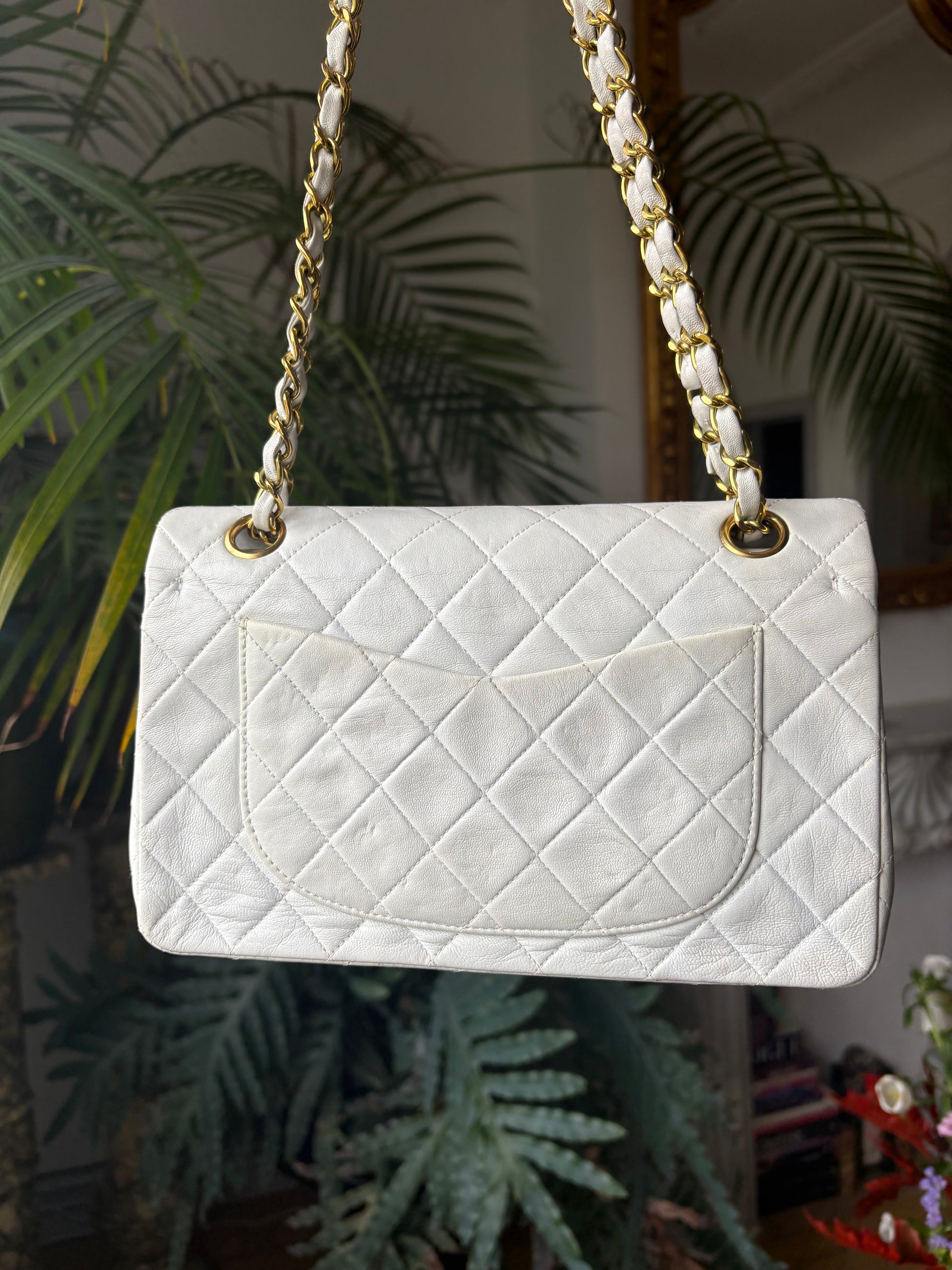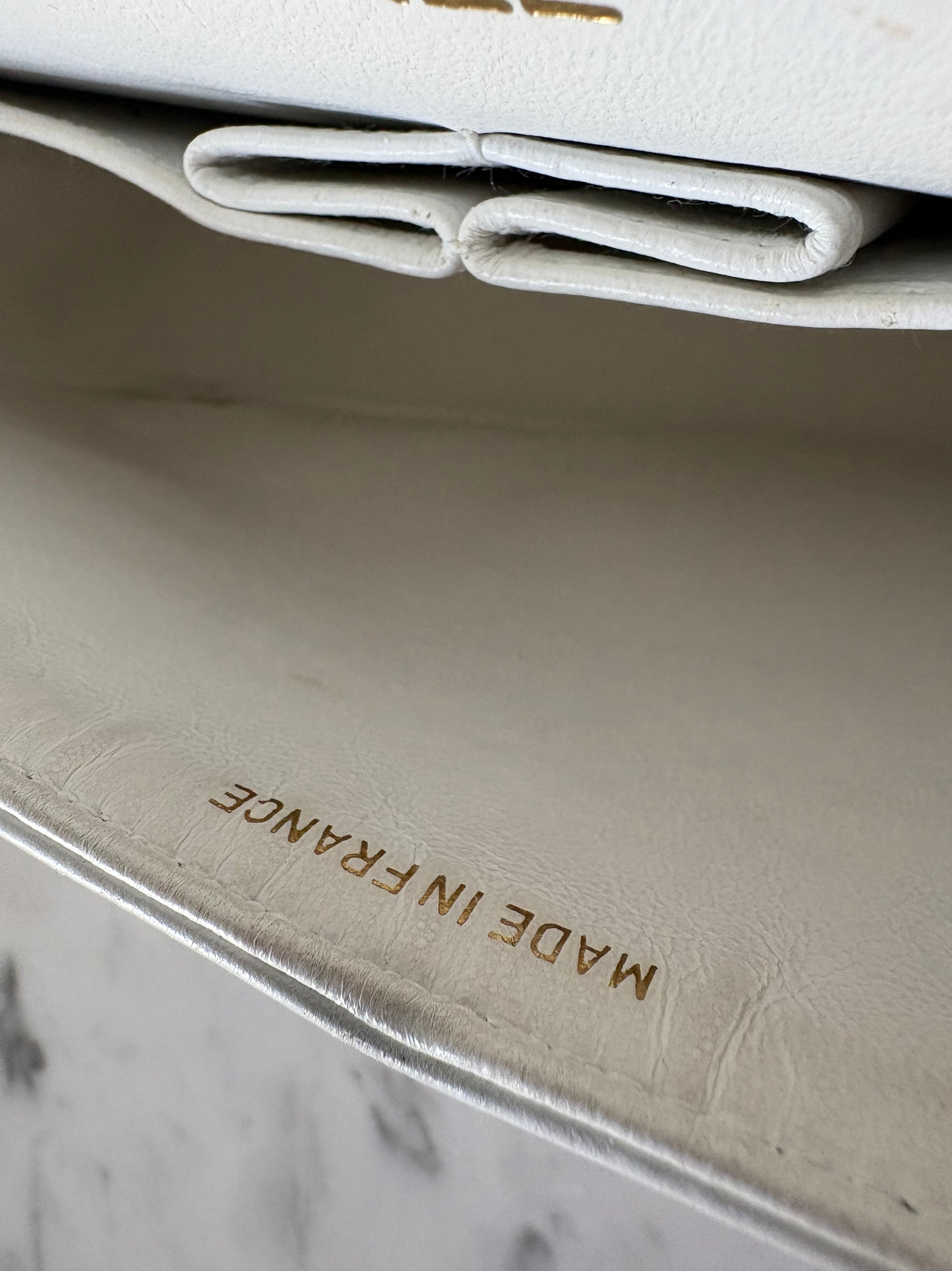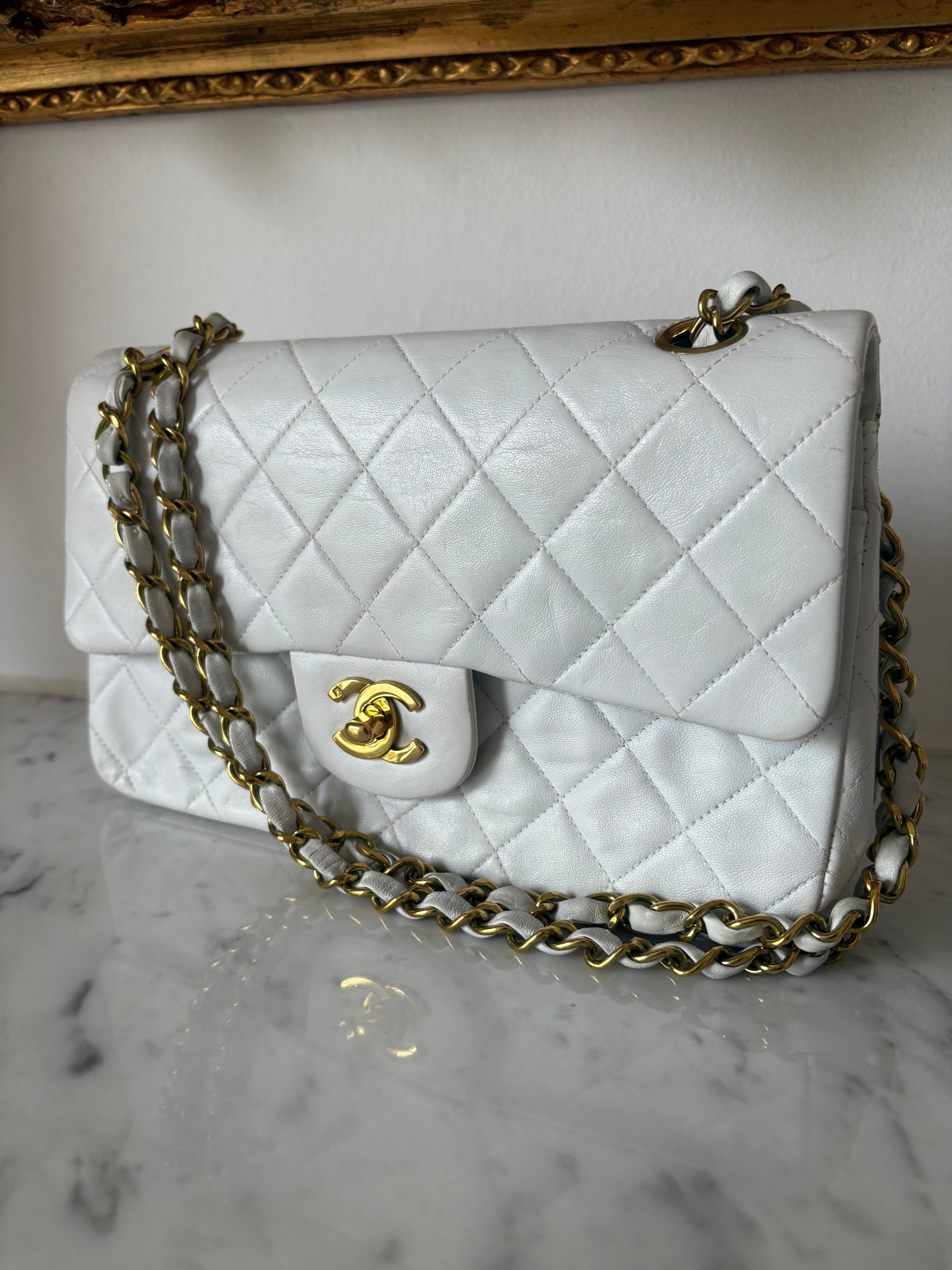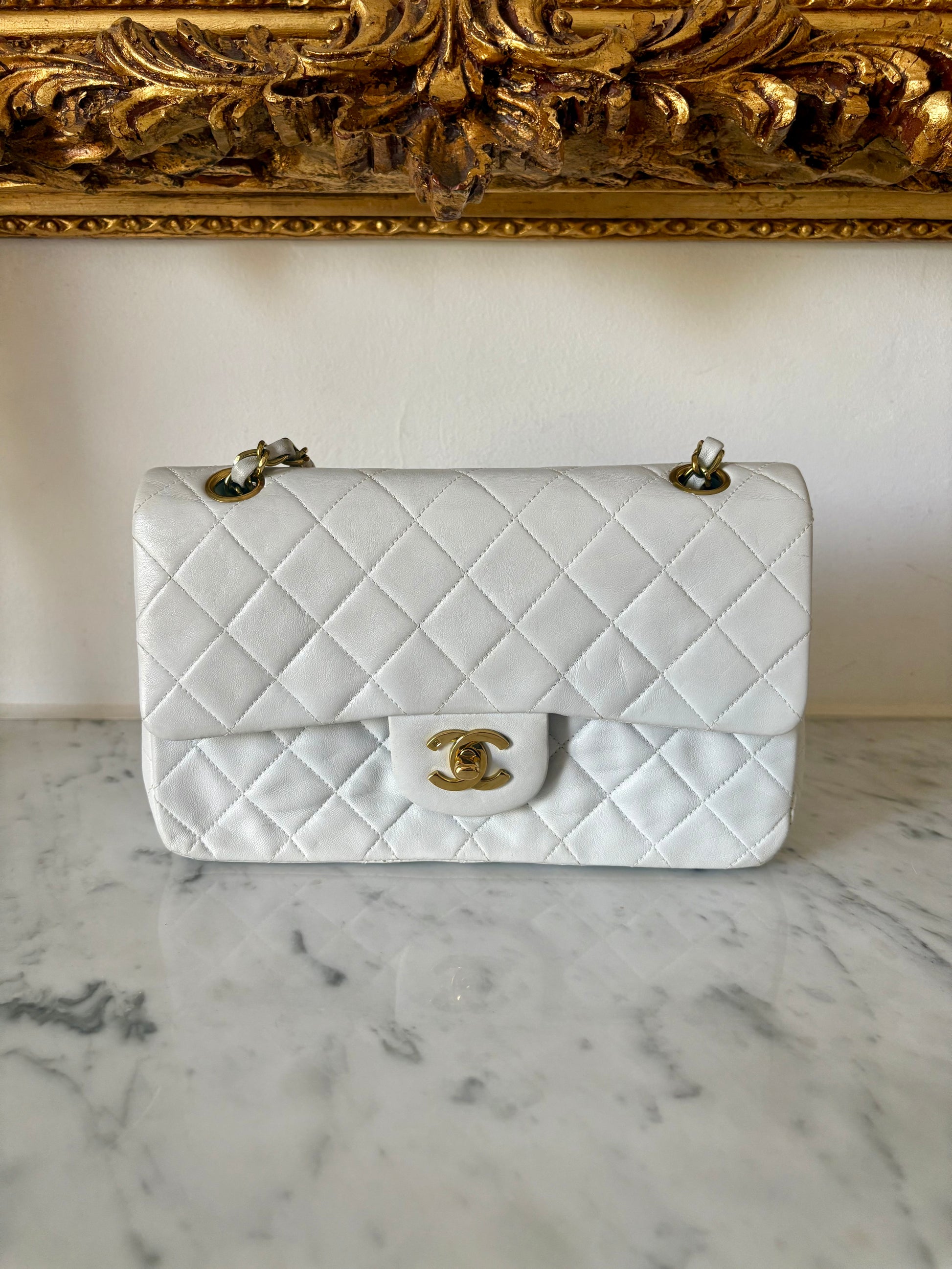 This is the small double flap in lambskin leather, featuring 24-karat gold plated hardware.