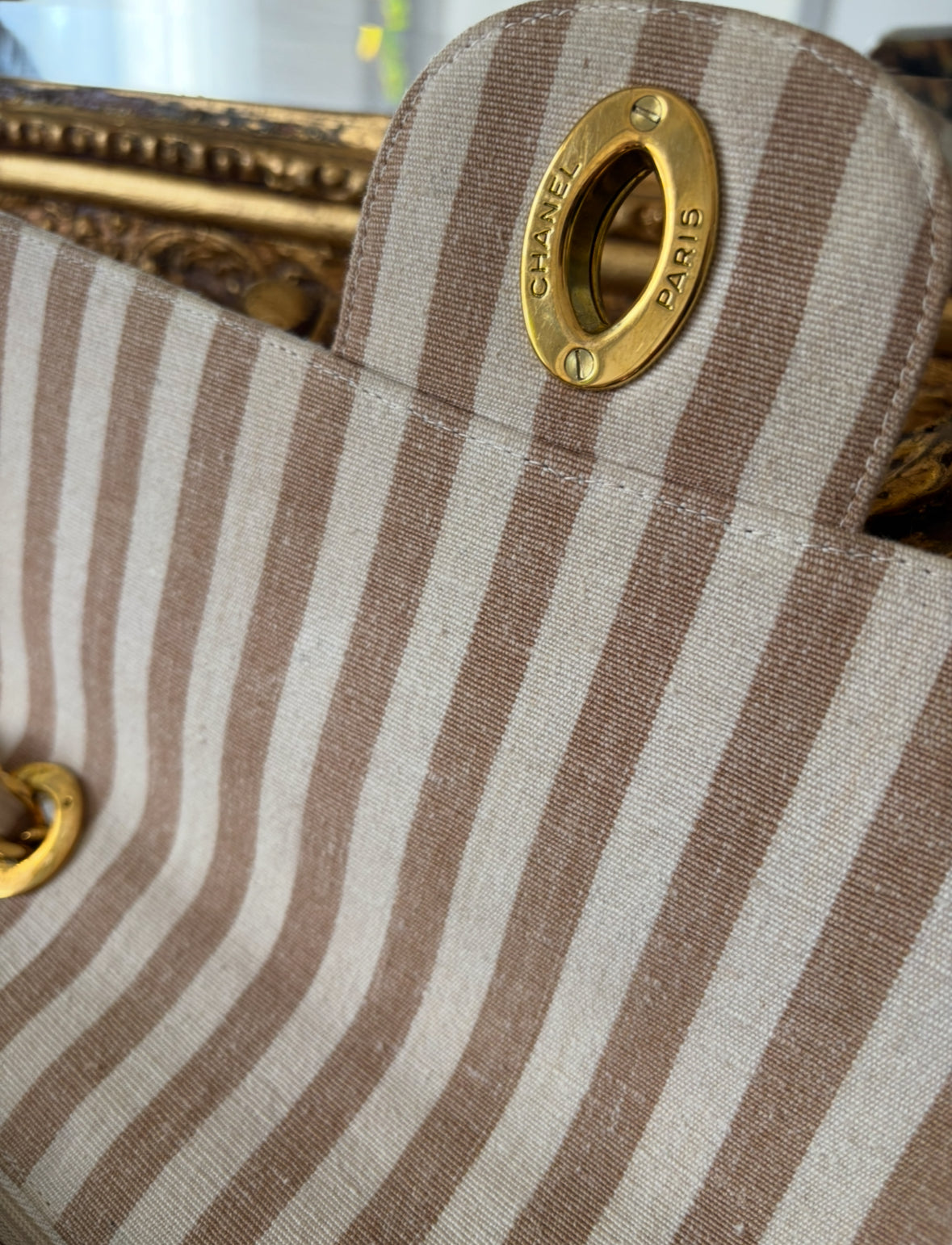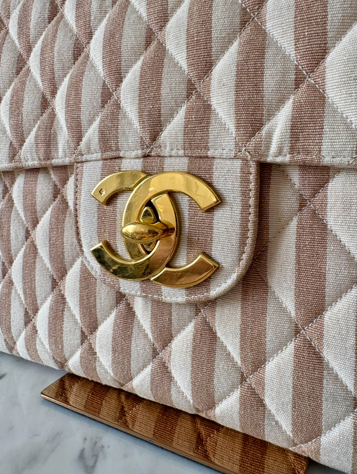 This vintage beauty is a lovely, summery twist on the classic Jumbo we all love! The bag is from the mid-‘90s, and is made out of a sturdy cotton material, in cream and pink-ish beige stripes. This is a single flap bag, making it a lighter alternative to the double flap Jumbo. It features the amazing, 24-karat gold plated hardware with giant CC logo ✨