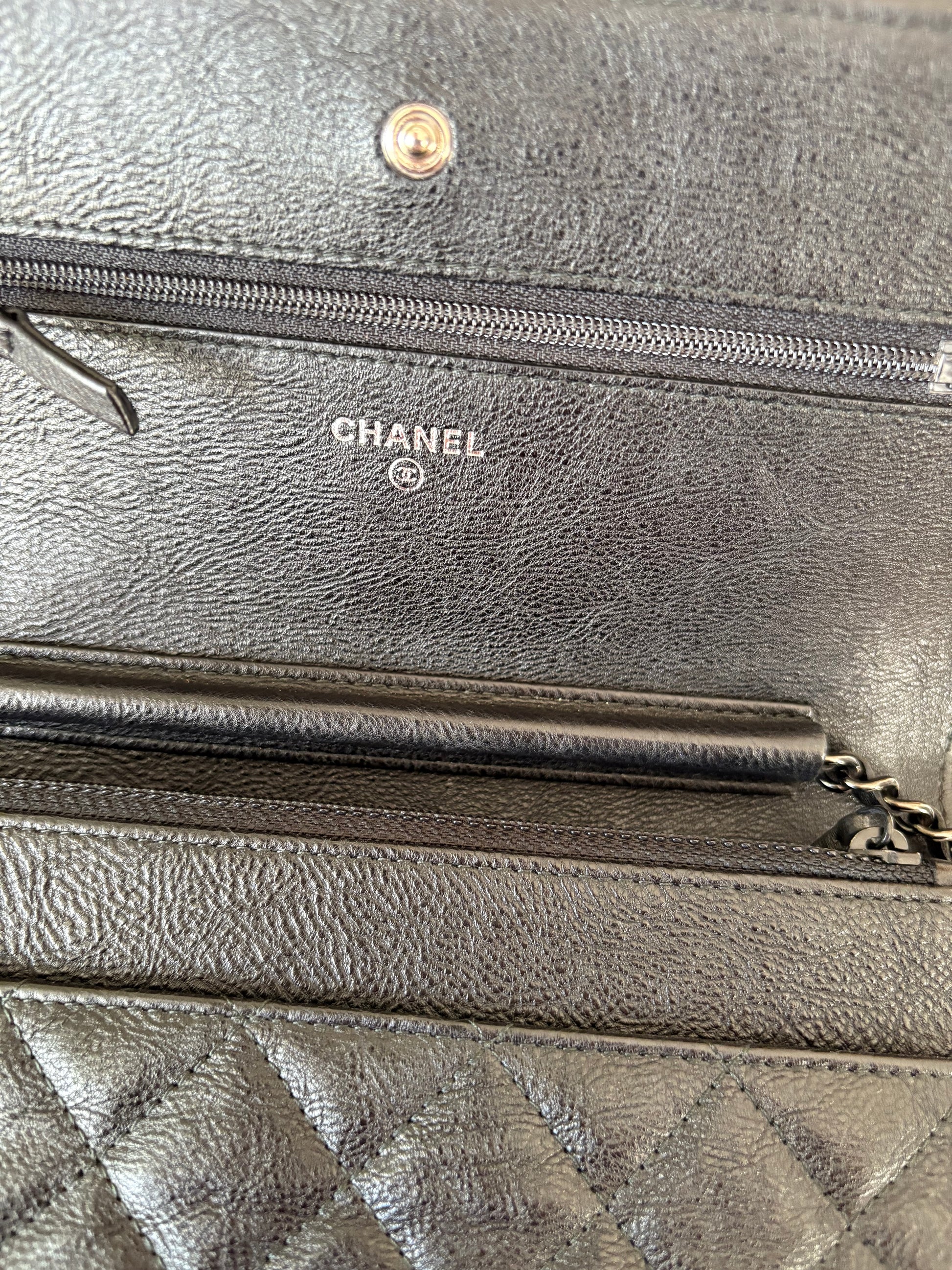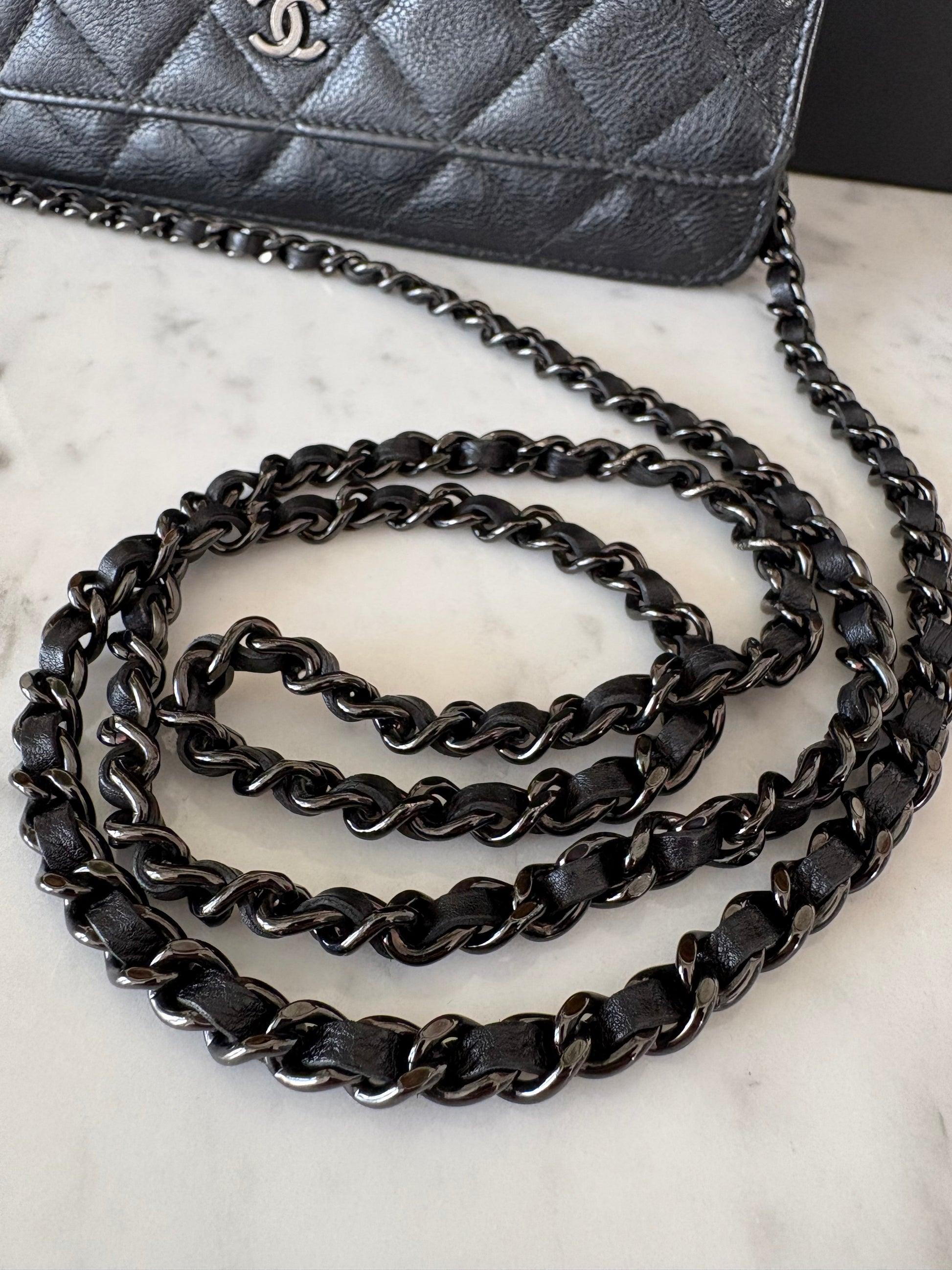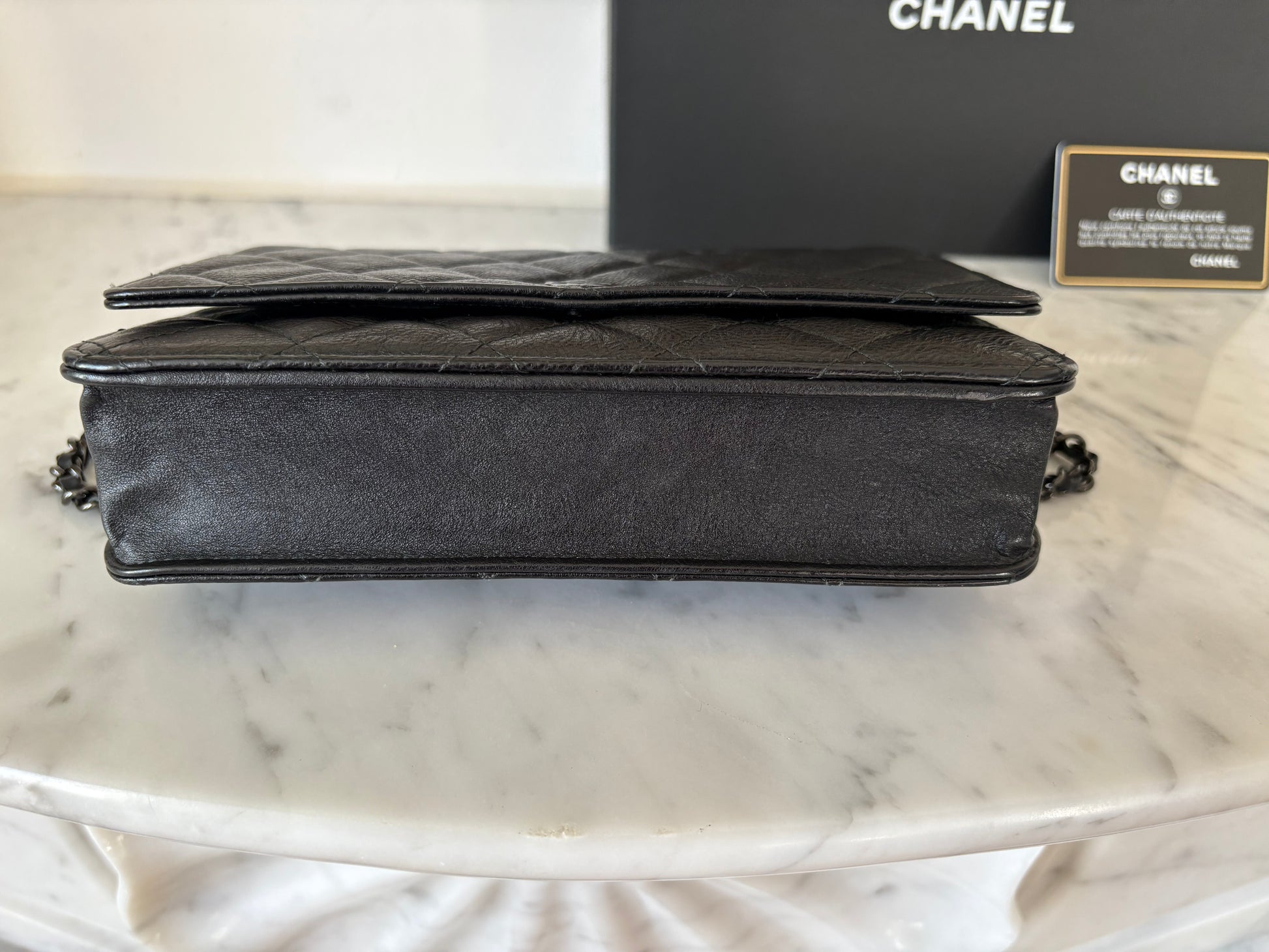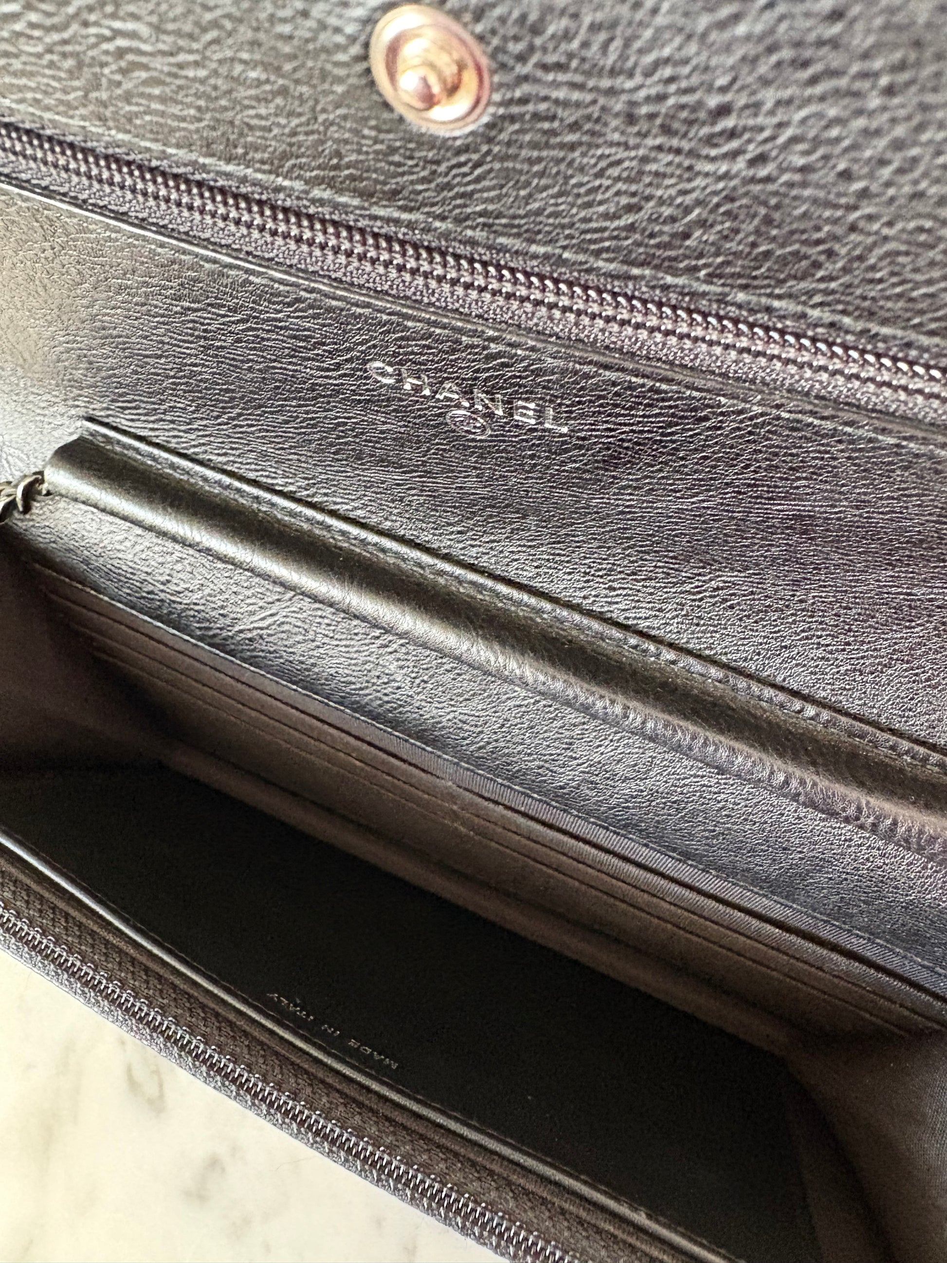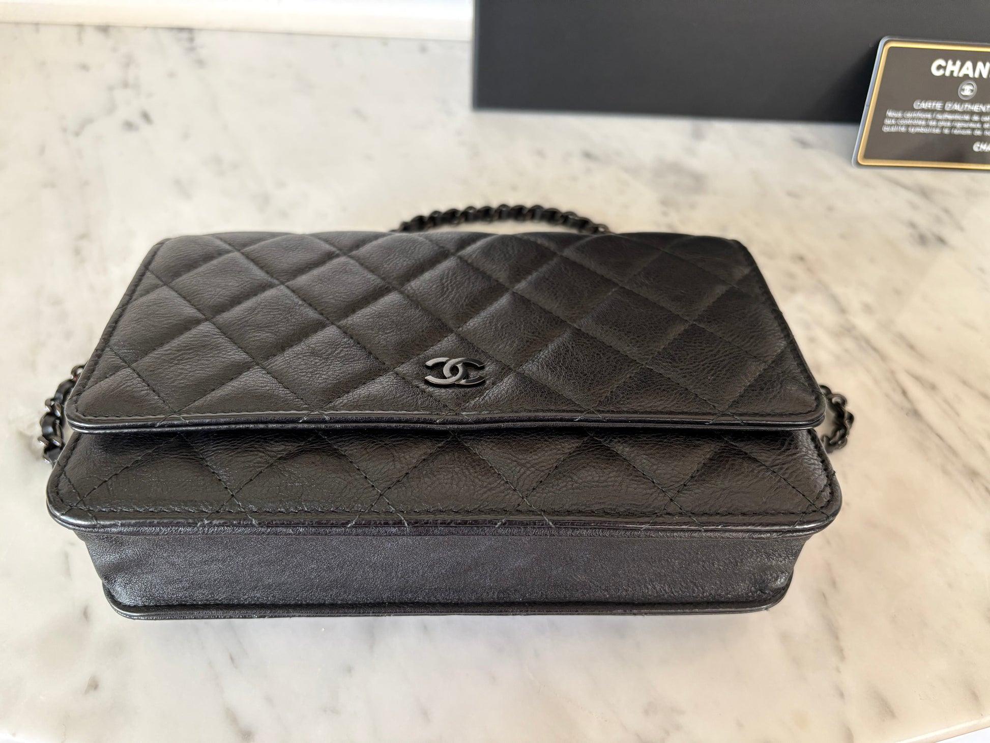 This is a gorgeous black on black edition of Chanel’s classic WOC. It’s made out of crumpled calfskin and features black coated hardware.