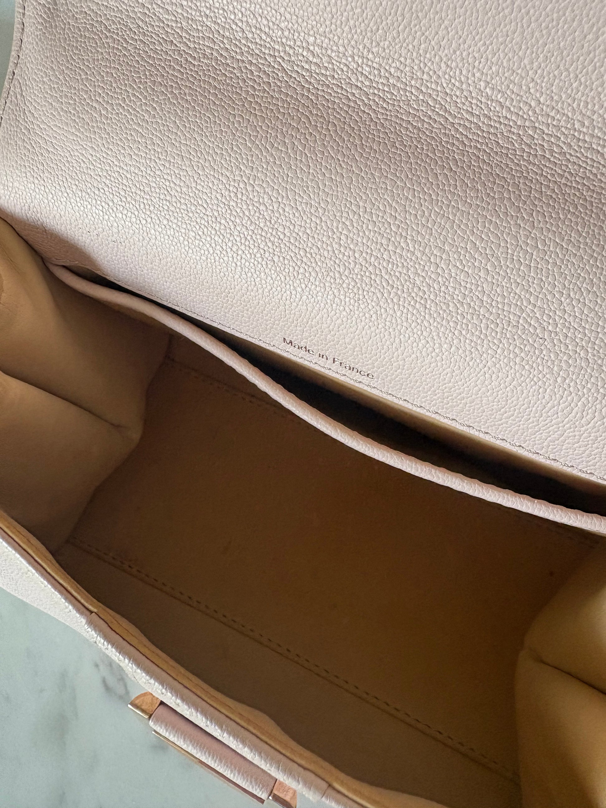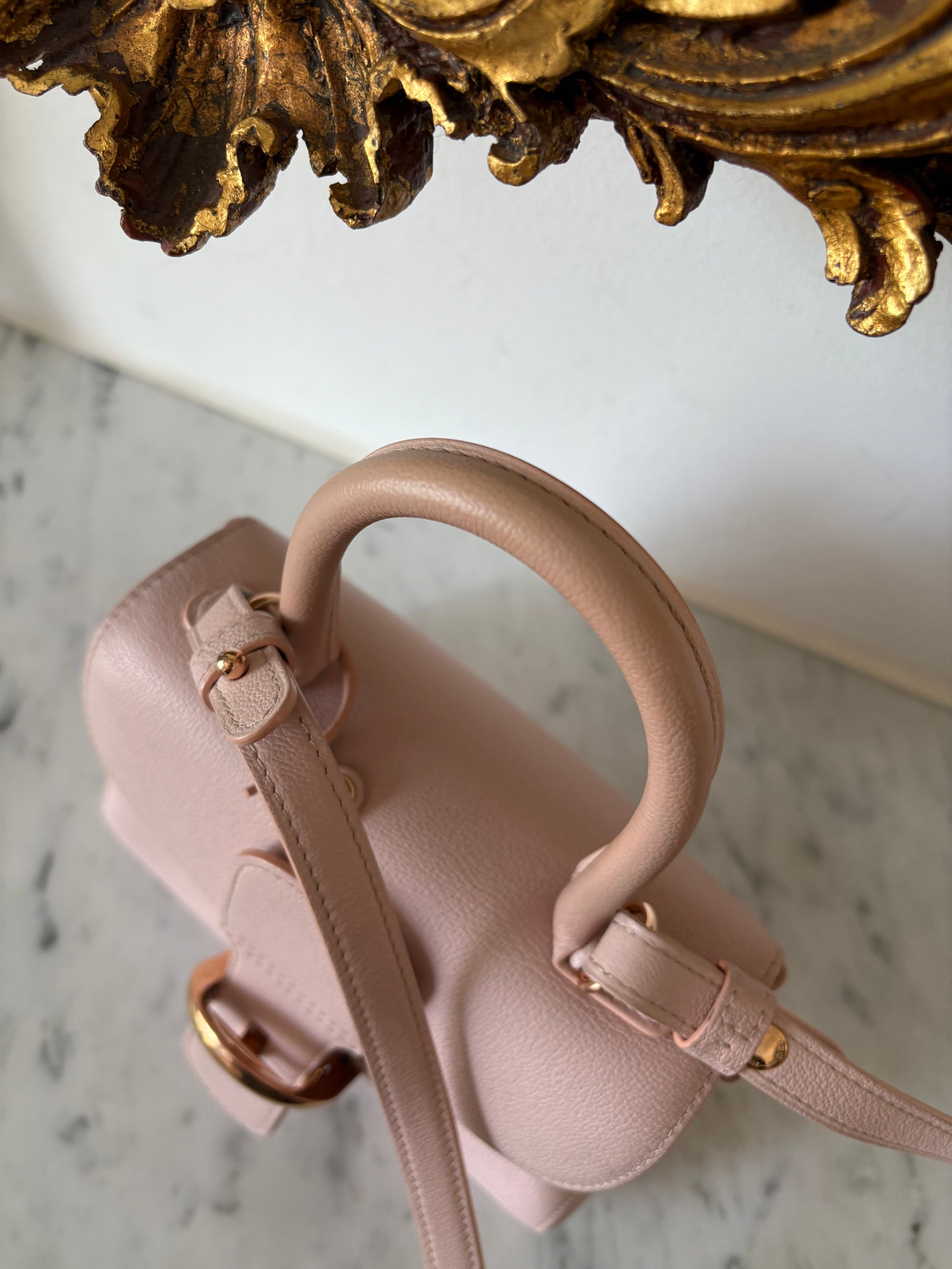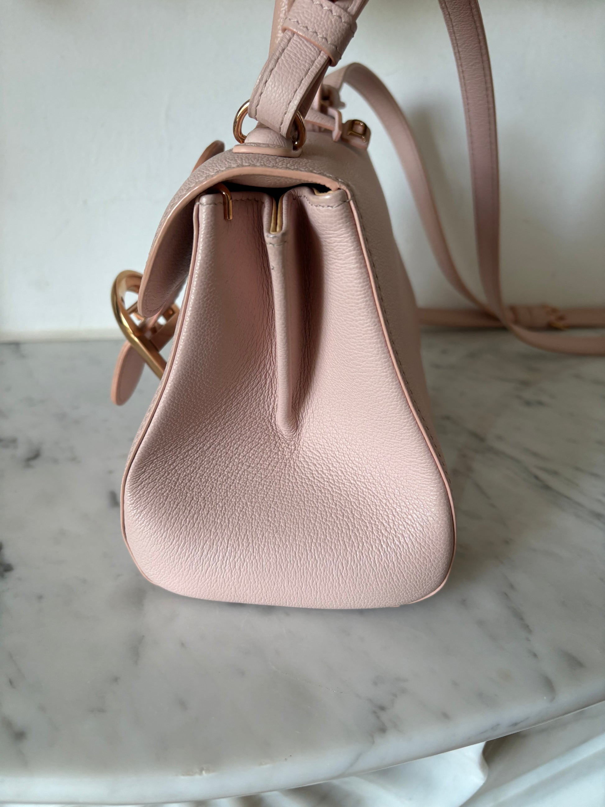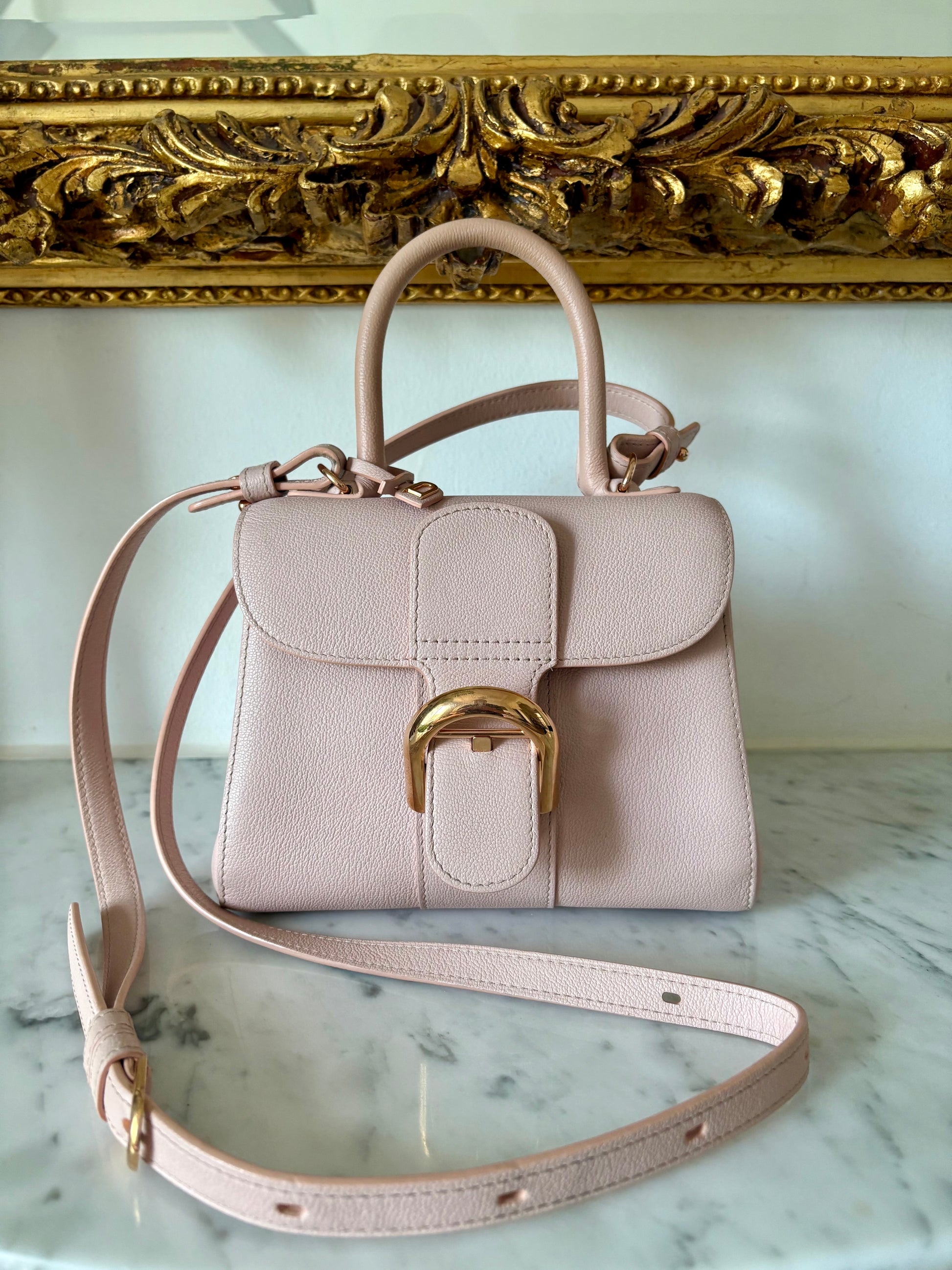 This is the mini size Brillant, which is still quite spacious for a mini bag. The strap allows for crossbody wear, making this classic a practical beauty. The gold hardware combined with the soft pink is just perfect!