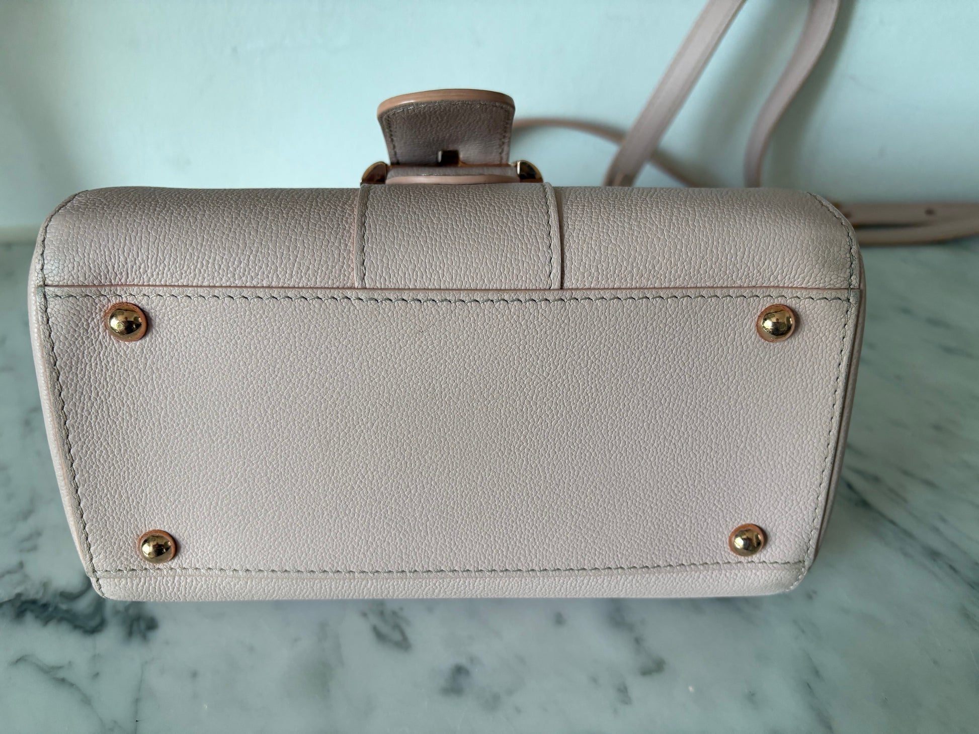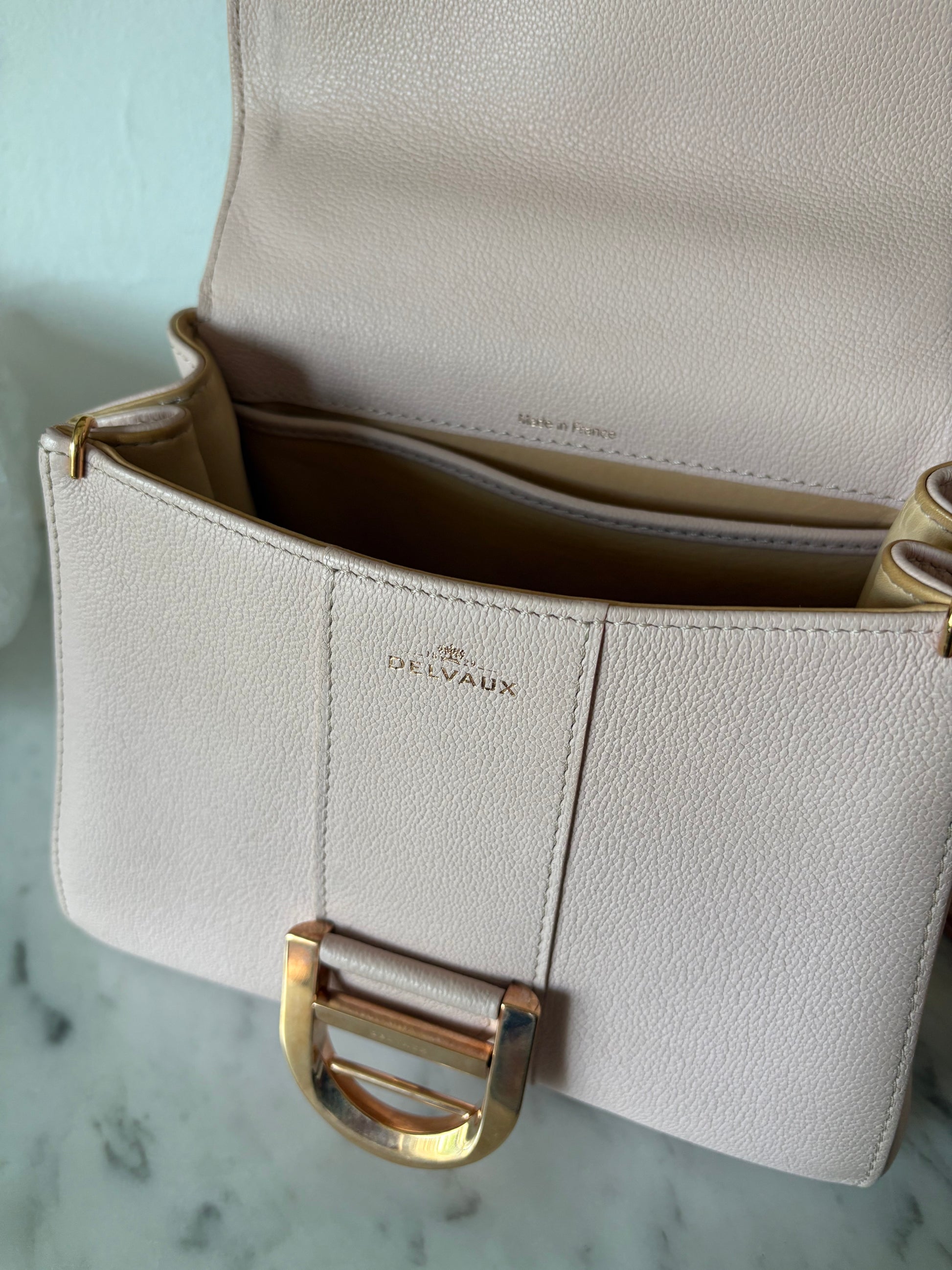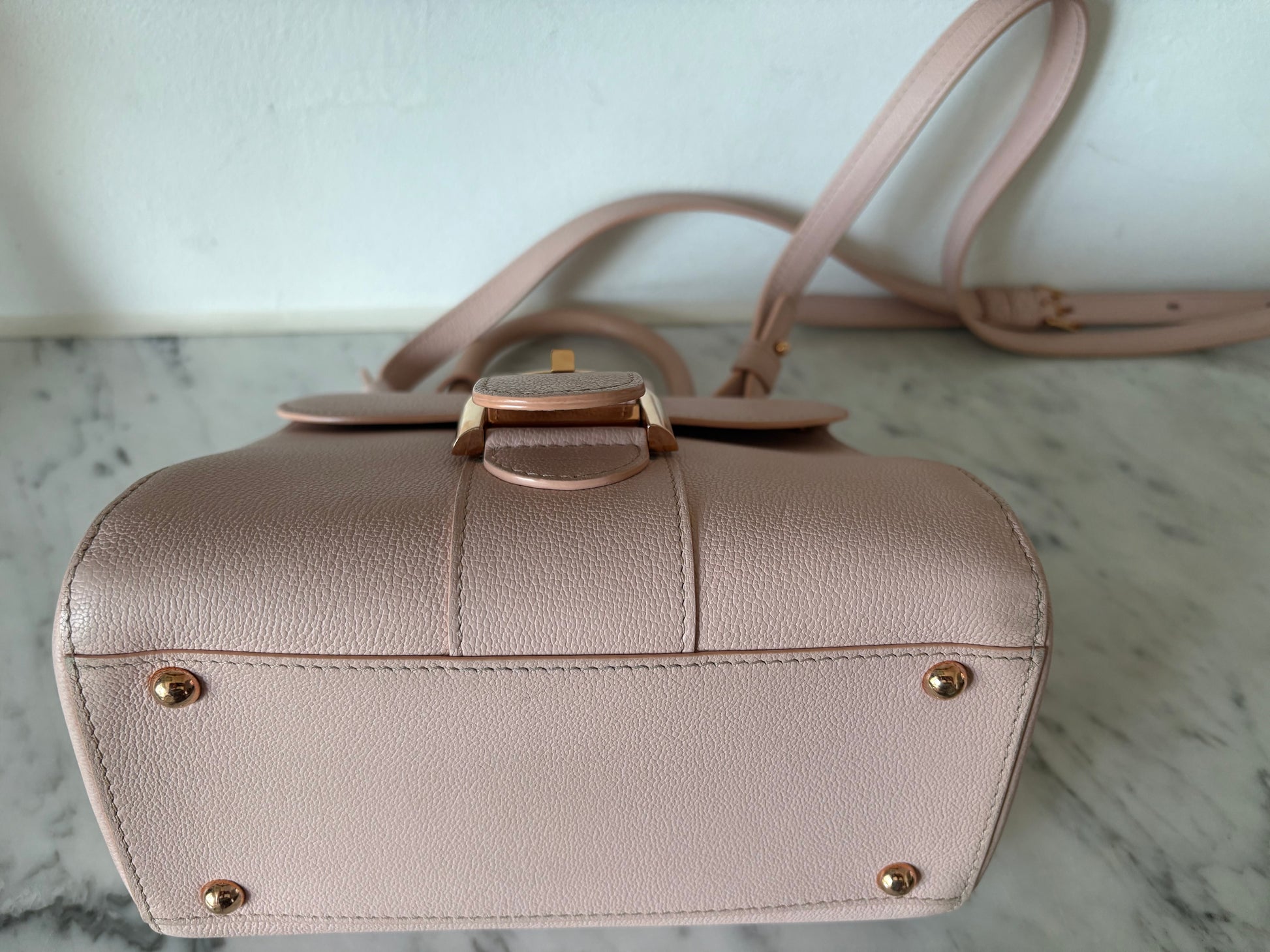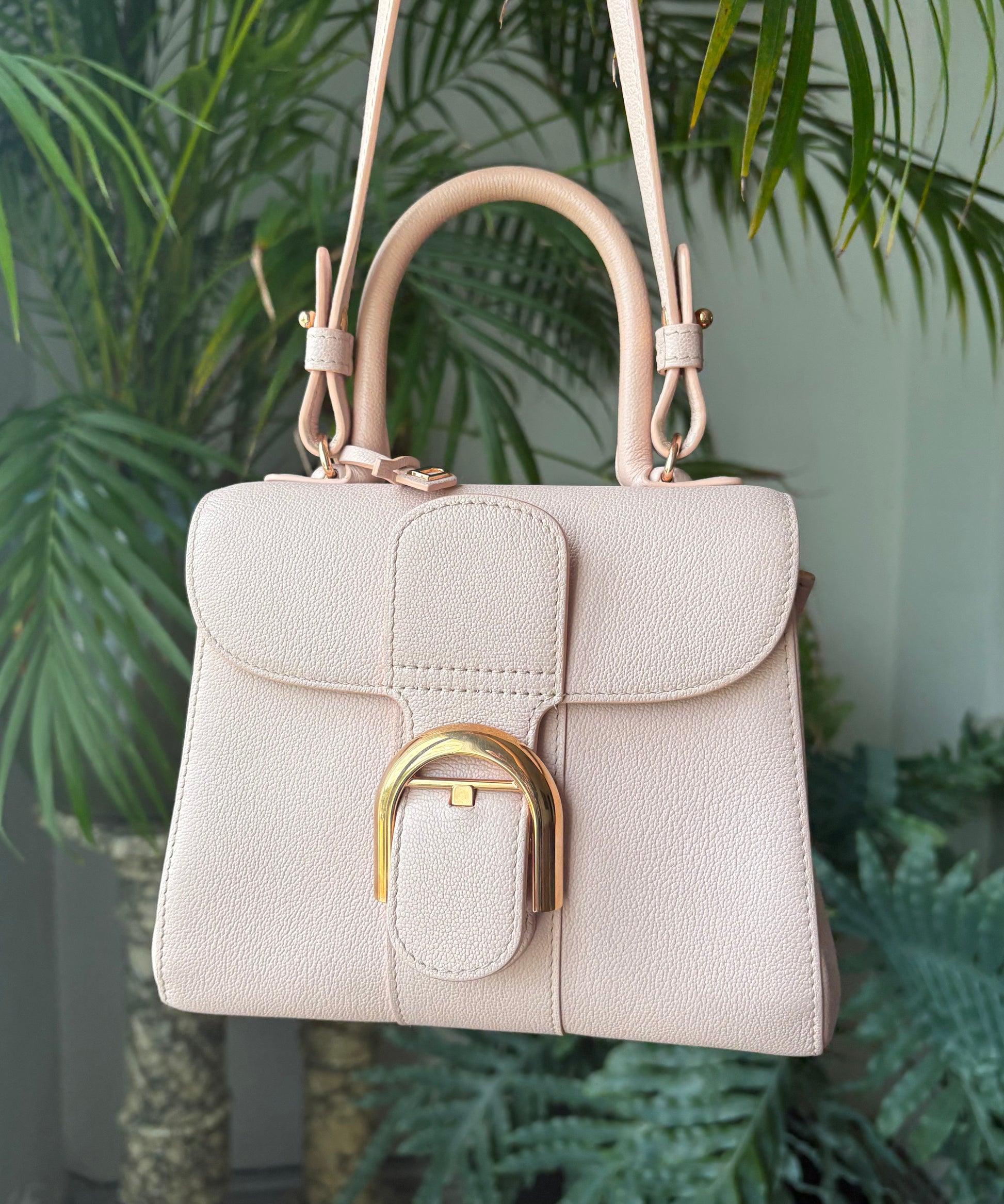 This is the mini size Brillant, which is still quite spacious for a mini bag. The strap allows for crossbody wear, making this classic a practical beauty. The gold hardware combined with the soft pink is just perfect!