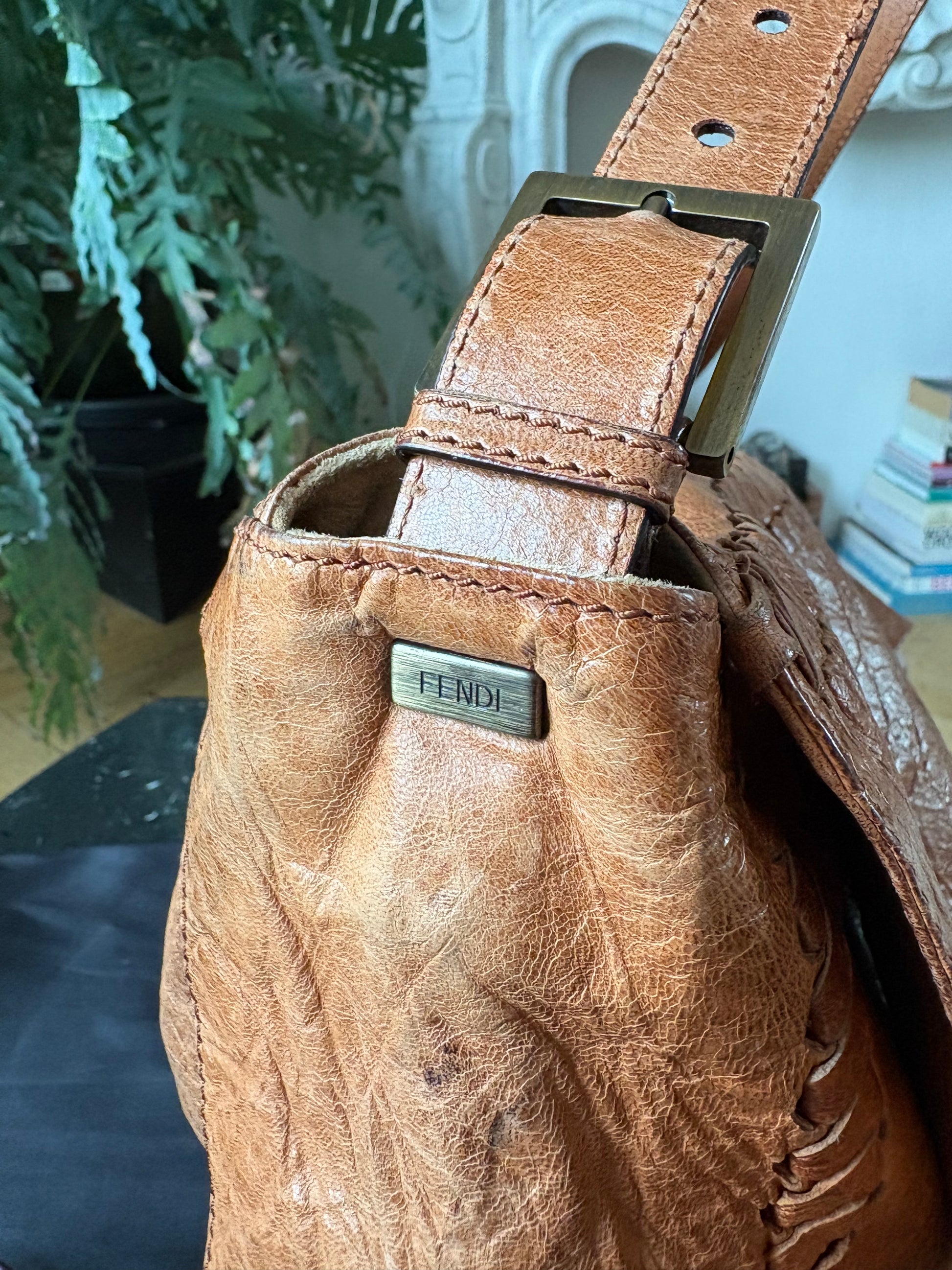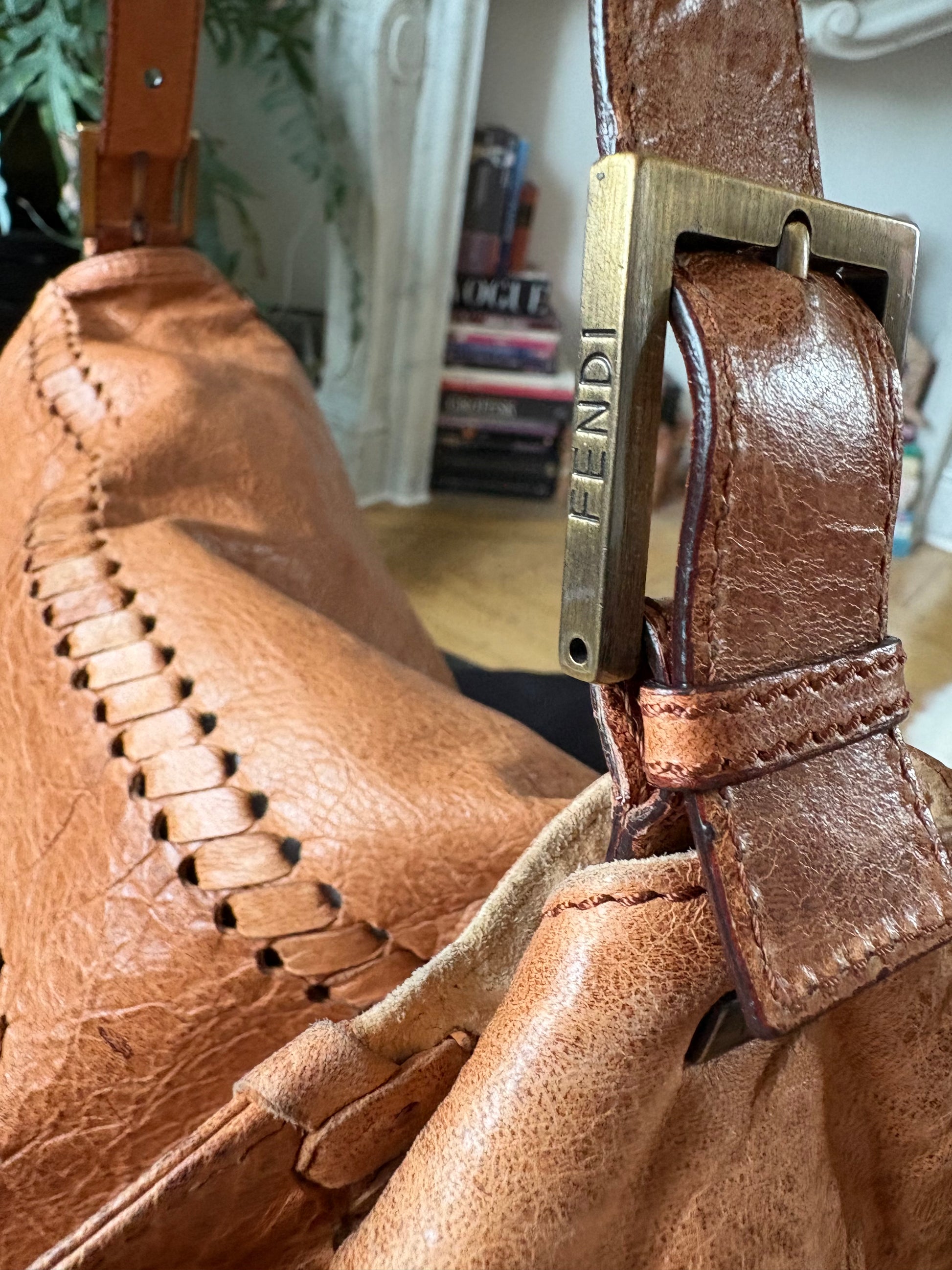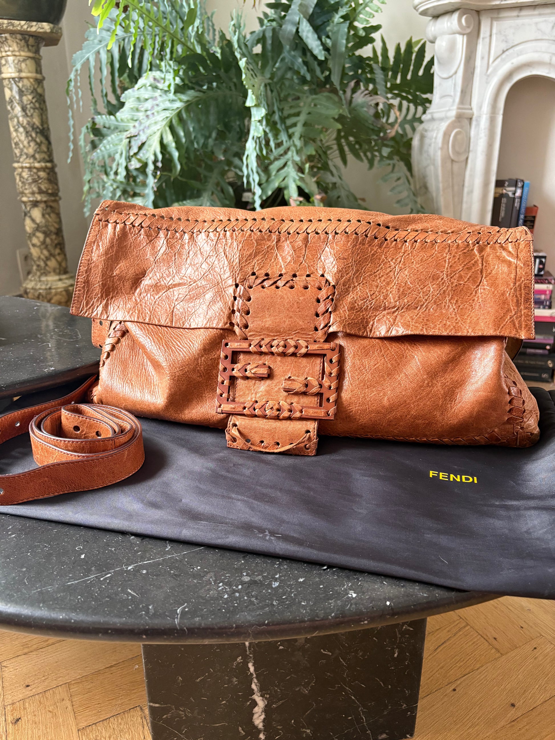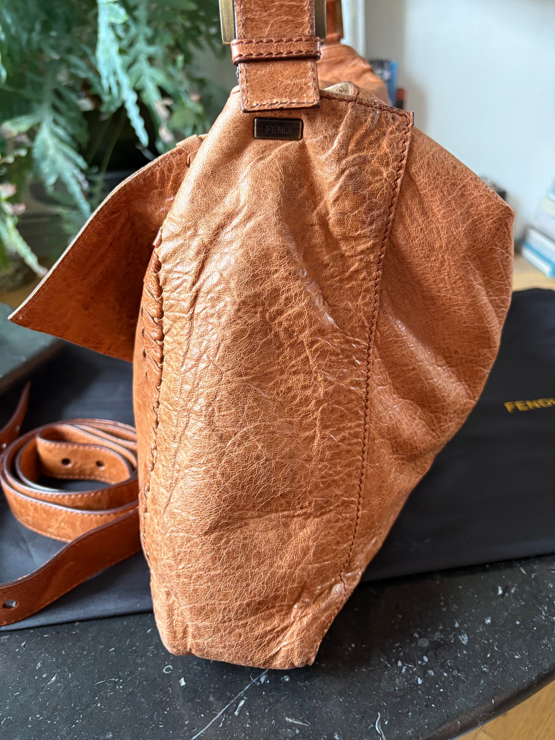 This super cool Fendi Baguette is huge, but still very practical. It is made out of soft & slouchy, camel coloured calf leather.