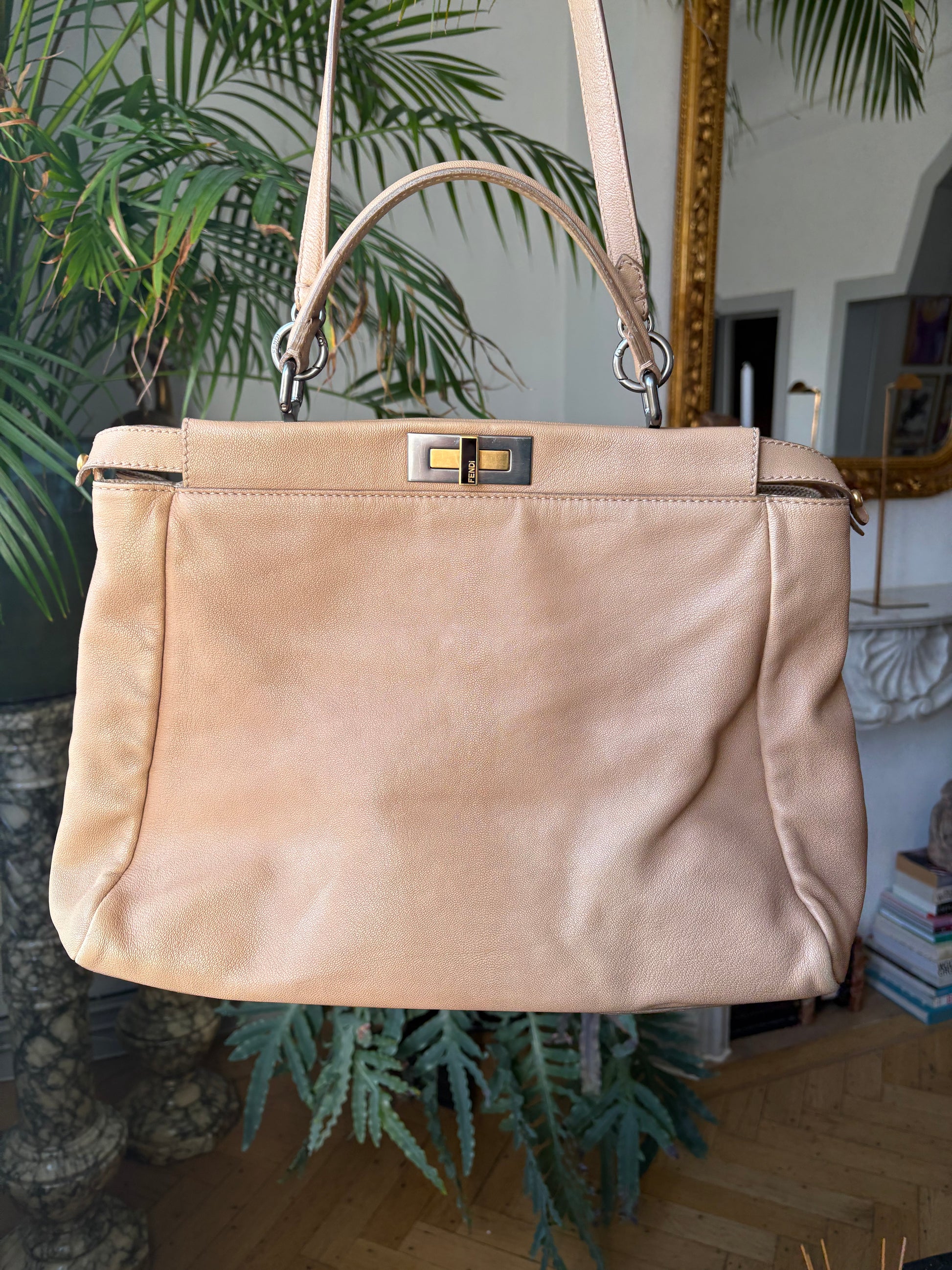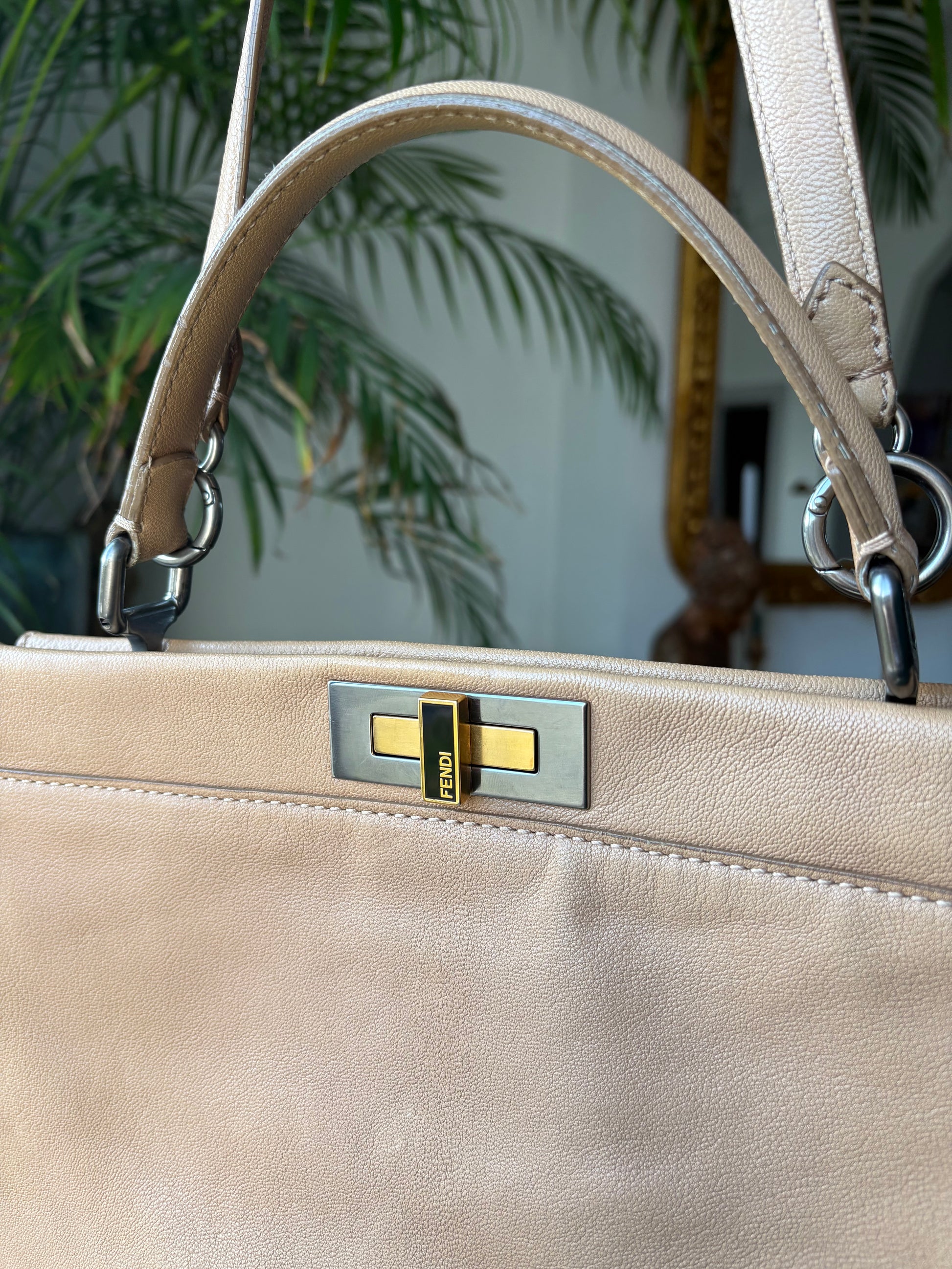 Large Fendi Peekaboo bag in beige leather and mixed hardware.