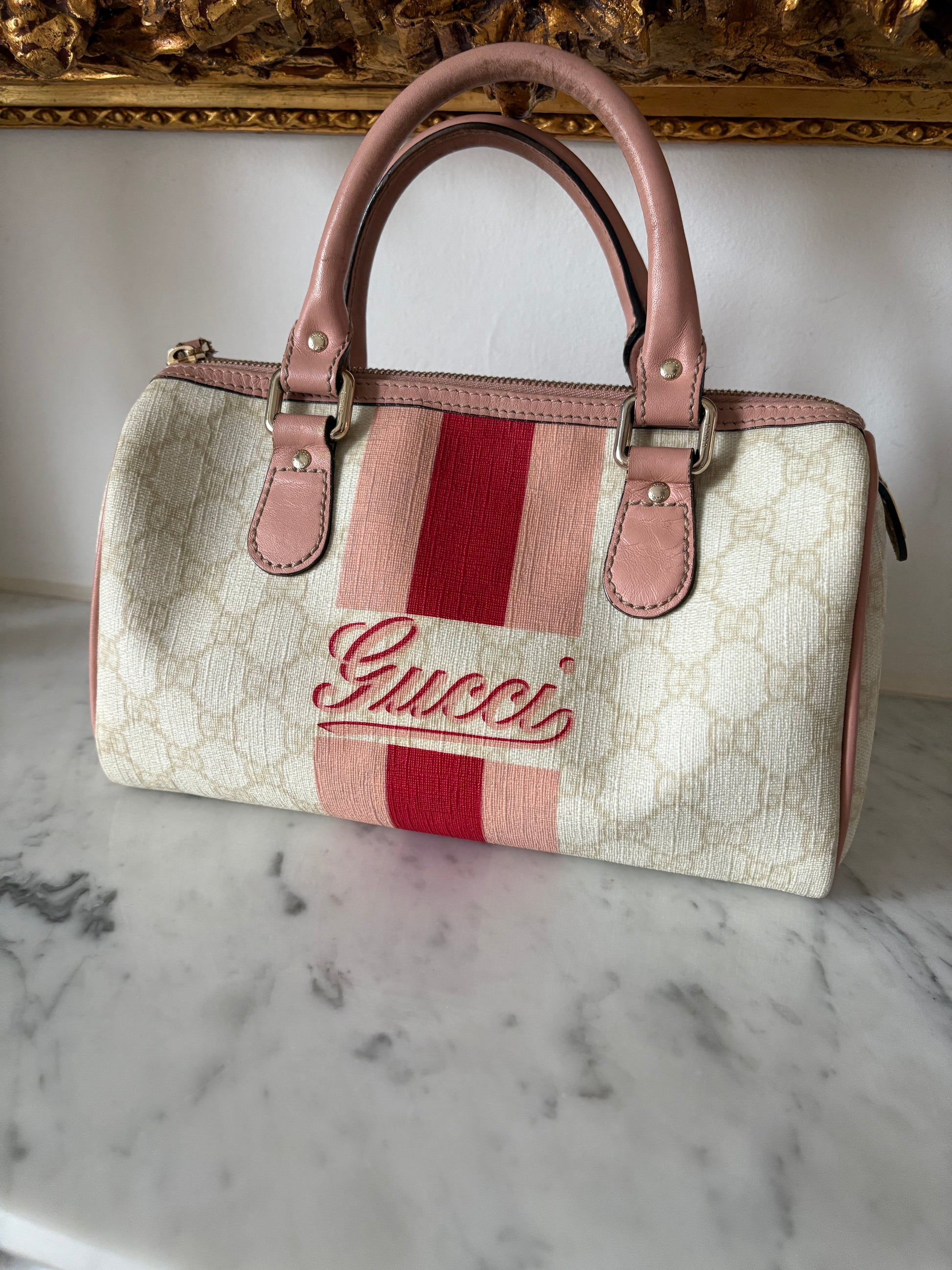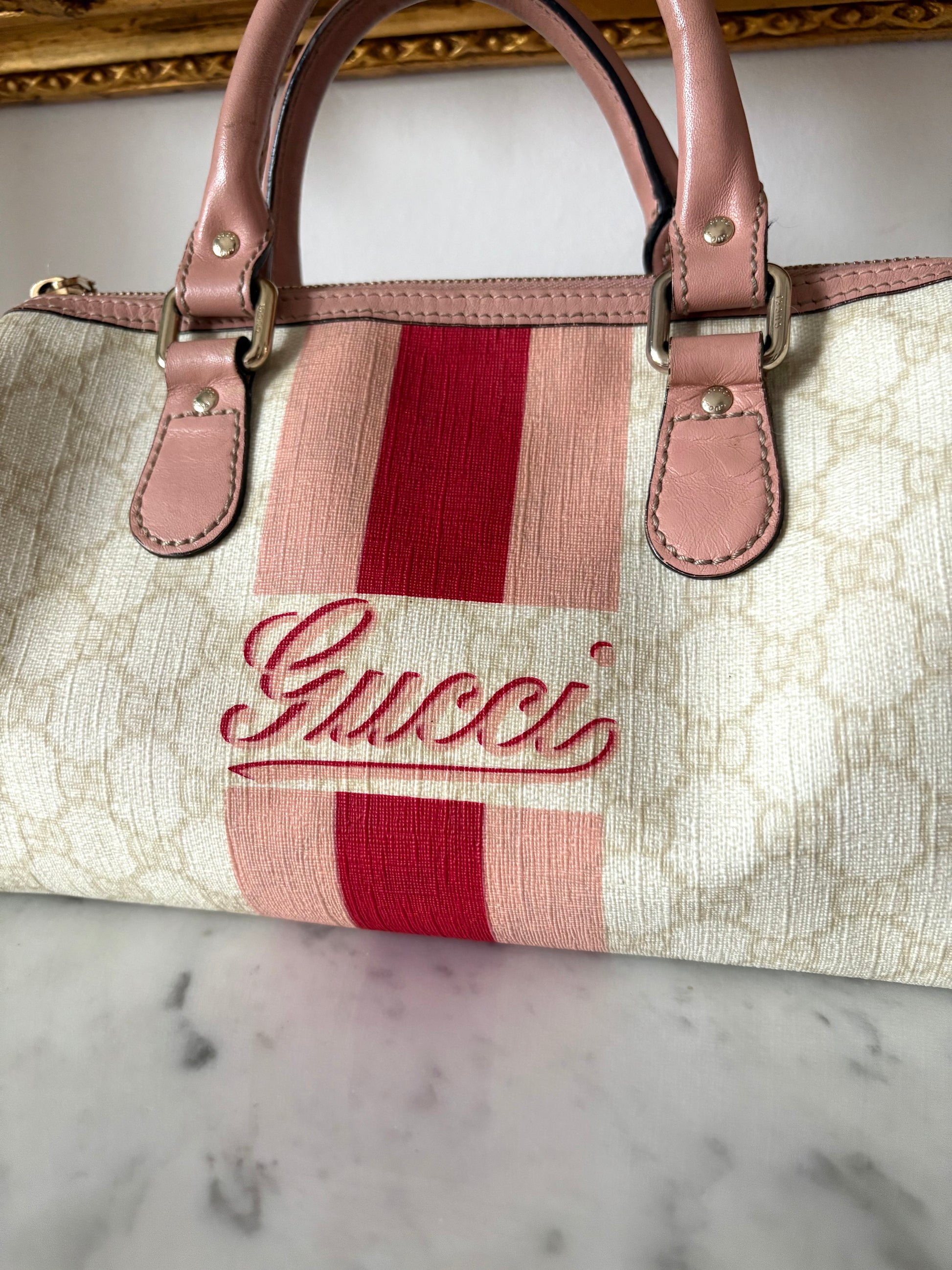 This is a limited edition of the Boston bag, featuring pink and red racer stripes on creamy white Gucci canvas. Fun, sporty & cute!
