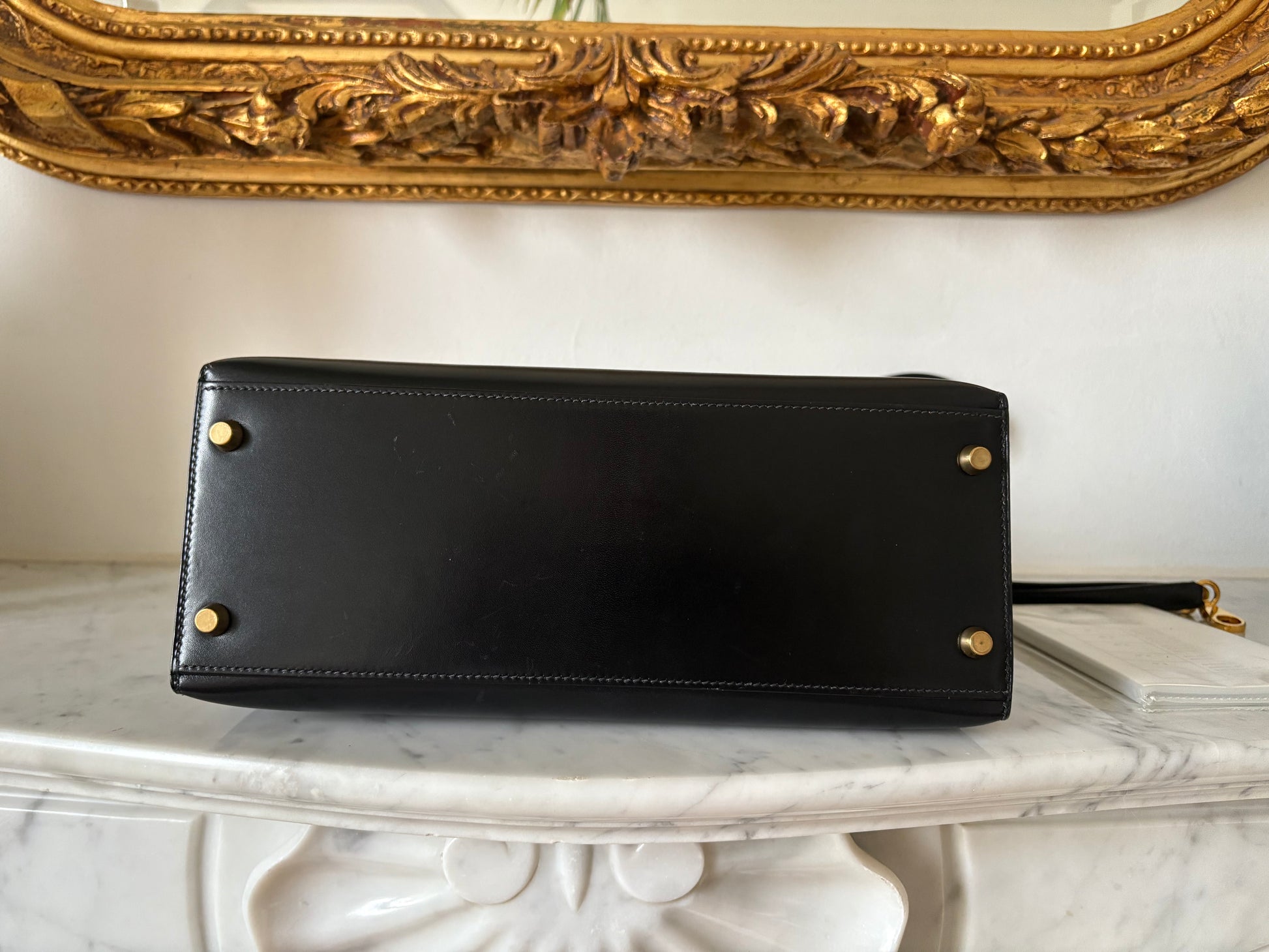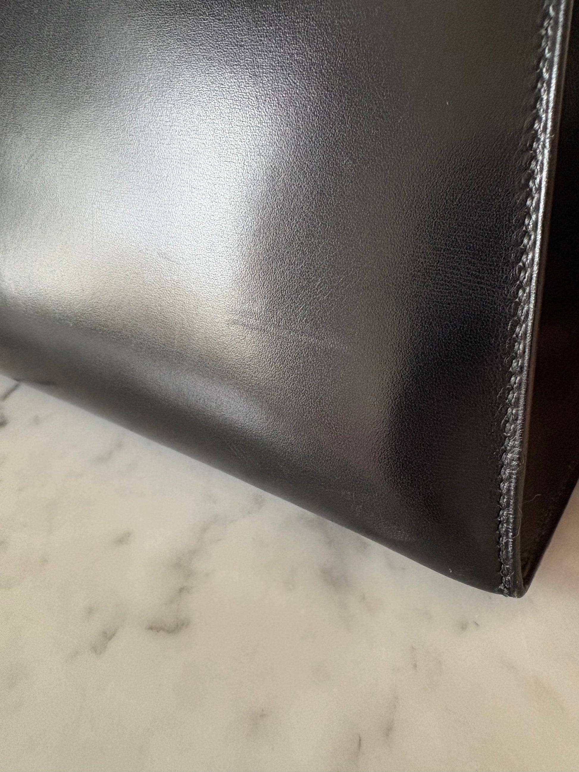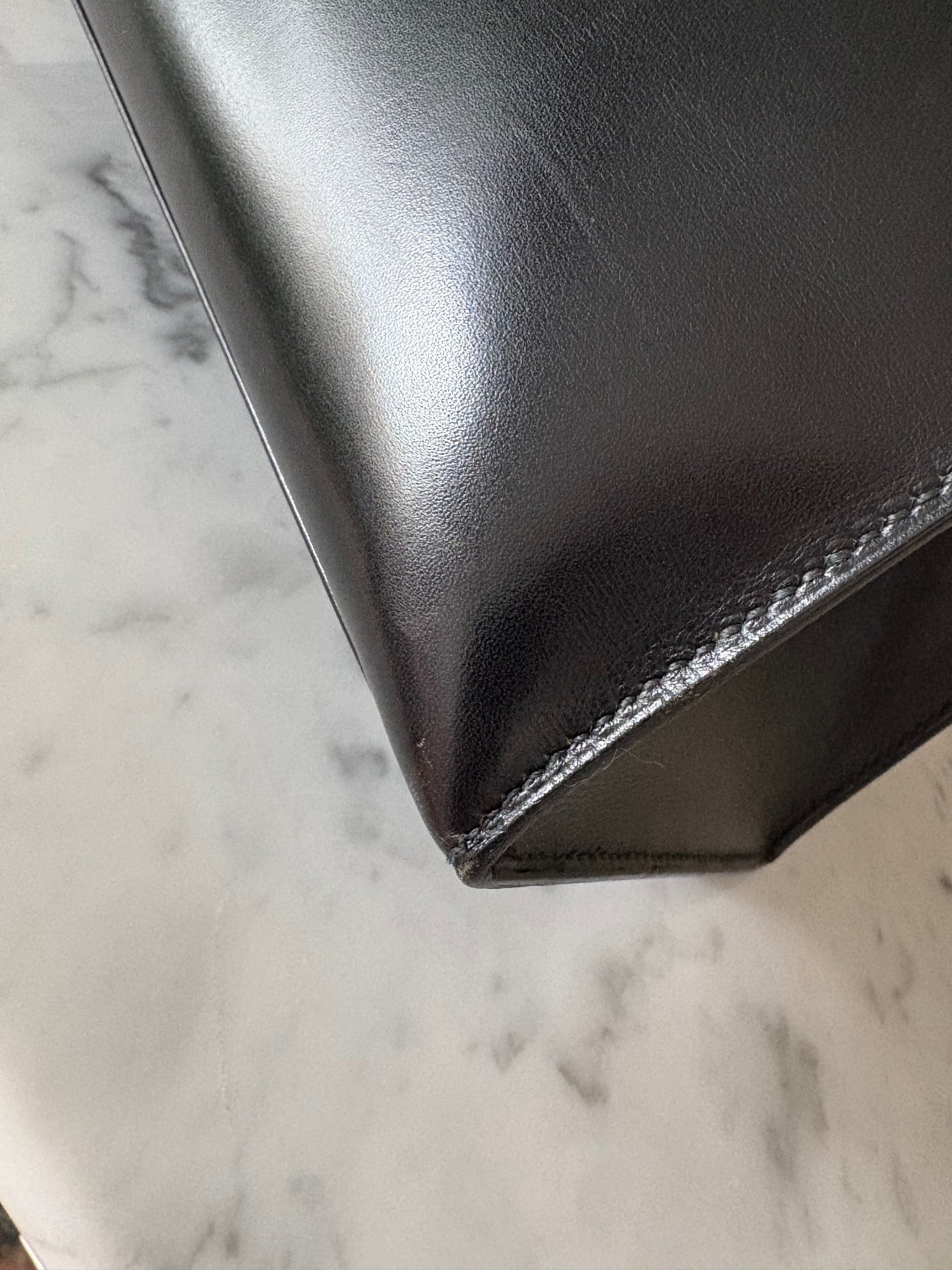 The size 28 is a perfect size to take with you day and/or night, and the optional shoulder strap gives it that convenient, slightly more casual vibe. The box leather and Sellier style gives the bag its rigid structure.