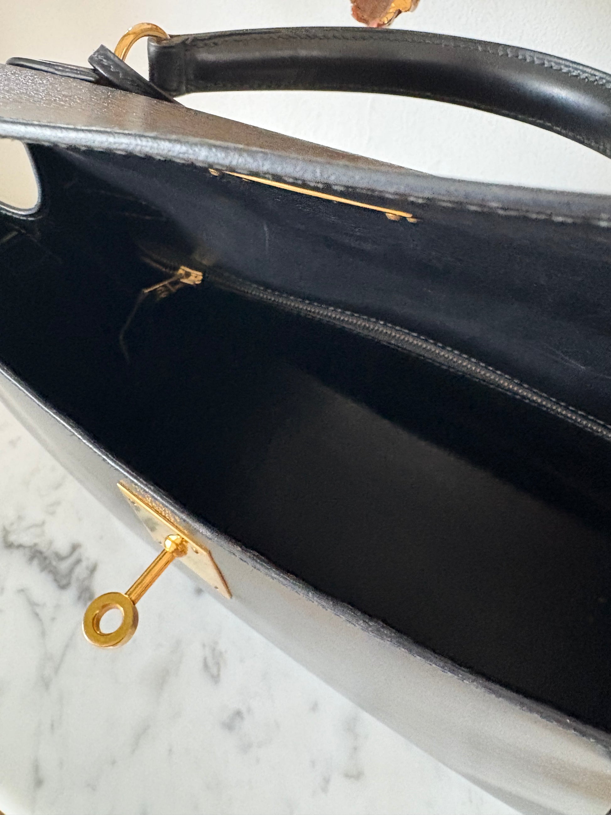 This Kelly is from 1993, so is considered vintage. However, it is in fantastic condition; structurally perfect, and the leather shows little signs of wear. There are some superficial scratches, and the hardware shows the inevitable micro scratches as well, but the leather shows no cracking at all, and is in beautiful, shiny condition. The bag has never been retouched in any way.