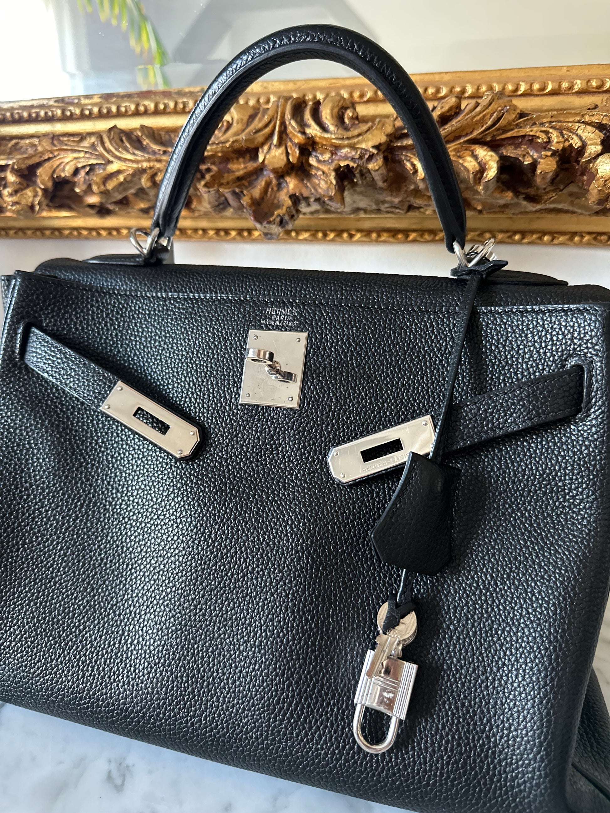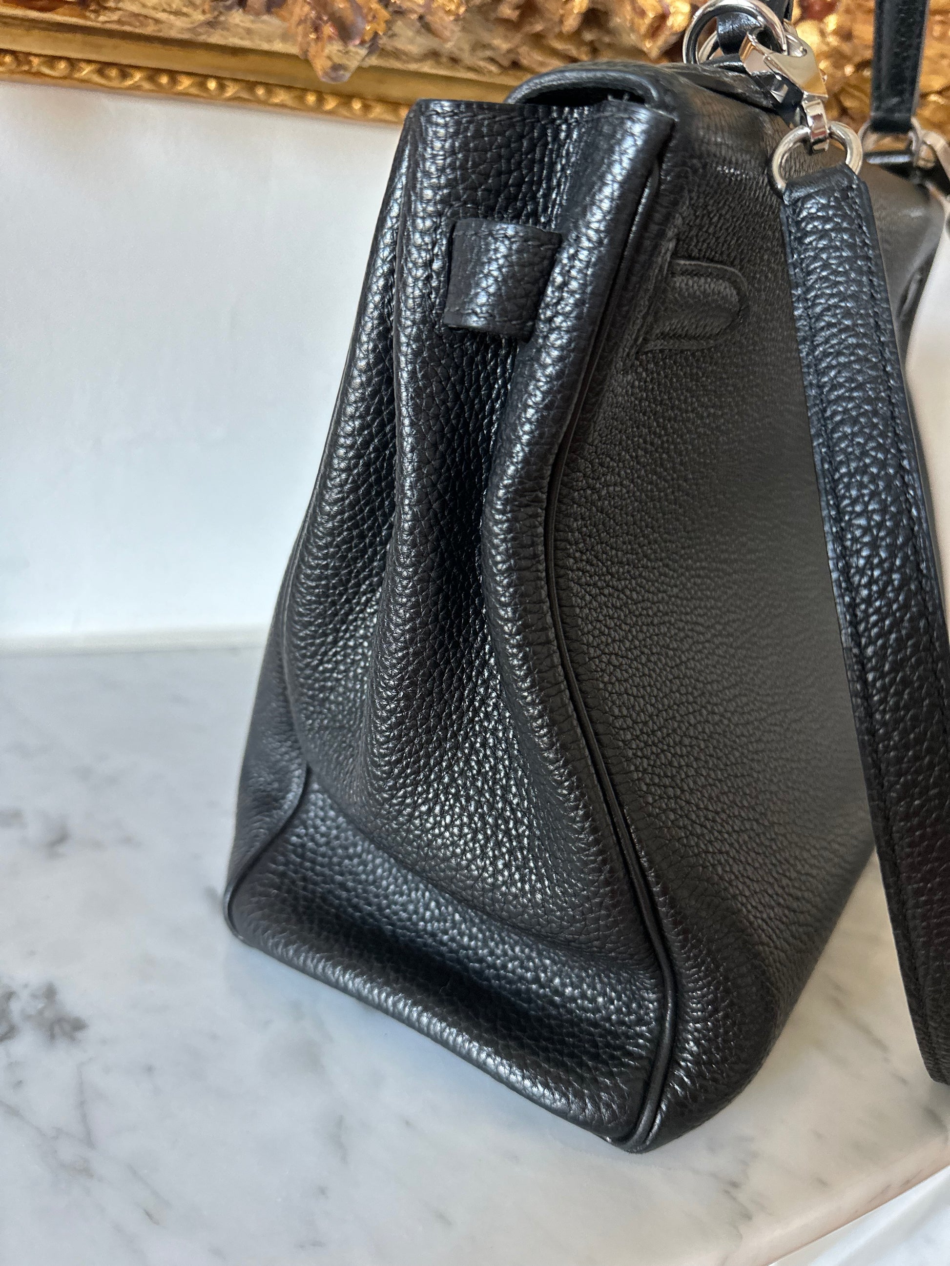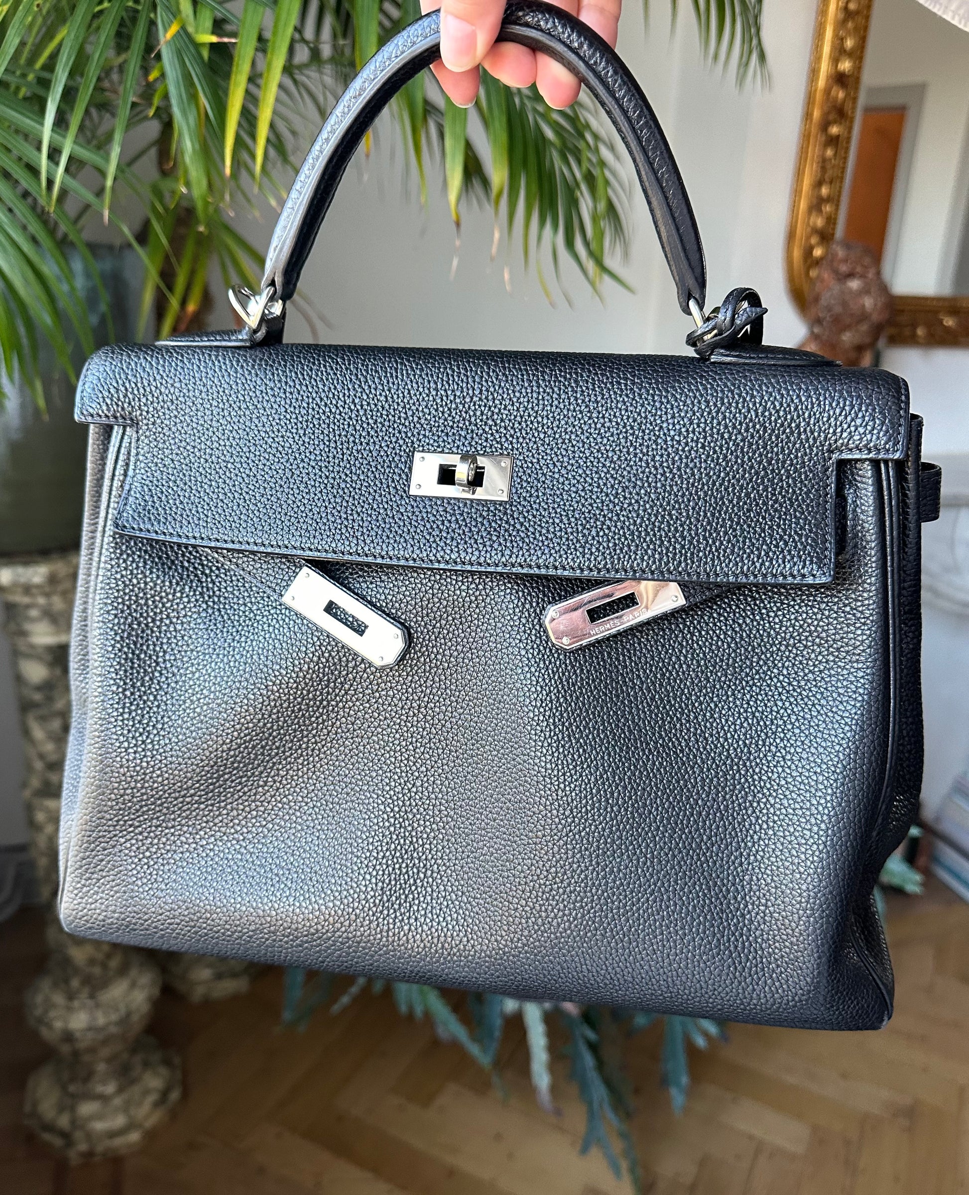 Gorgeous Hermès Kelly 32 bag in black Clemence leather (very similar to Togo) and Palladium hardware.