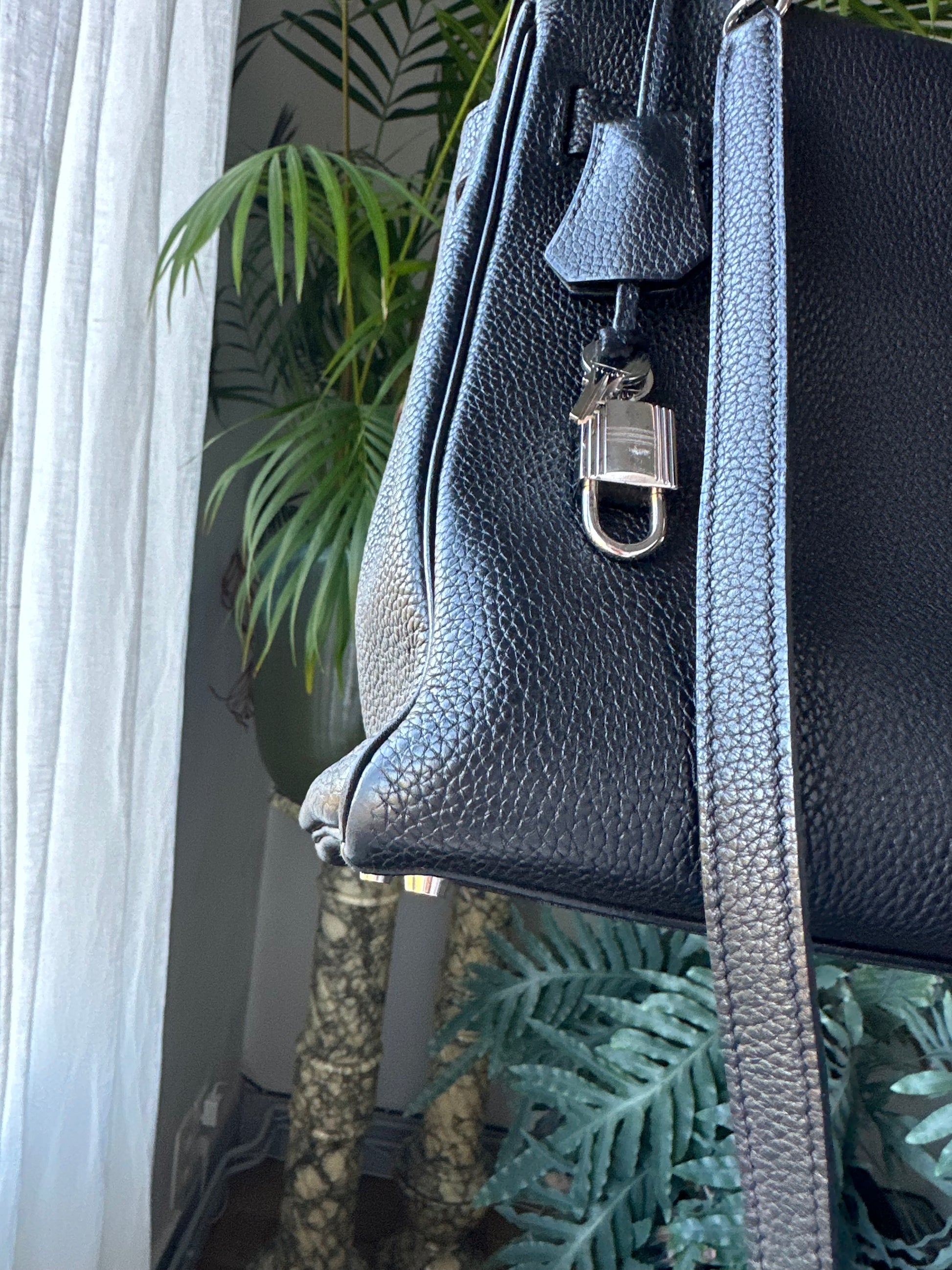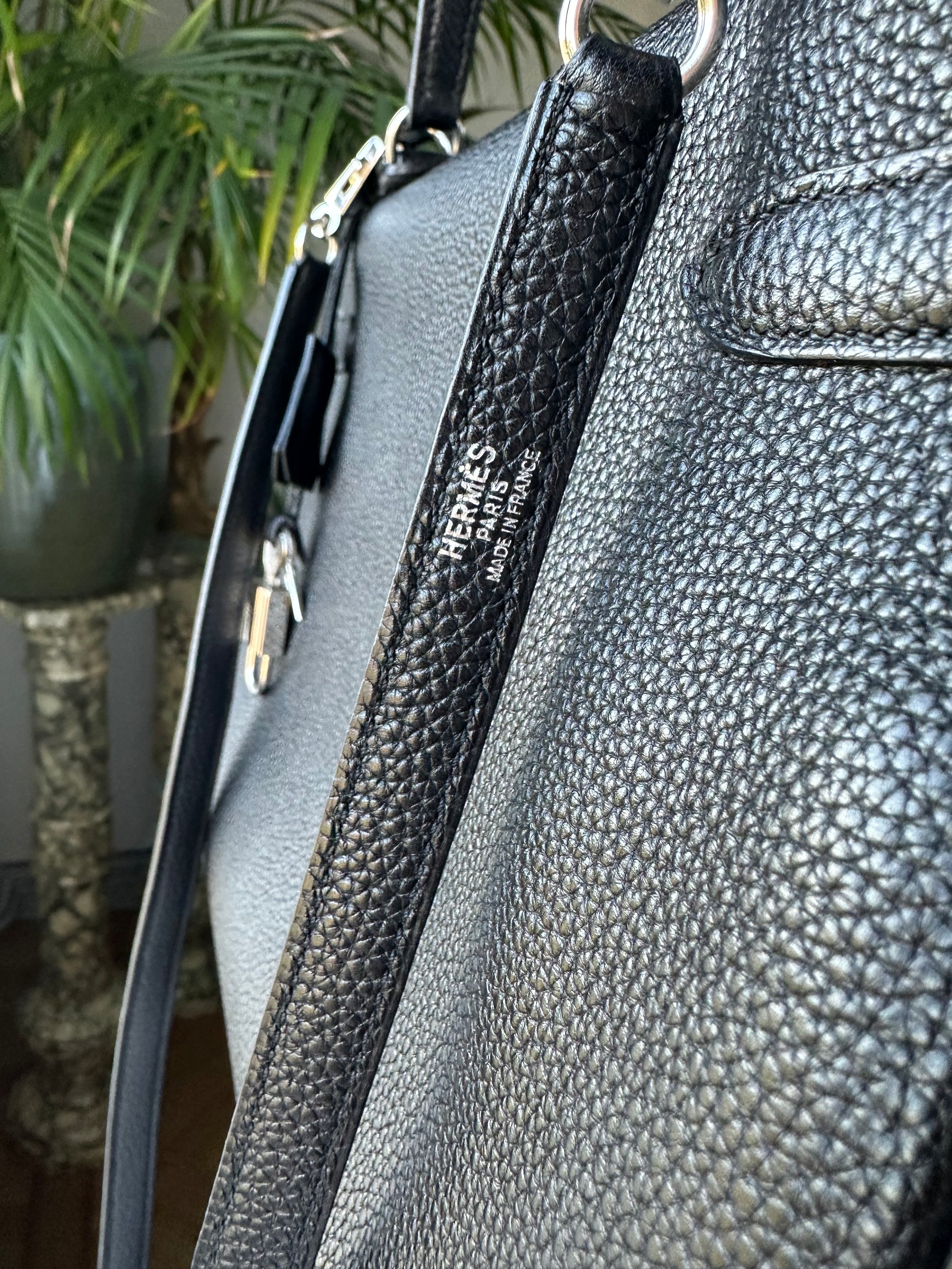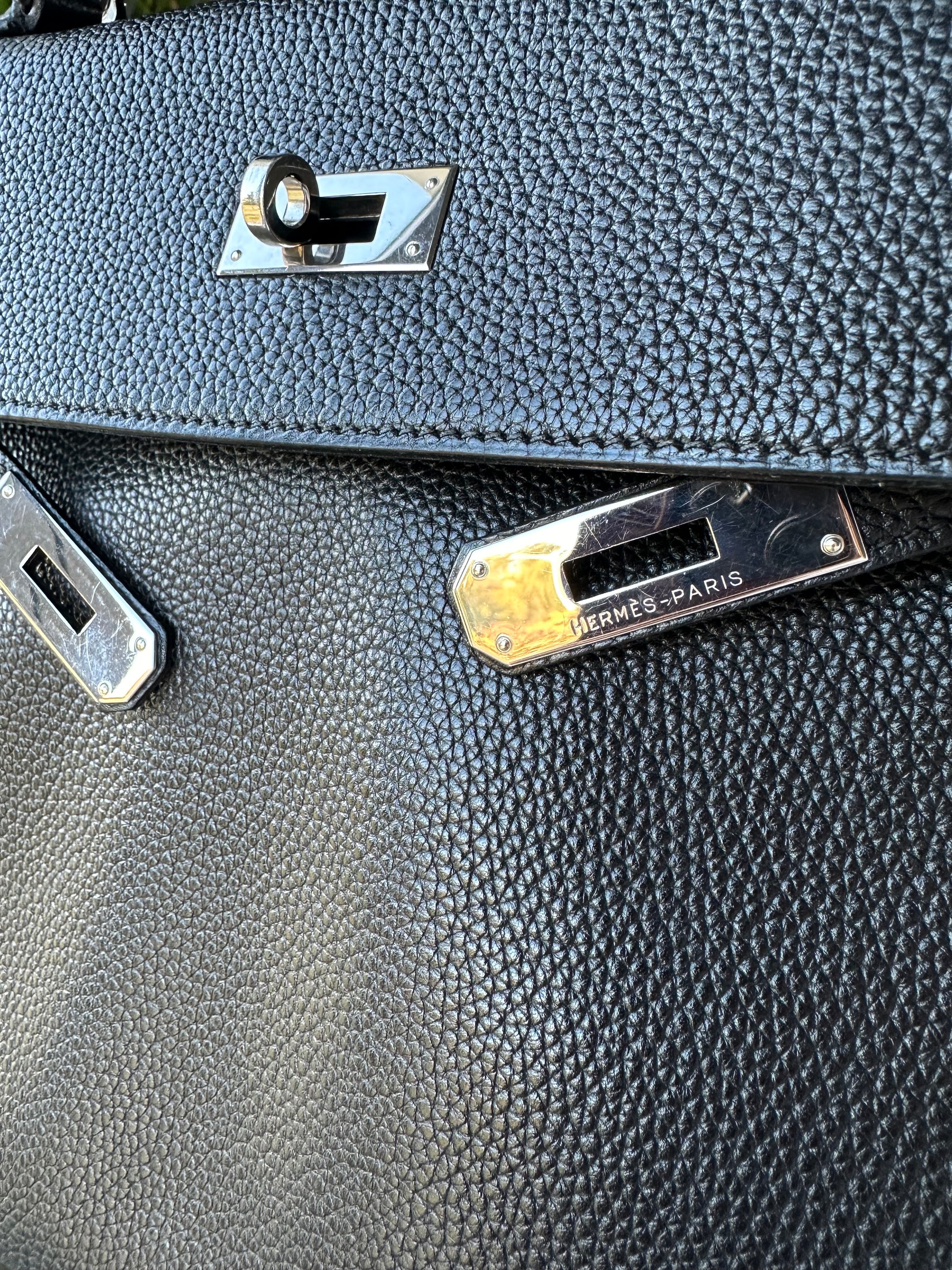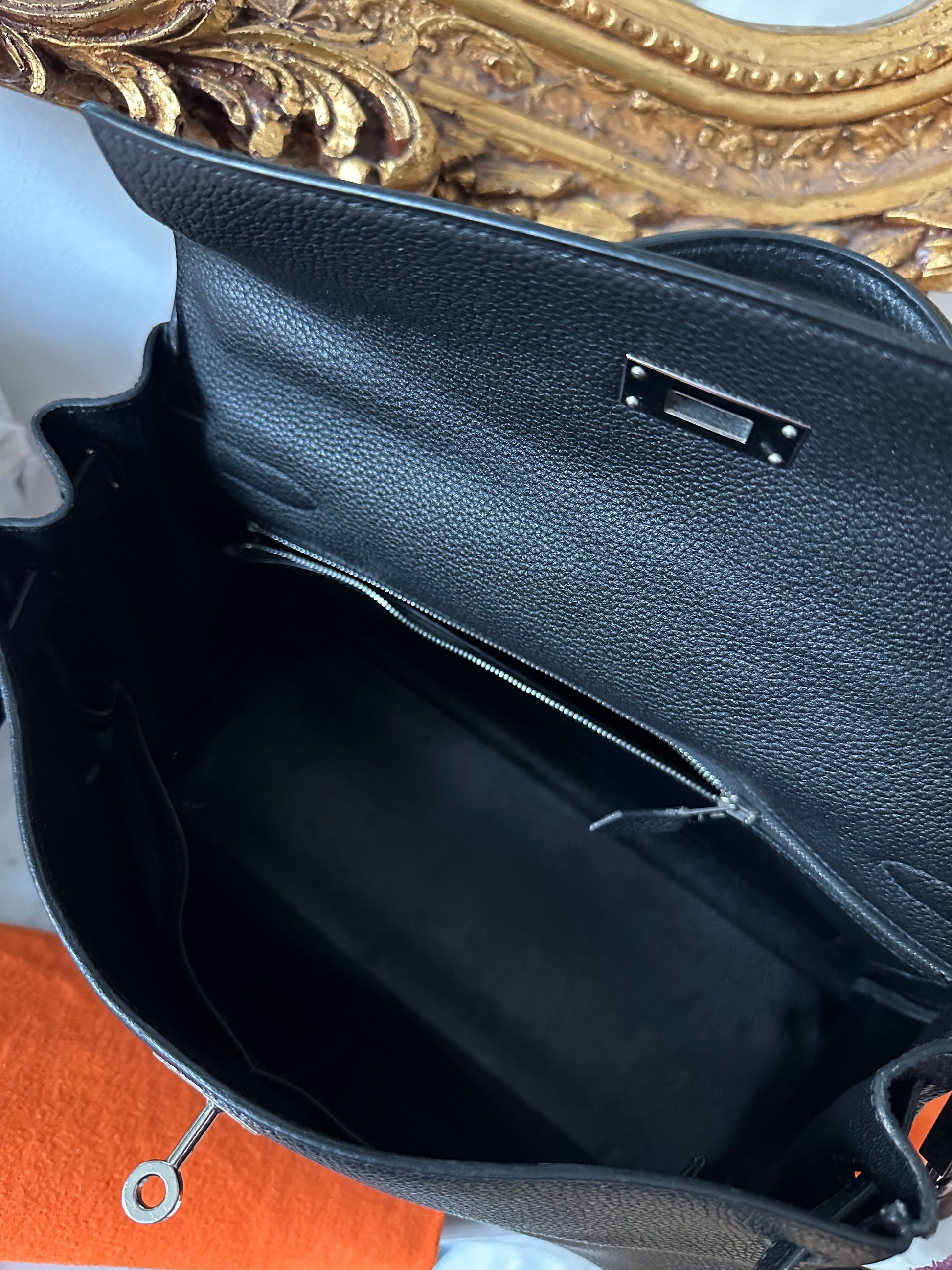 Gorgeous Hermès Kelly 32 bag in black Clemence leather (very similar to Togo) and Palladium hardware.