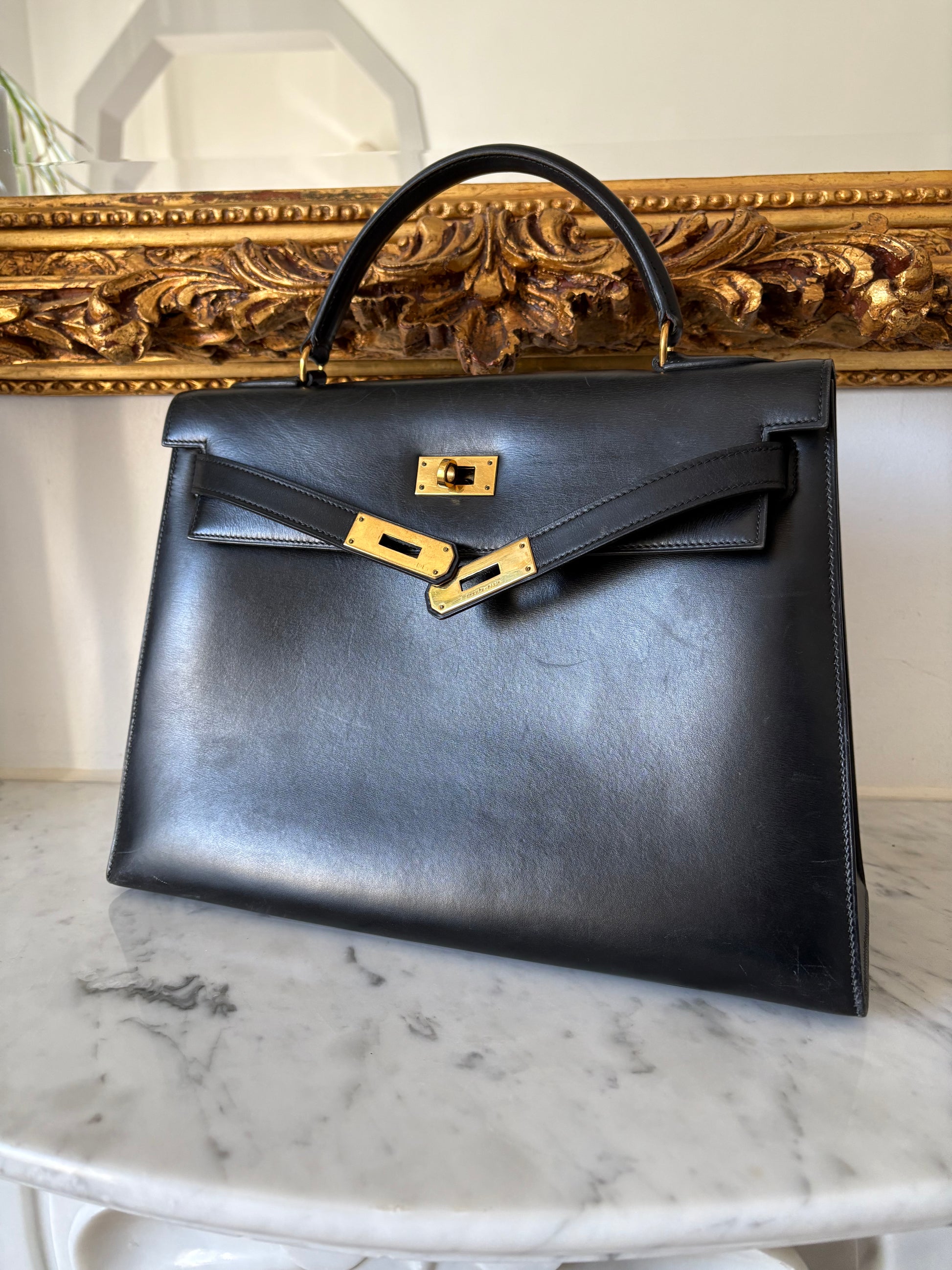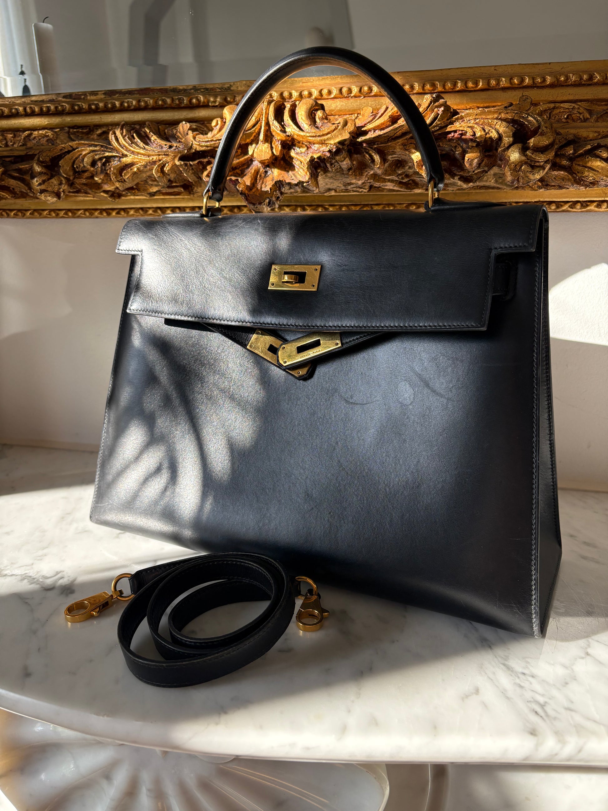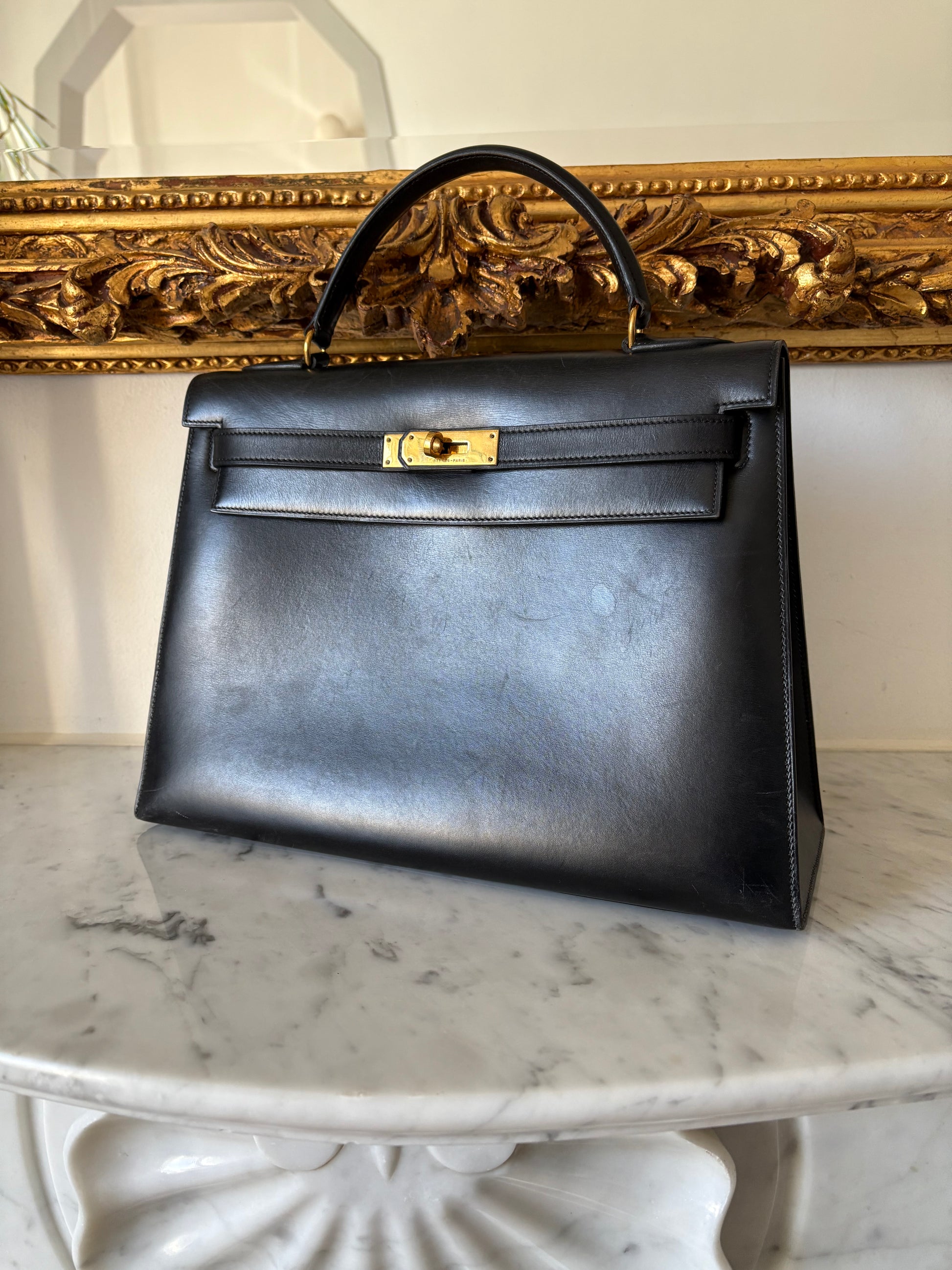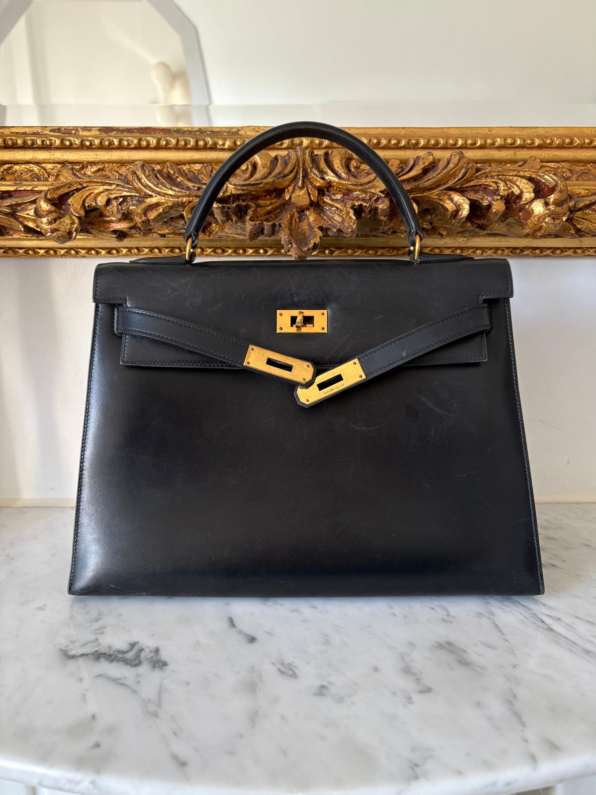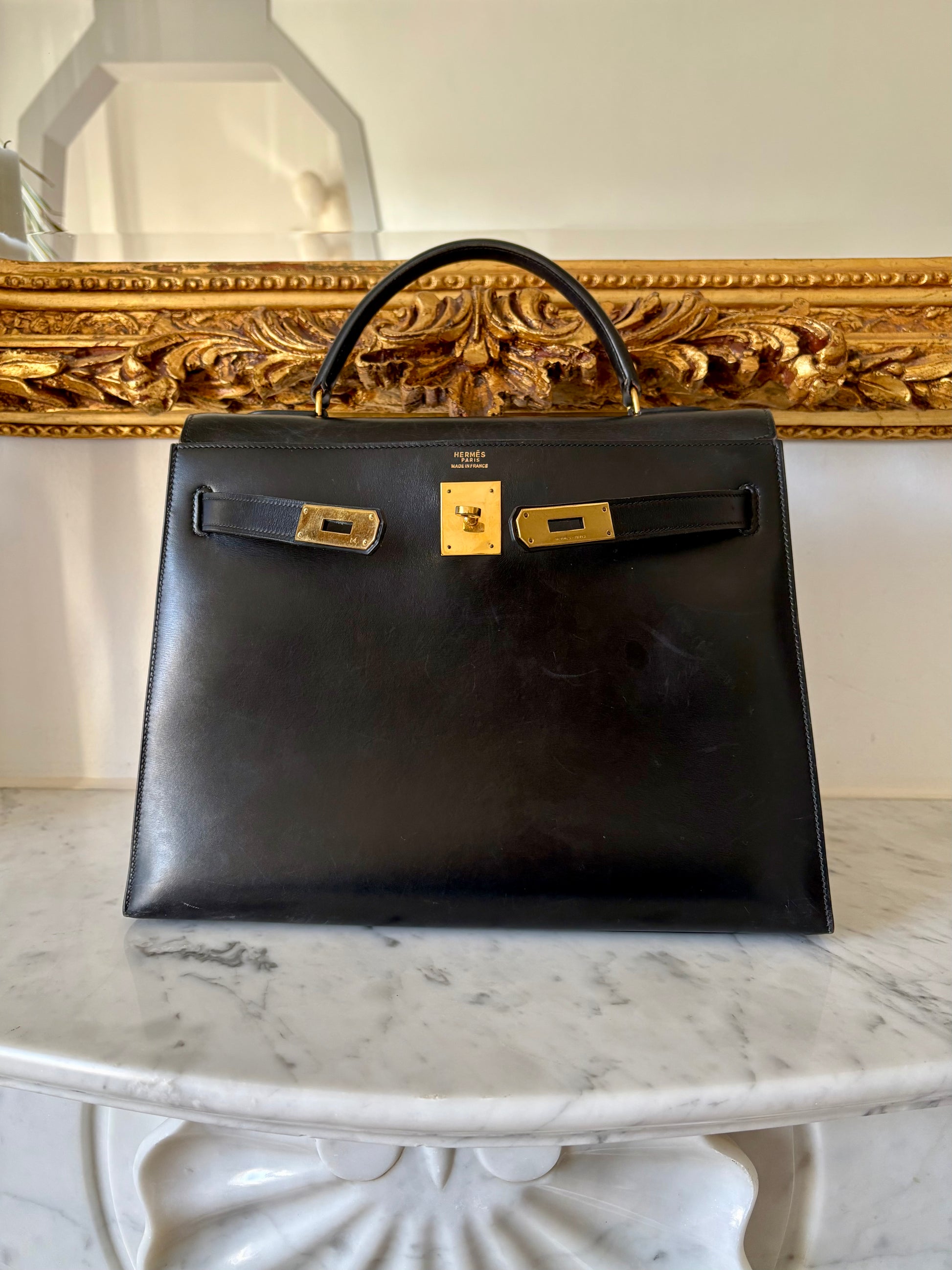 Hermès Kelly Sellier in size 32, black box leather, with gold hardware.