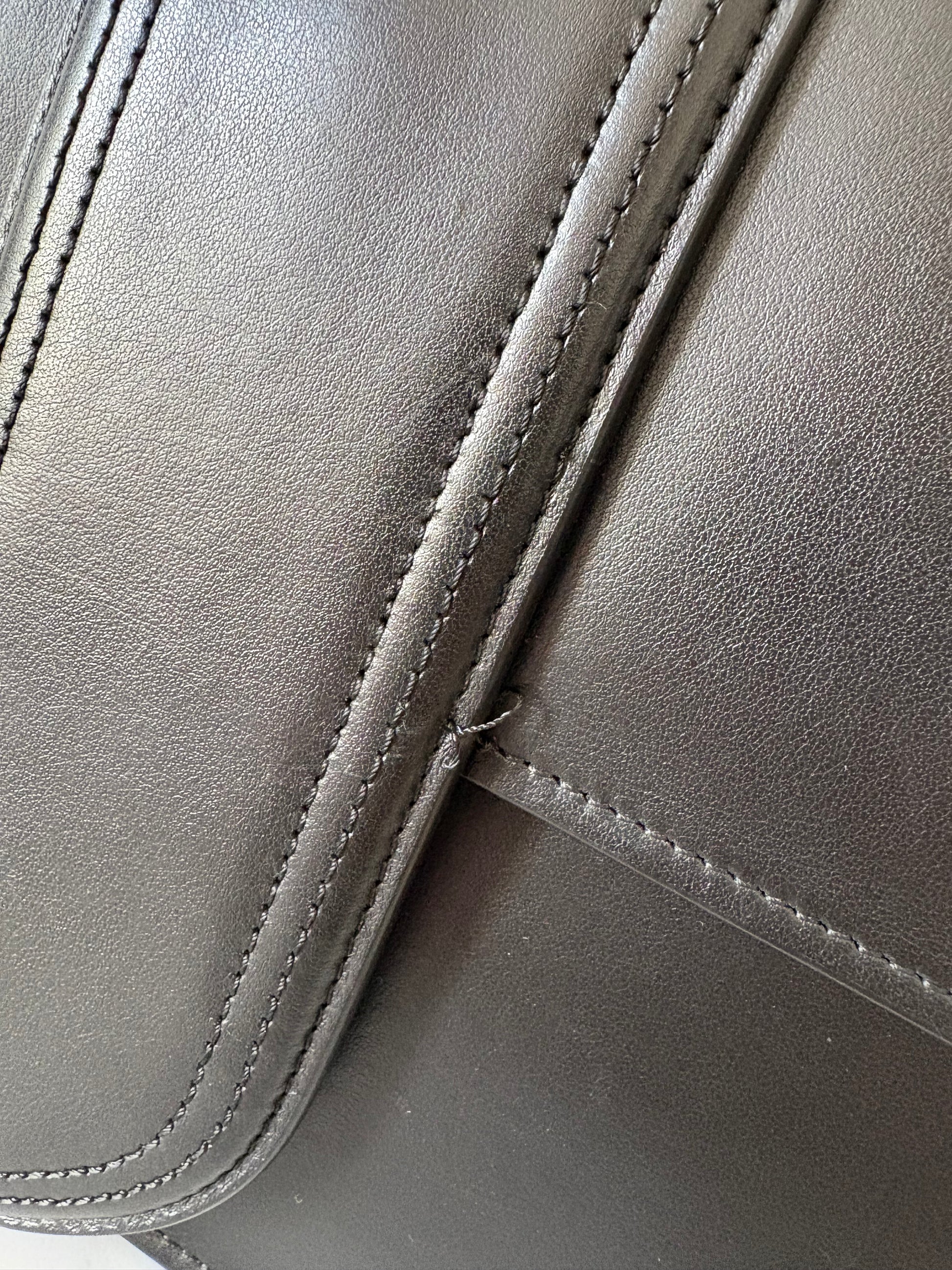 It is in very good condition, with only some minor surface scratches. One thing to note; there is a loose stitch on the front flap. This is not very noticeable and does not affect usage of the bag.