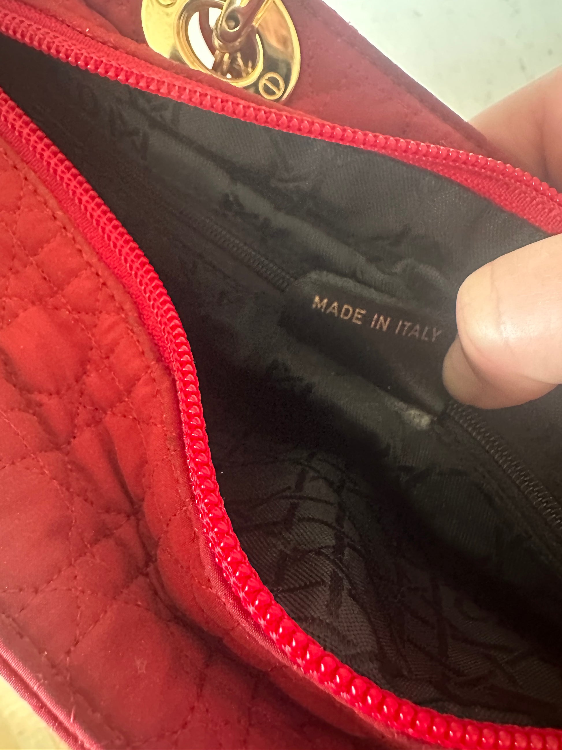 The bag is made out of nylon fabric, which is strong, durable and lightweight. The hardware is beautifully yellow gold and matches the red perfectly.
