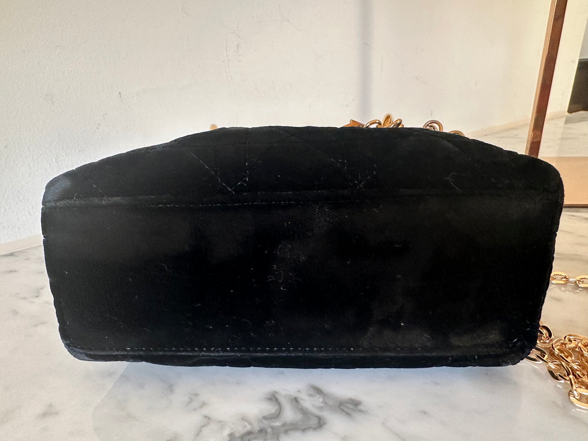 The bag is made out of luscious black velvet, patent leather and gold coloured hardware. The bag is in very good condition, both the velvet and the patent leather parts. The hardware shows some inevitable scratches, but is still beautifully gold.