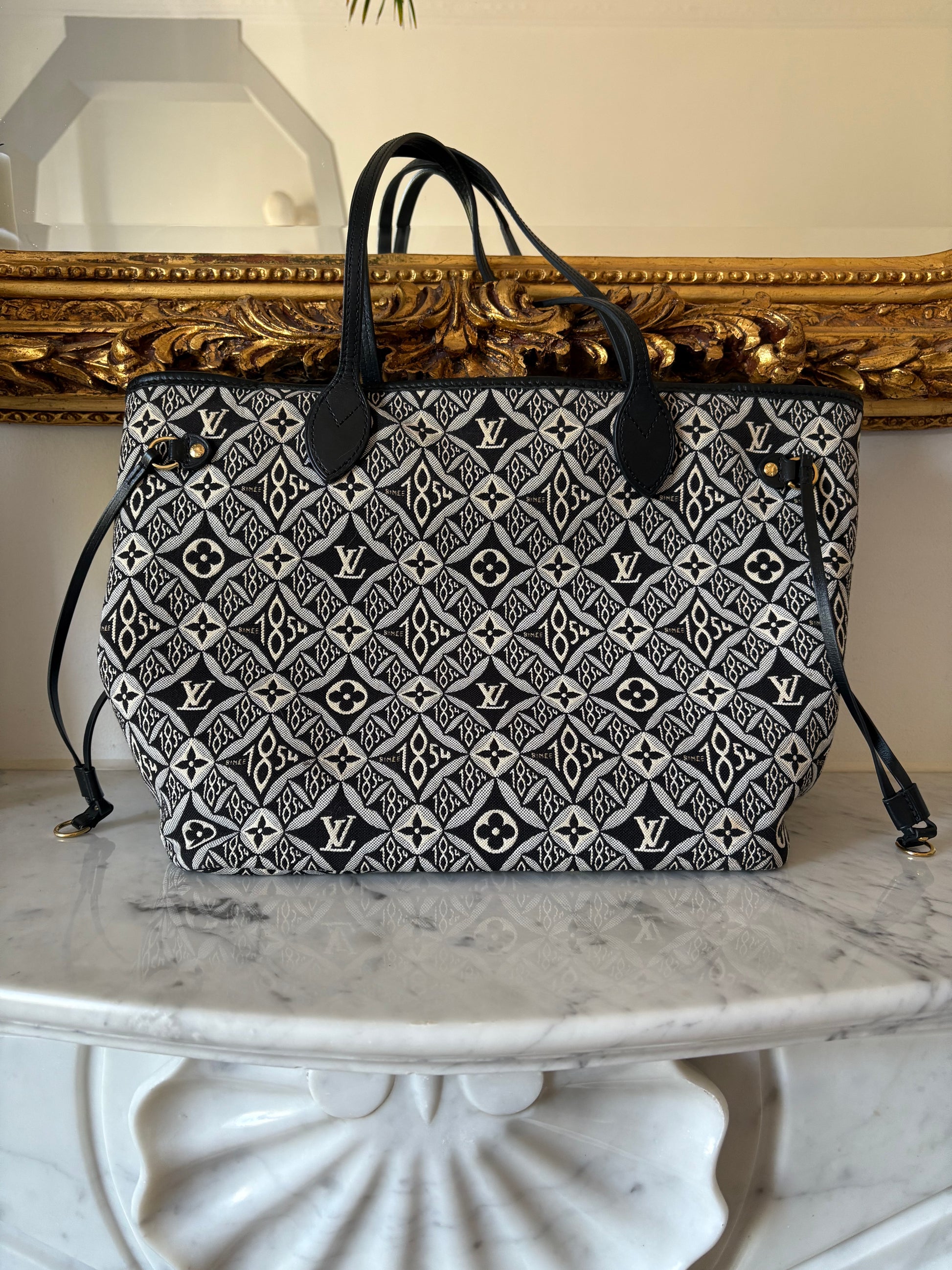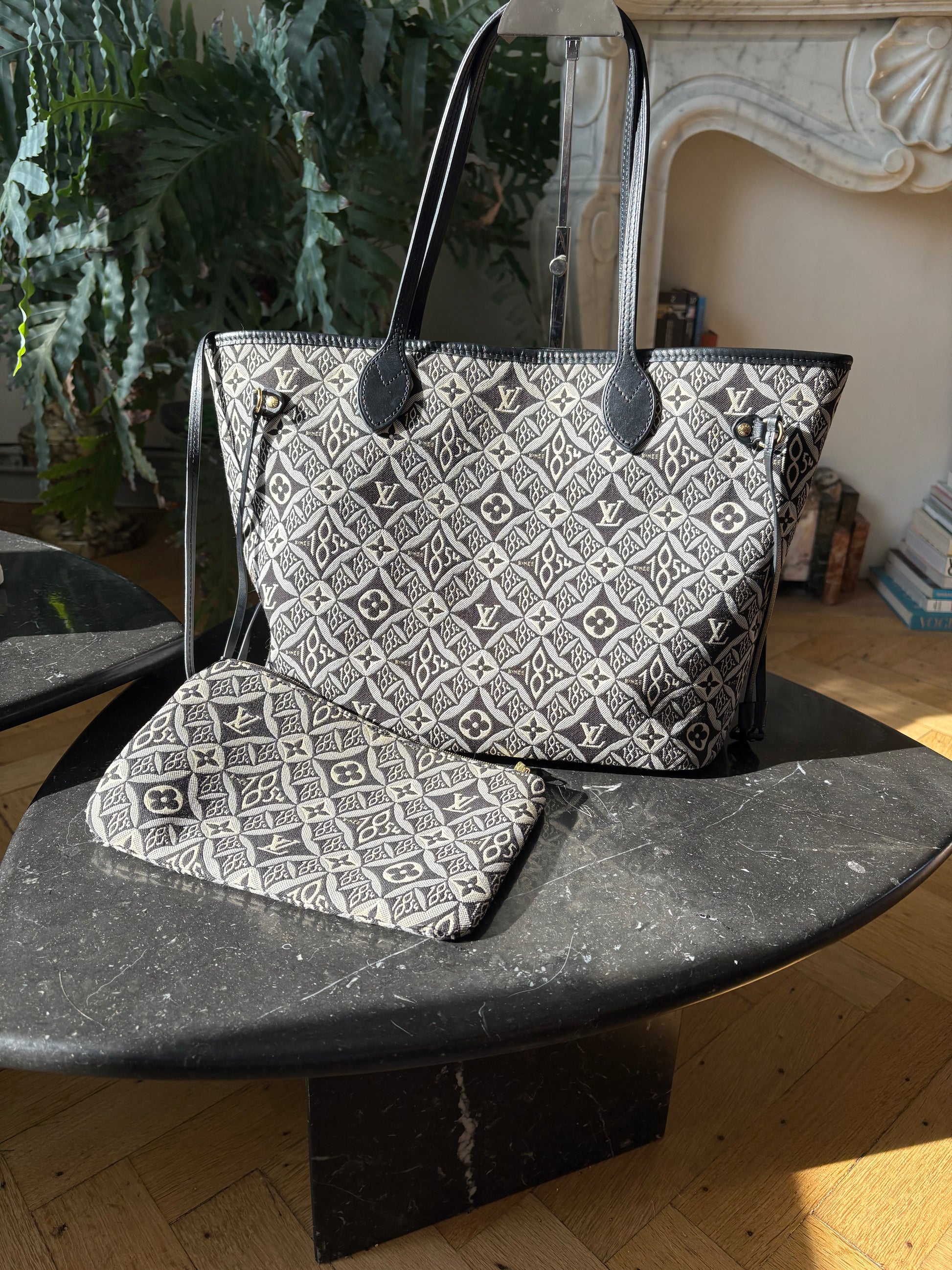 This is a black & white jacquard cotton Neverfull, in medium size. The bag is spacious, light and practical, especially with it’s removable inner pouch.