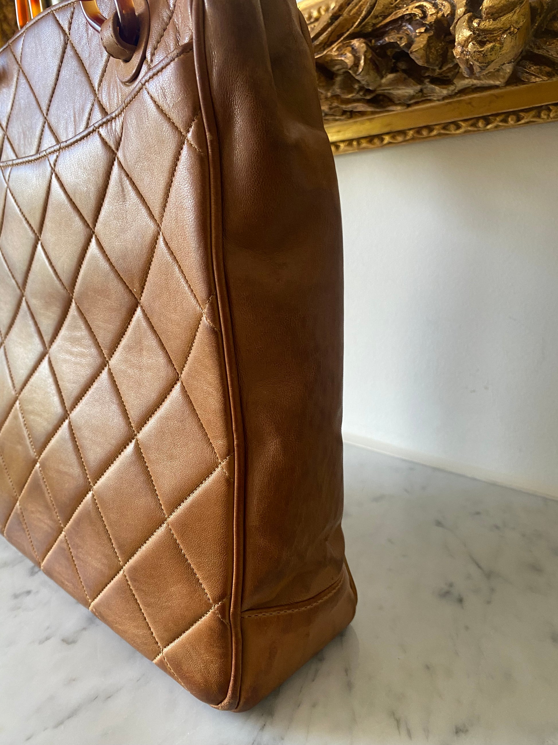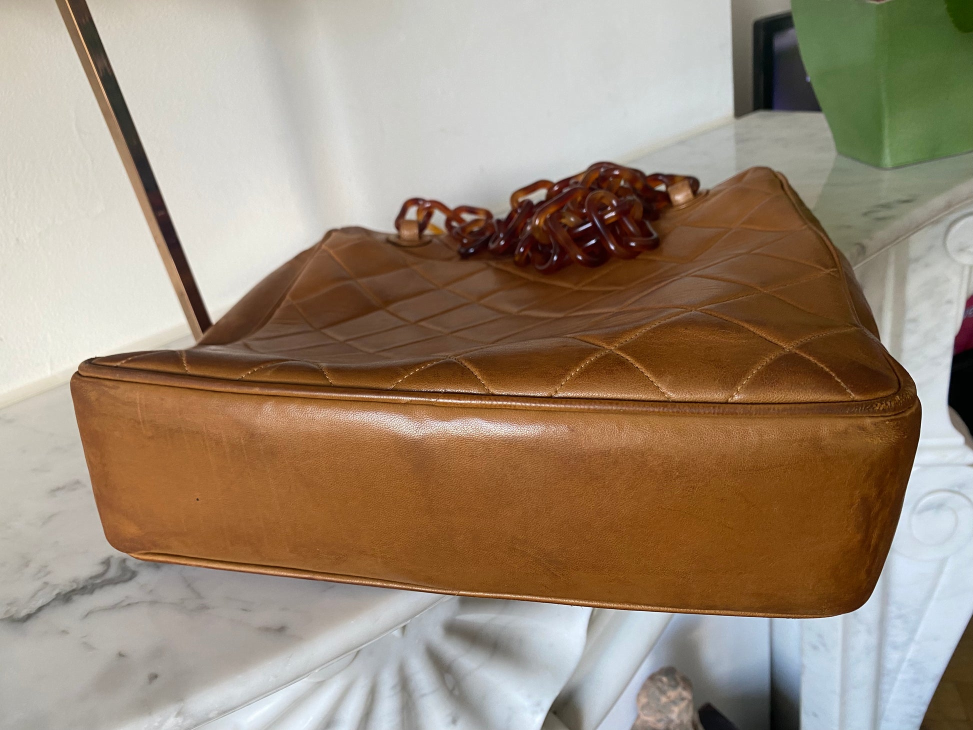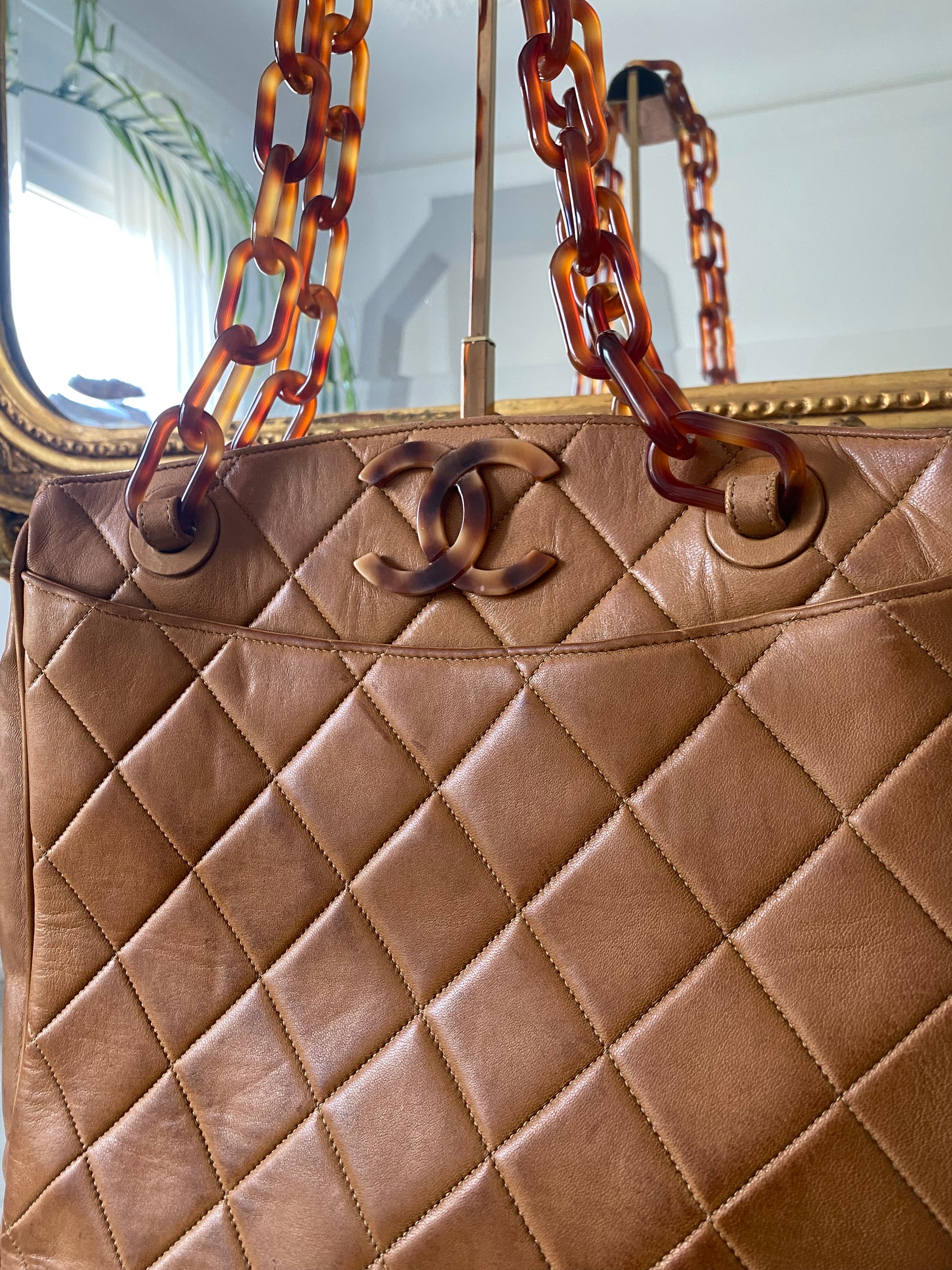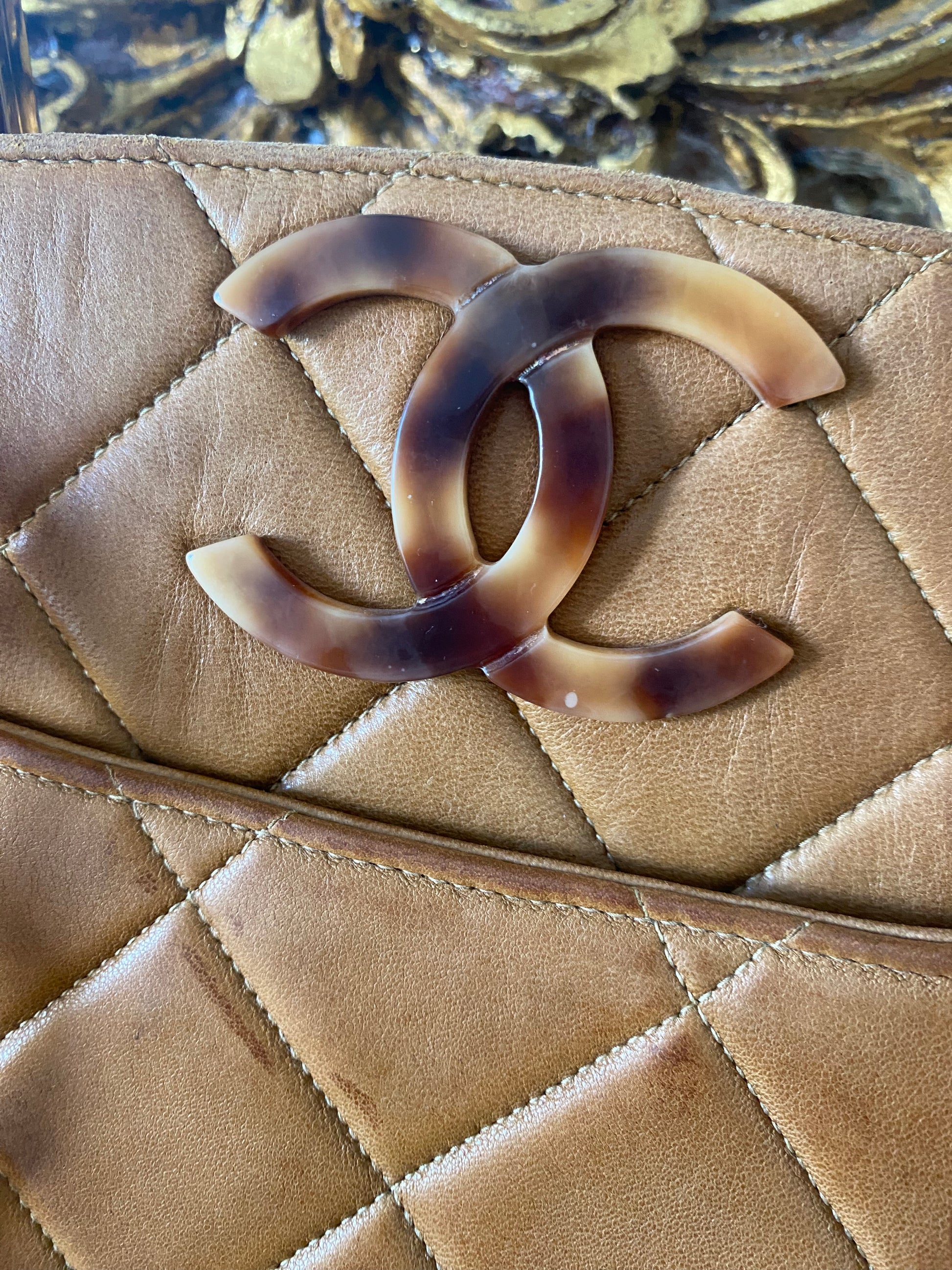 Beautiful Chanel tote in caramel beige lambskin leather and brown tortoise accents.