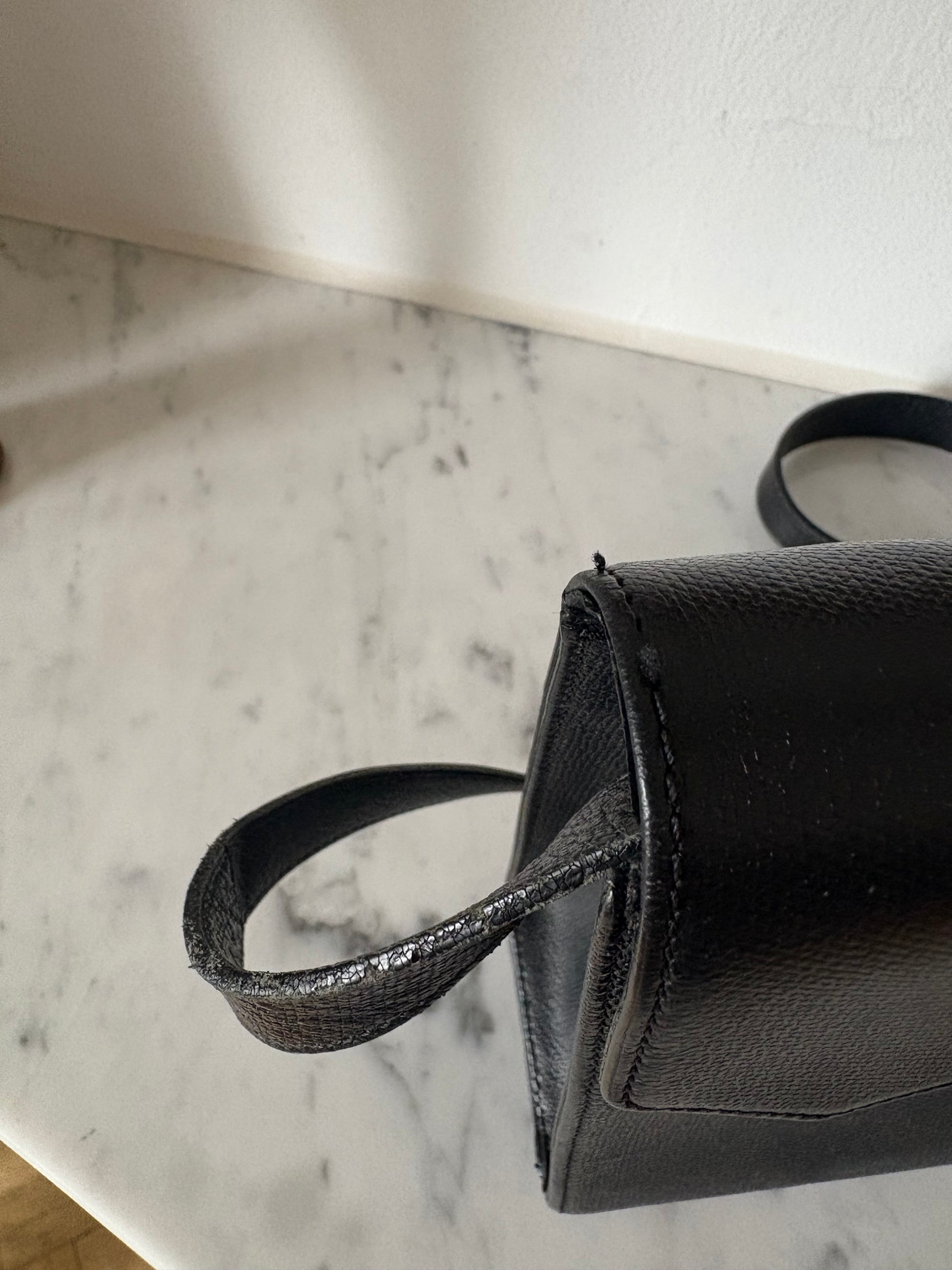 This bag is vintage and has been lovingly worn. The hardware has faded, making the logo look almost silver, and the leather shows some marks (although not very noticeable). There is a loose stitching on the top flap, which does not affect usage at all. Despite its small flaws, overall this is a super classy and timeless bag that has many, many more years left!